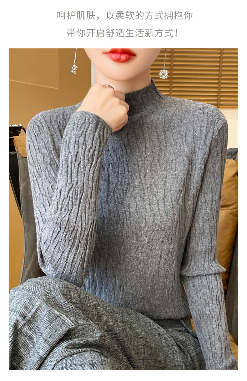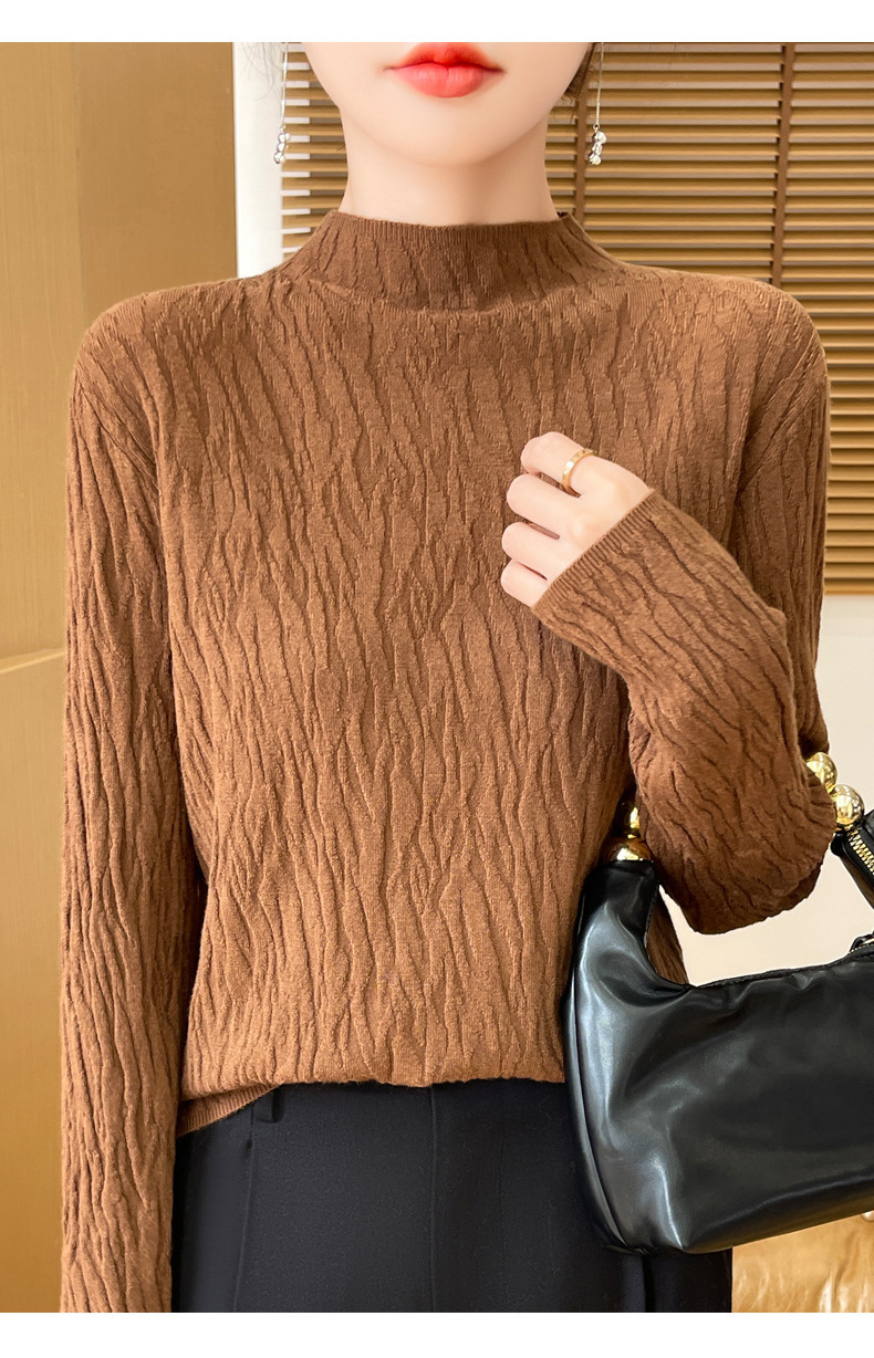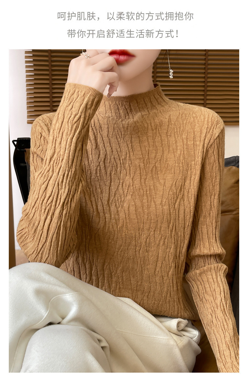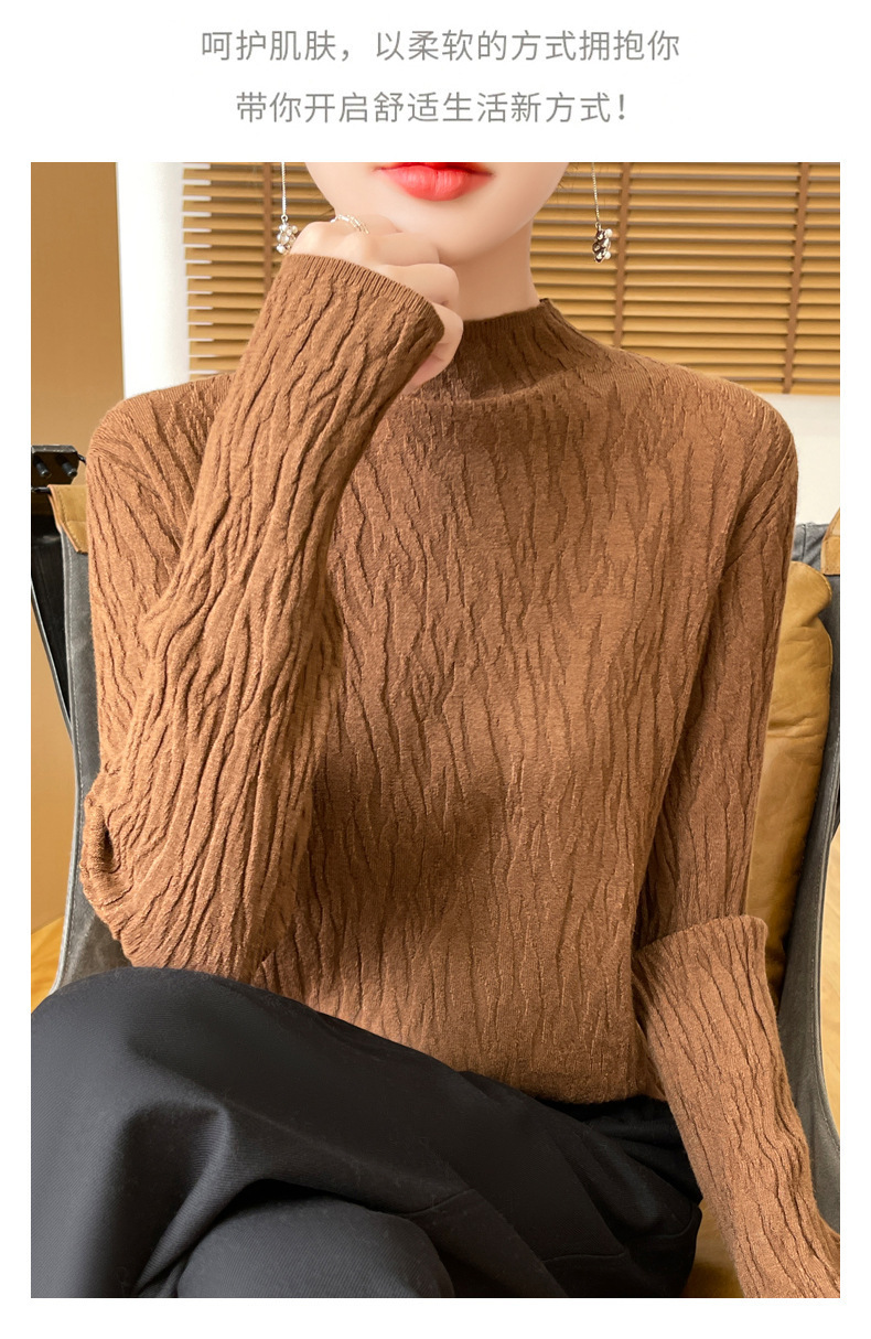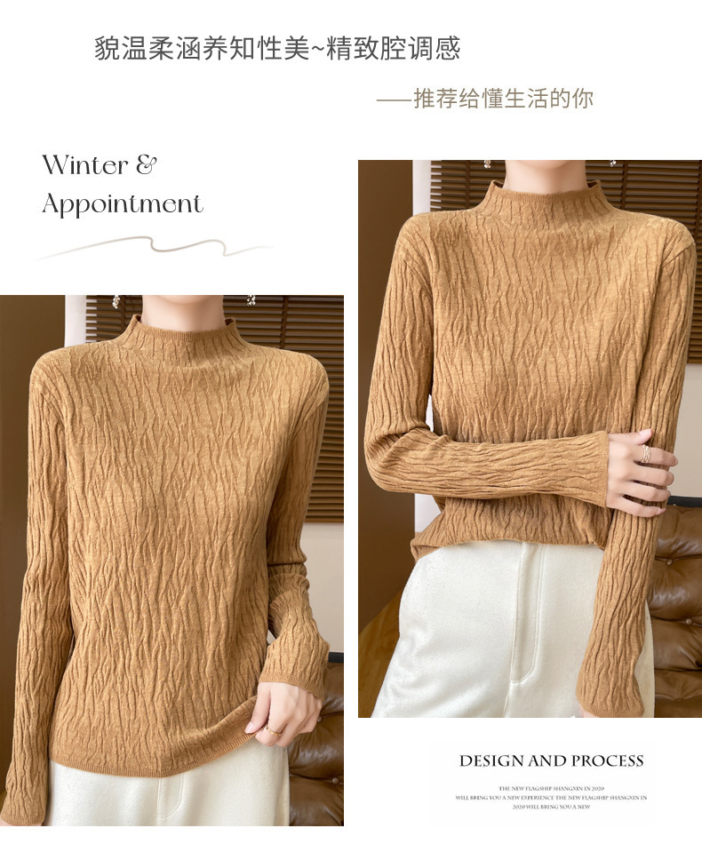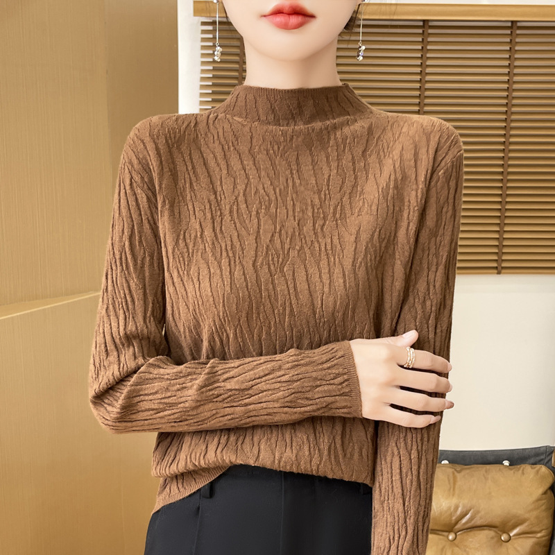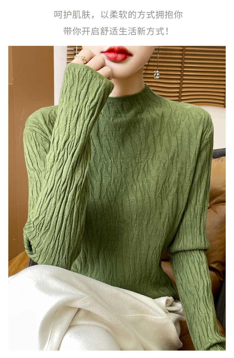 새로운 세미 하이 칼라 껍질 스펀 원사 니트베이스 셔츠 여성 솔리드 컬러 긴 소매 캐주얼 단순 루즈베이스스토어 가기
