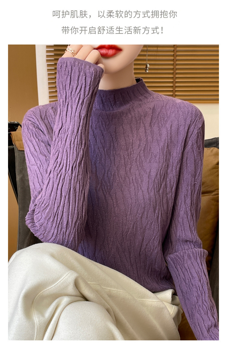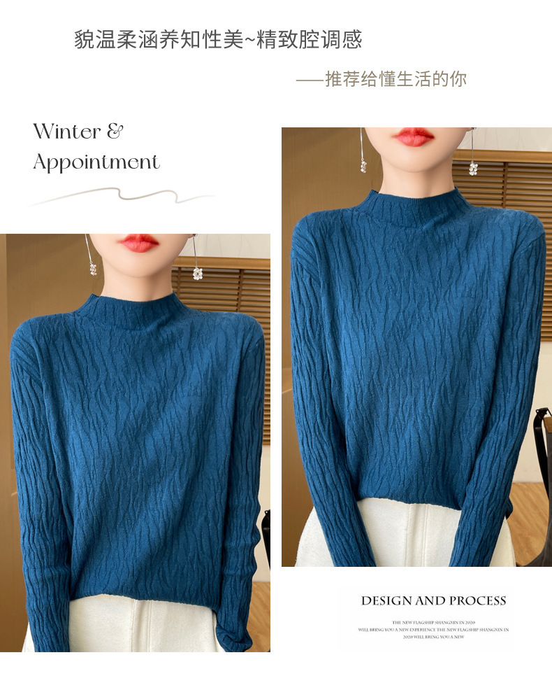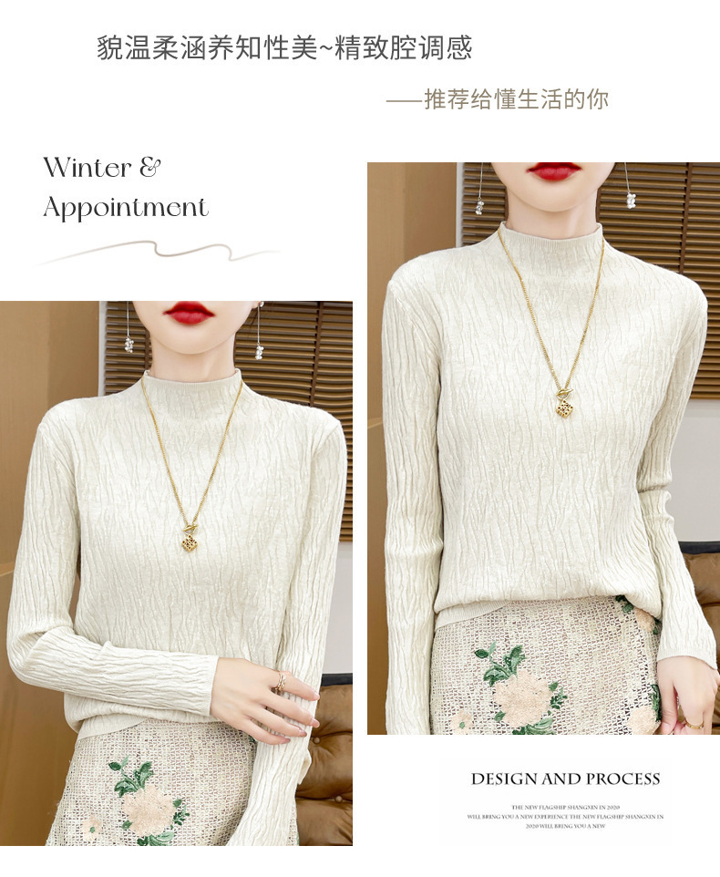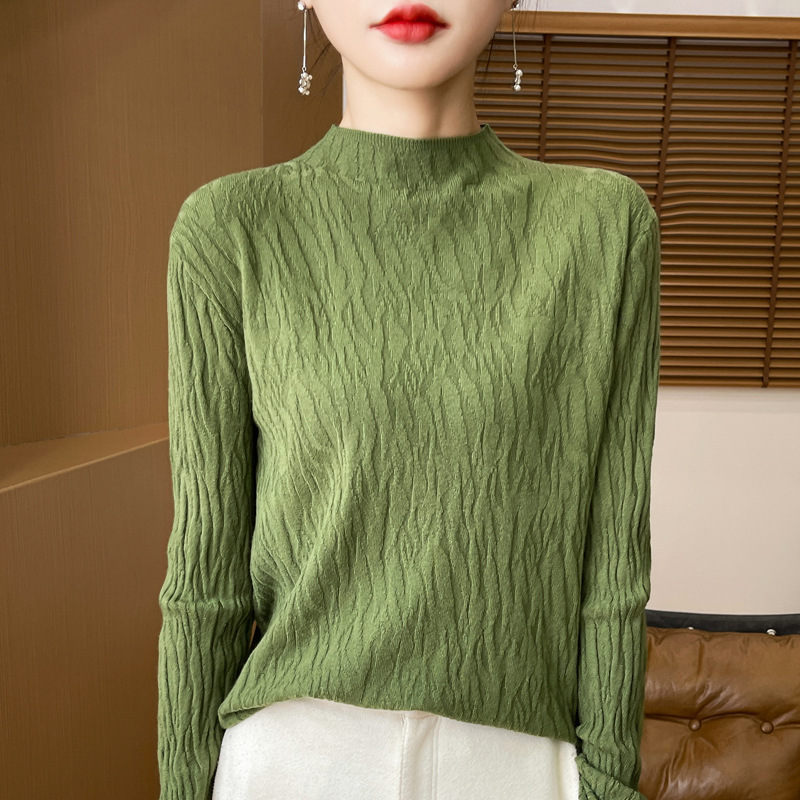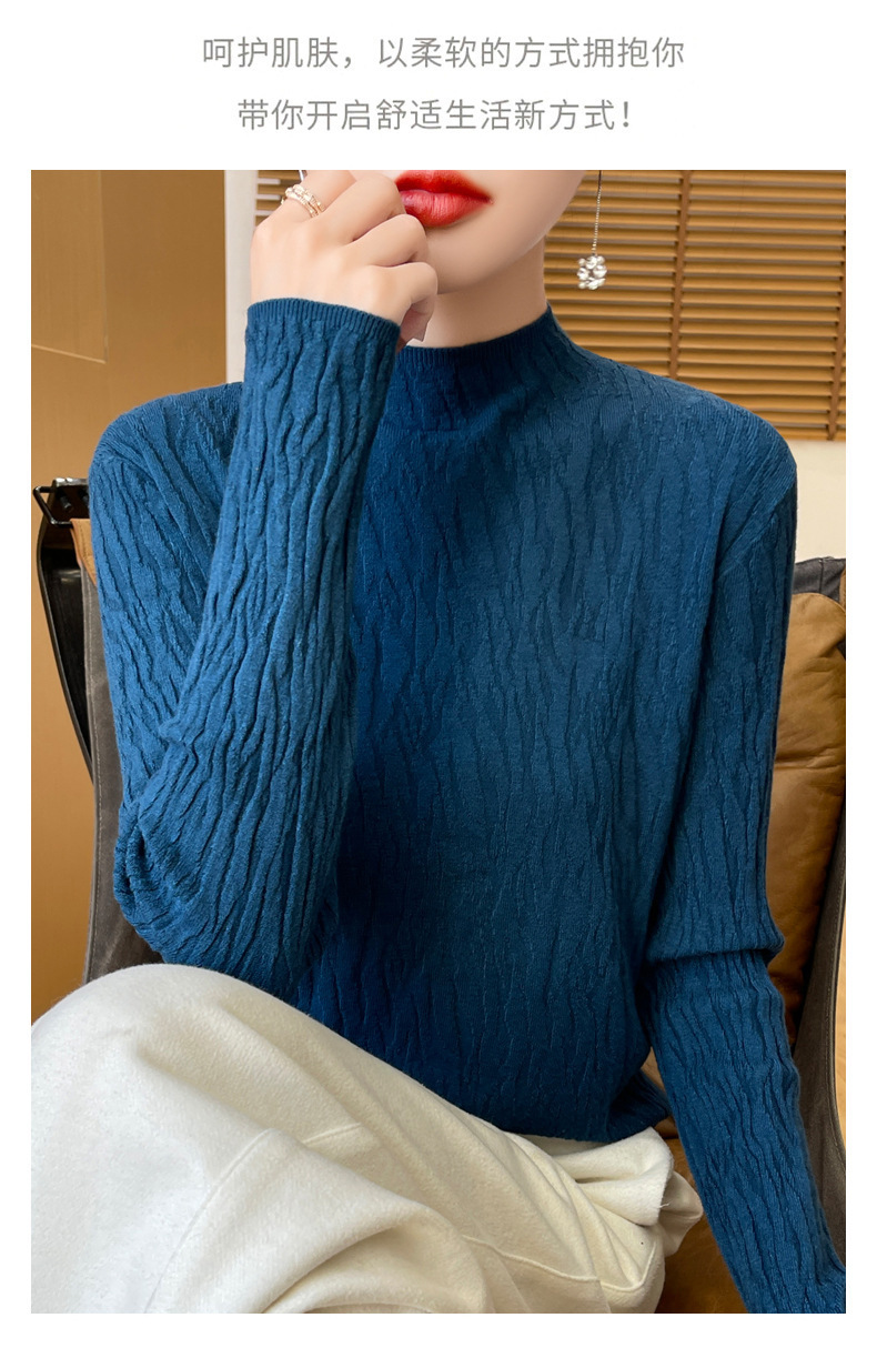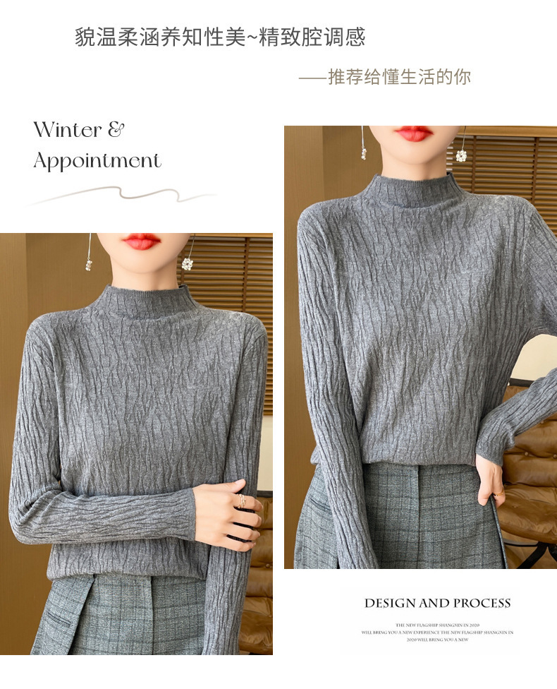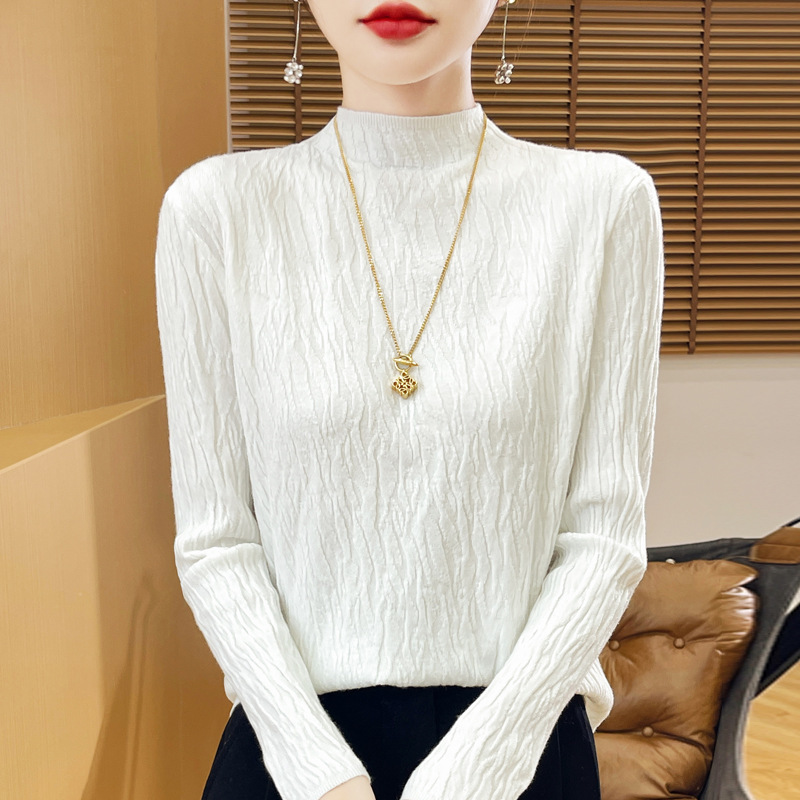새로운 세미 하이 칼라 껍질 스펀 원사 니트베이스 셔츠 여성 솔리드 컬러 긴 소매 캐주얼 단순 루즈베이스스토어 가기
