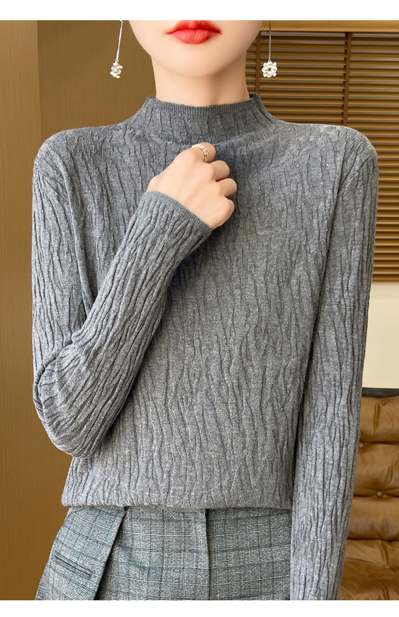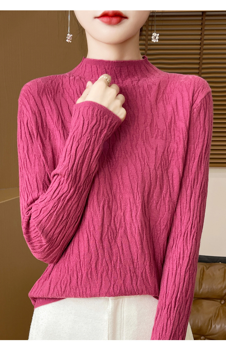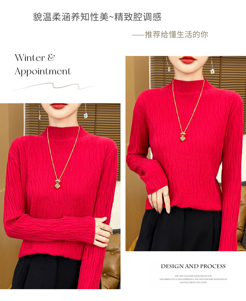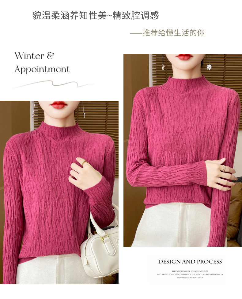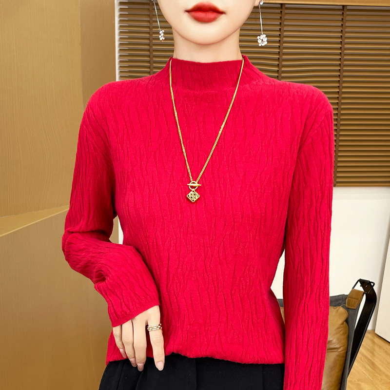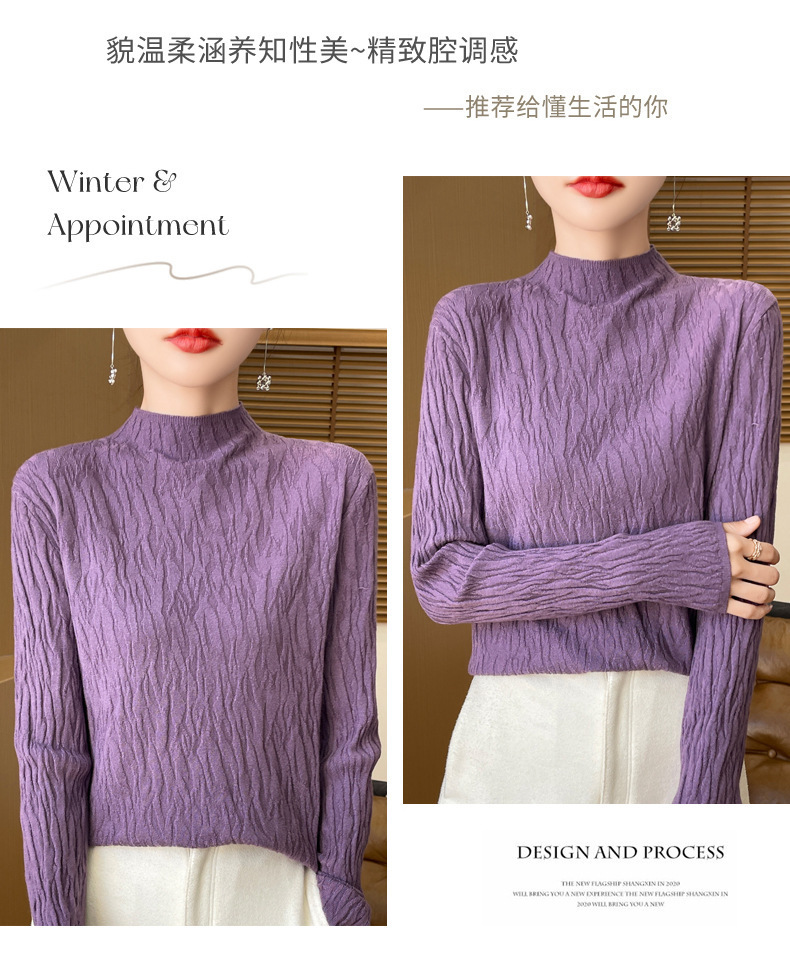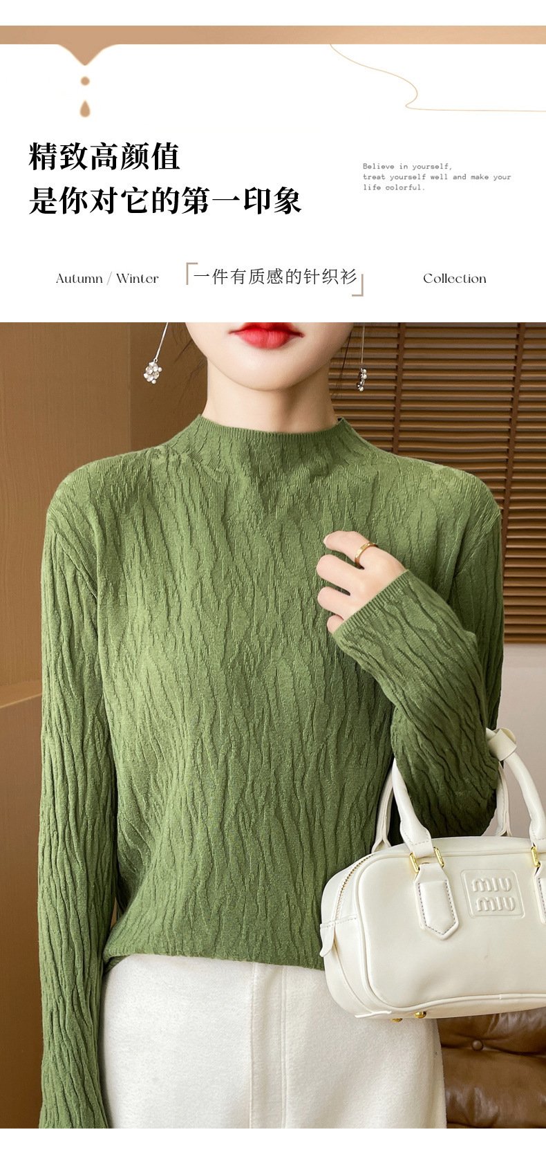 새로운 세미 하이 칼라 껍질 스펀 원사 니트베이스 셔츠 여성 솔리드 컬러 긴 소매 캐주얼 단순 루즈베이스스토어 가기