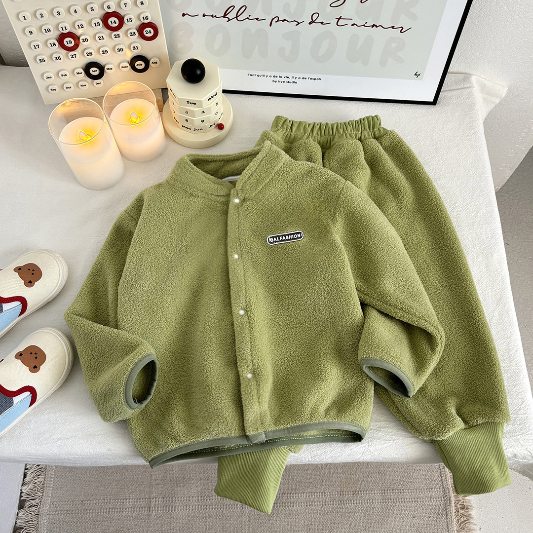 가을, 겨울 새로운 어린이 정장 스탠드 칼라 양면 양털 스웨터 한국 스타일 두꺼운 재킷과 바지 소년과 소녀를위한 투피스 세트