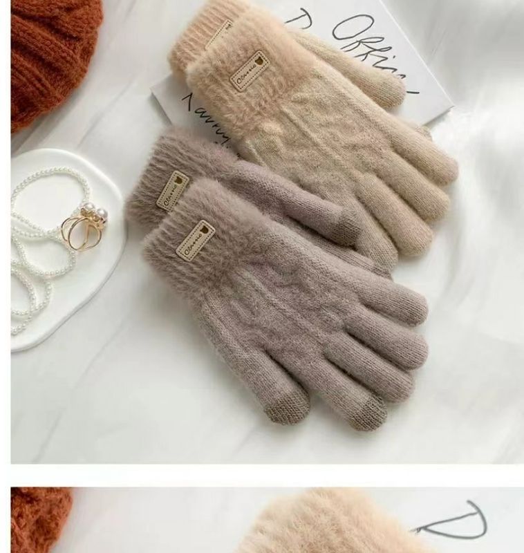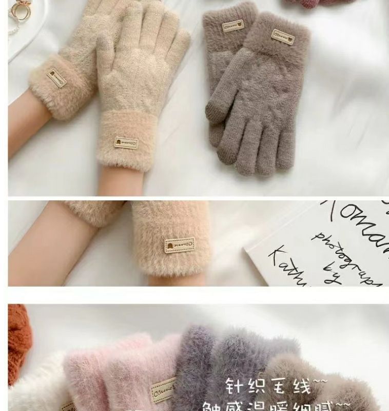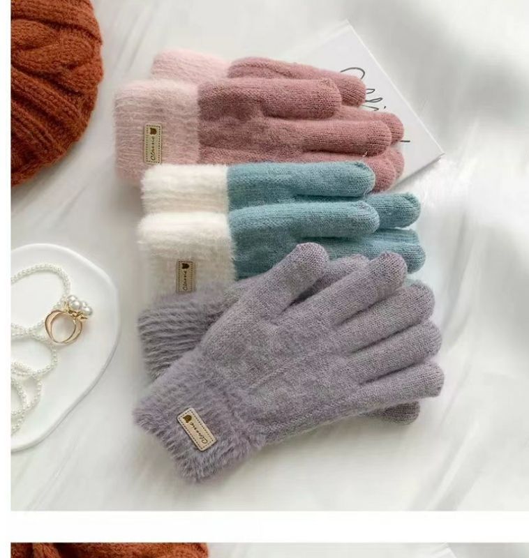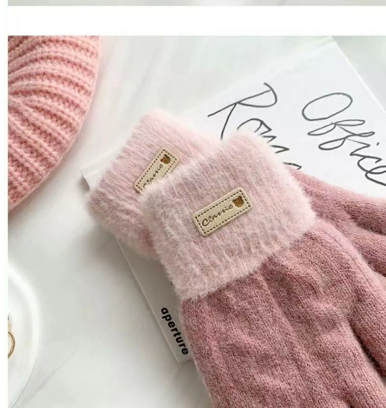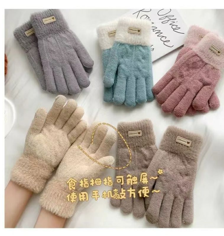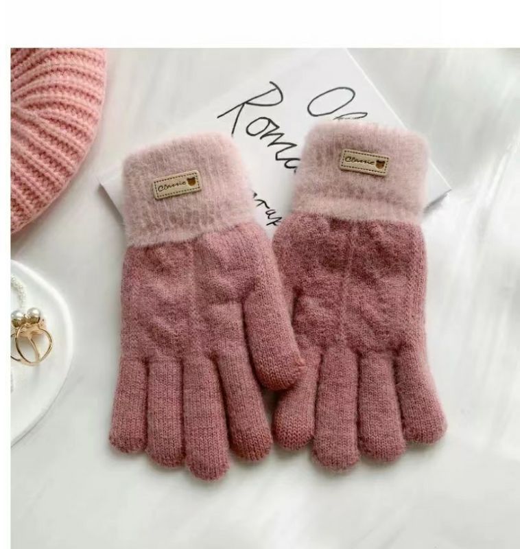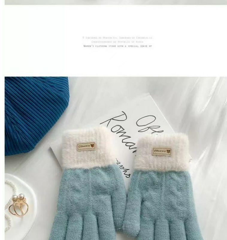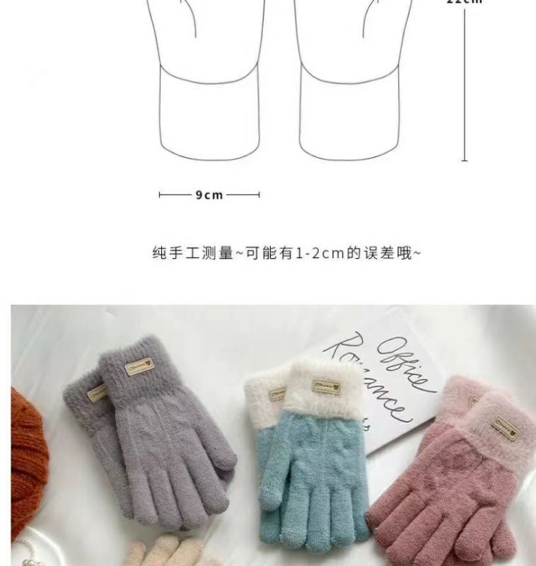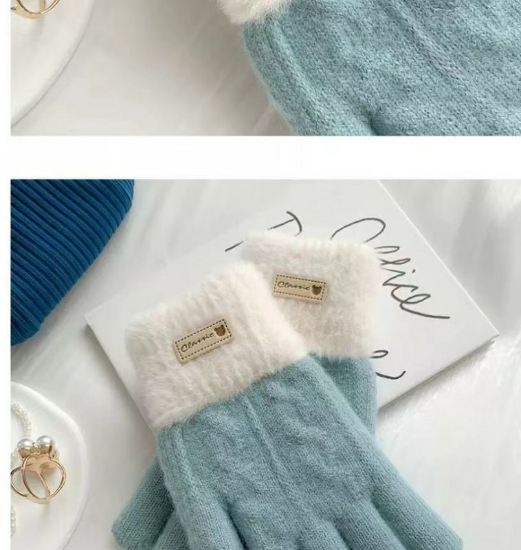 귀여운 컬러 매칭 봉제 니트 양모 5 인조 장갑 여성 가을 겨울 한국식 올매치 기모 두꺼운 따뜻한 터치 스크린