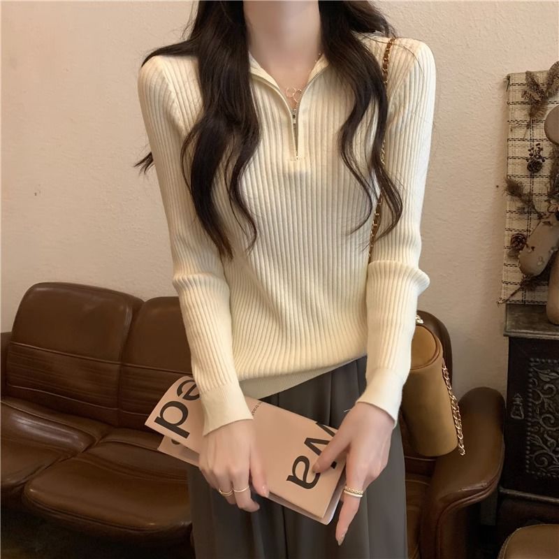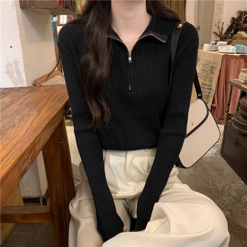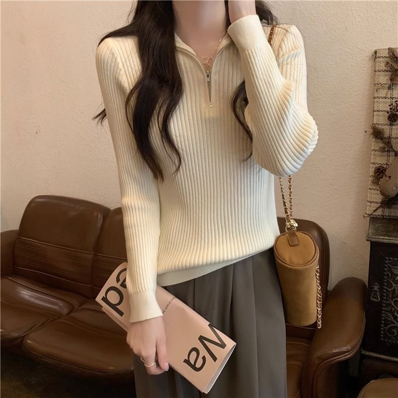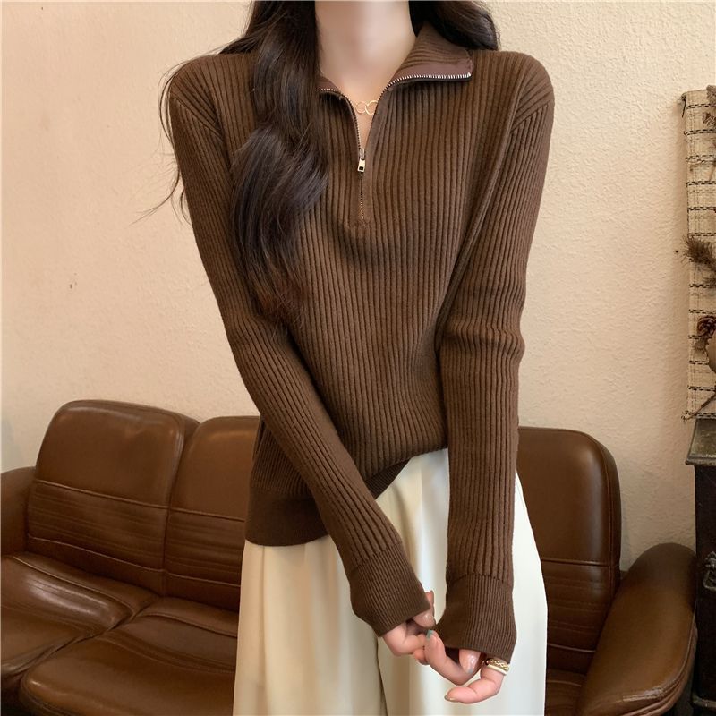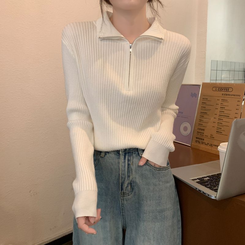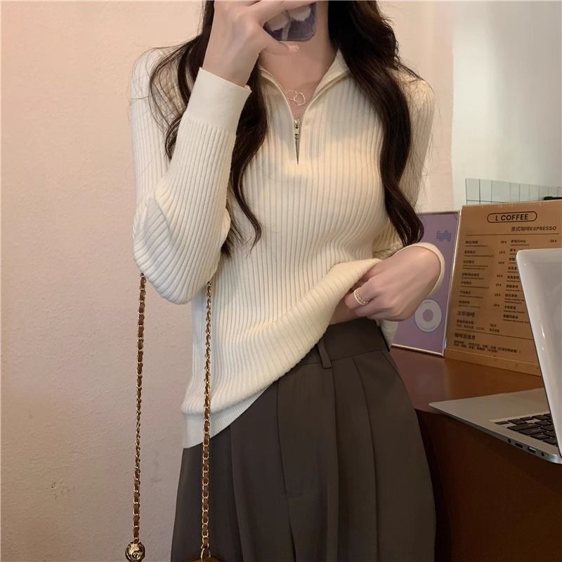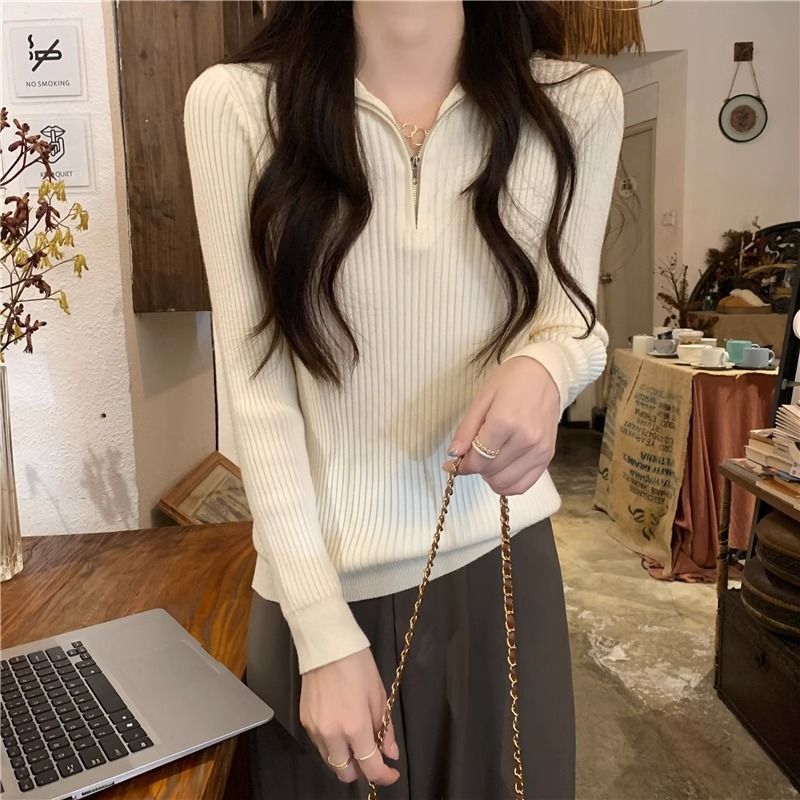 가을과 겨울 새 옷깃 긴팔베이스 니트 스웨터 탑 서양식 프랑스 하이 엔드 지퍼 스웨터 여성용스토어 가기