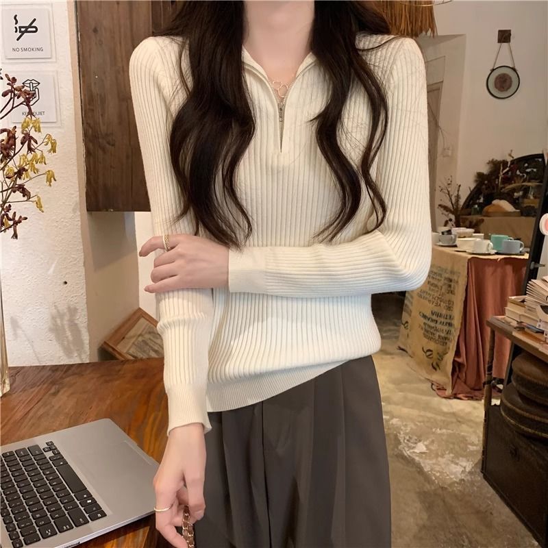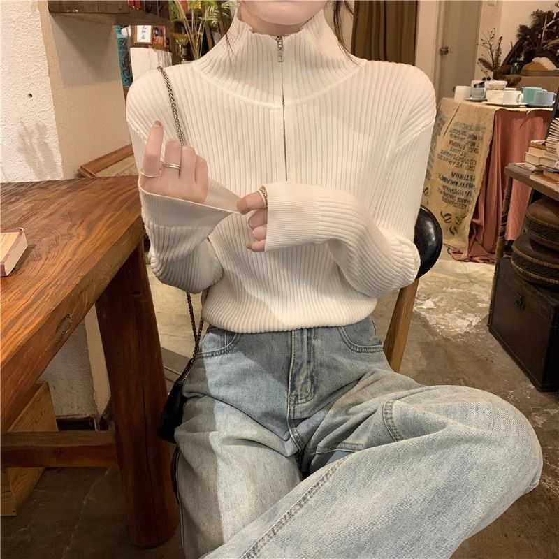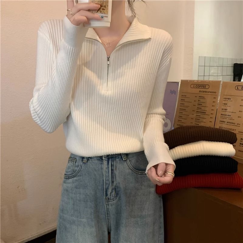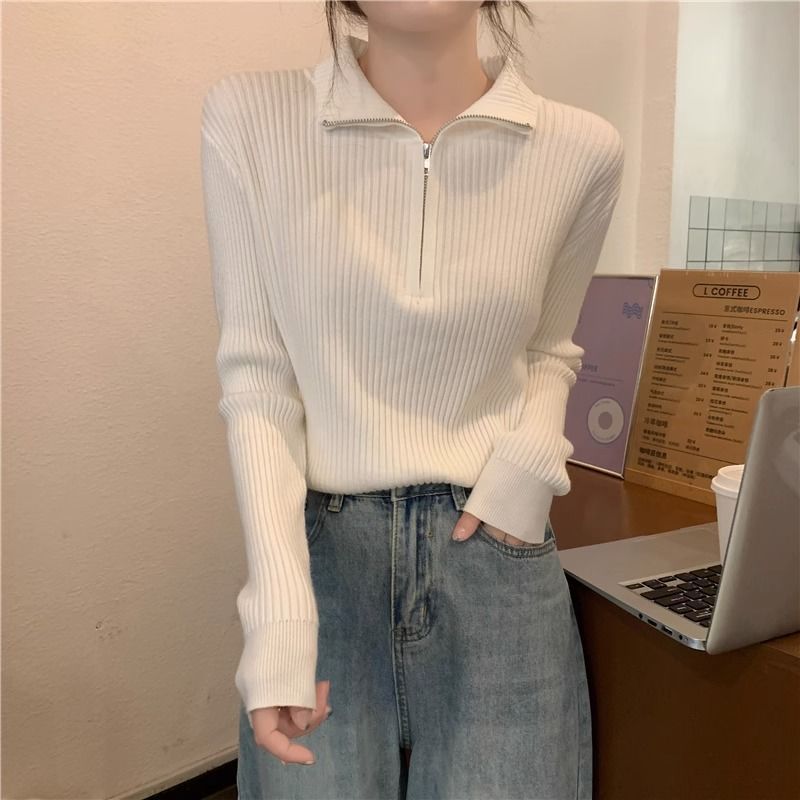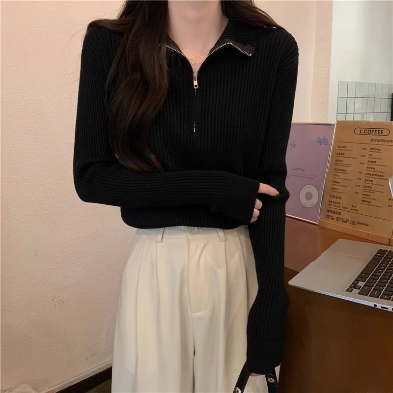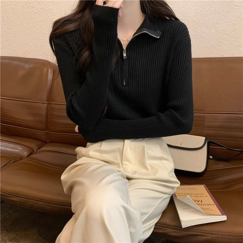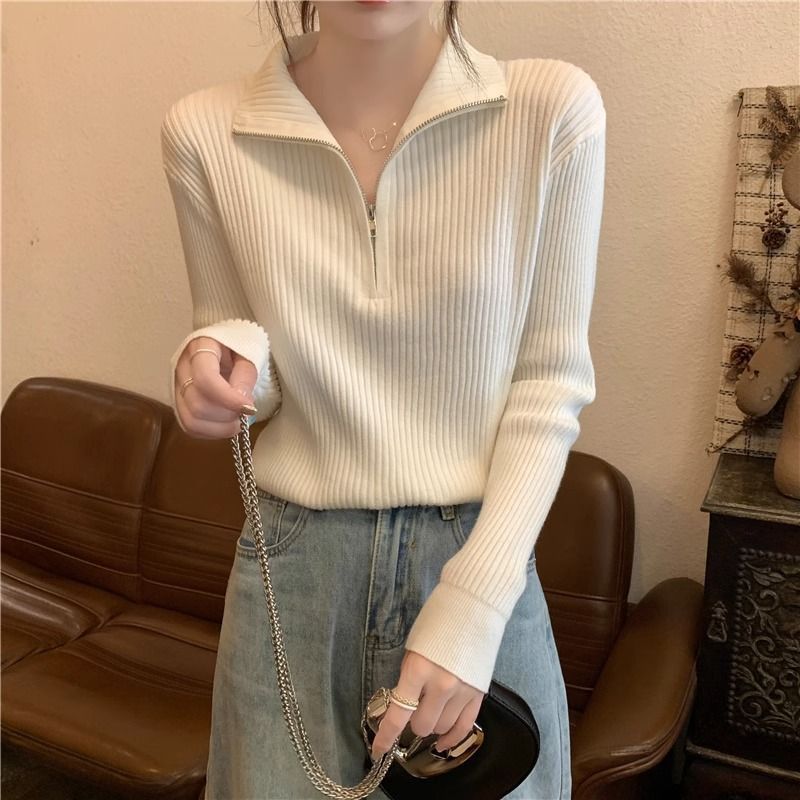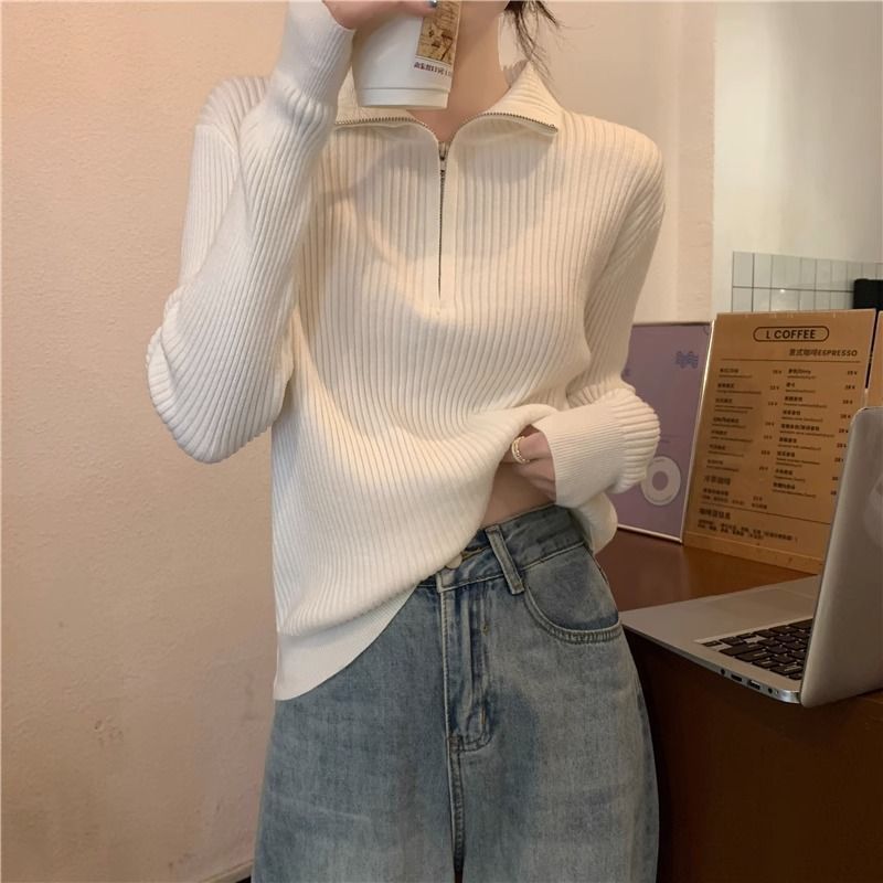 가을과 겨울 새 옷깃 긴팔베이스 니트 스웨터 탑 서양식 프랑스 하이 엔드 지퍼 스웨터 여성용스토어 가기