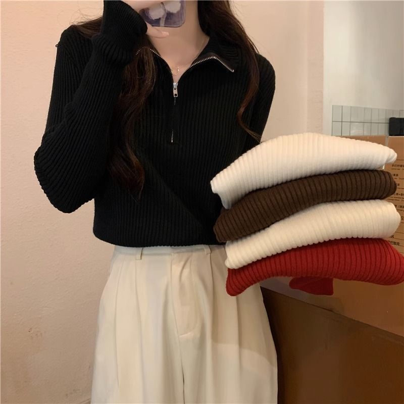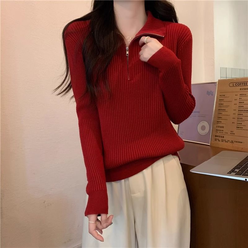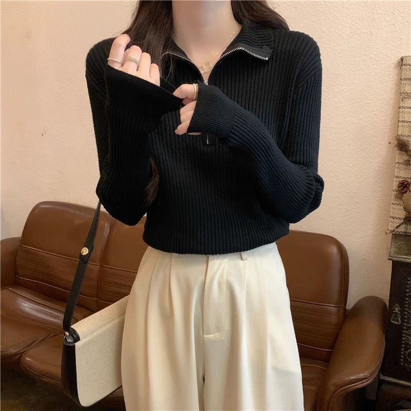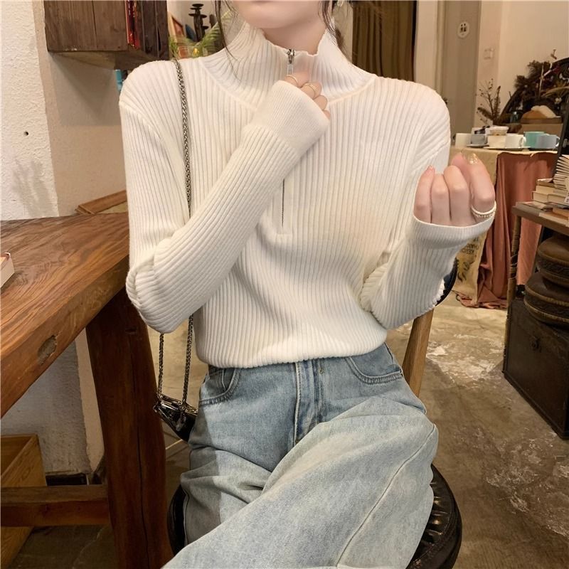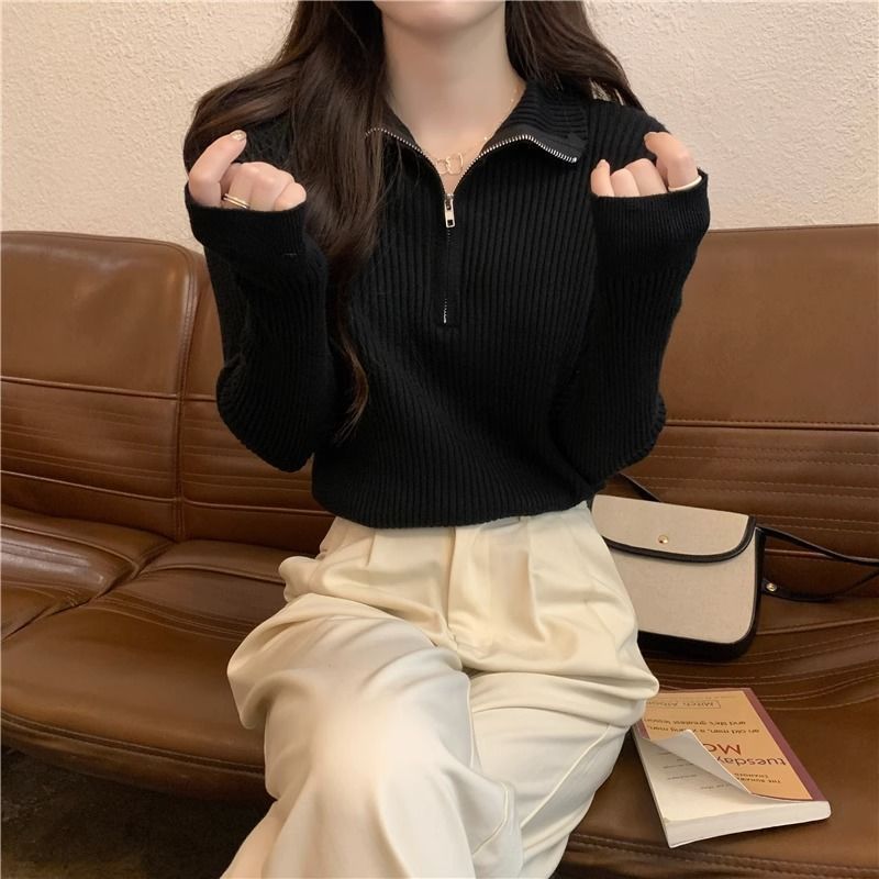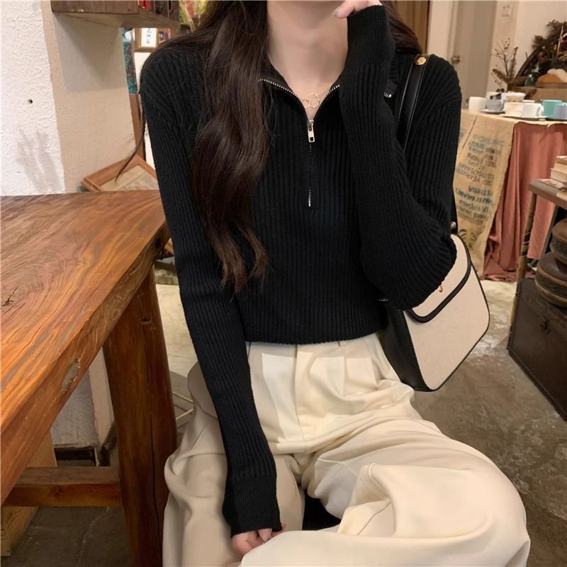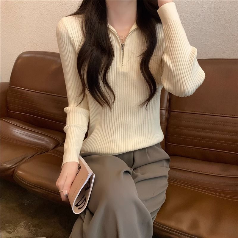 가을과 겨울 새 옷깃 긴팔베이스 니트 스웨터 탑 서양식 프랑스 하이 엔드 지퍼 스웨터 여성용스토어 가기