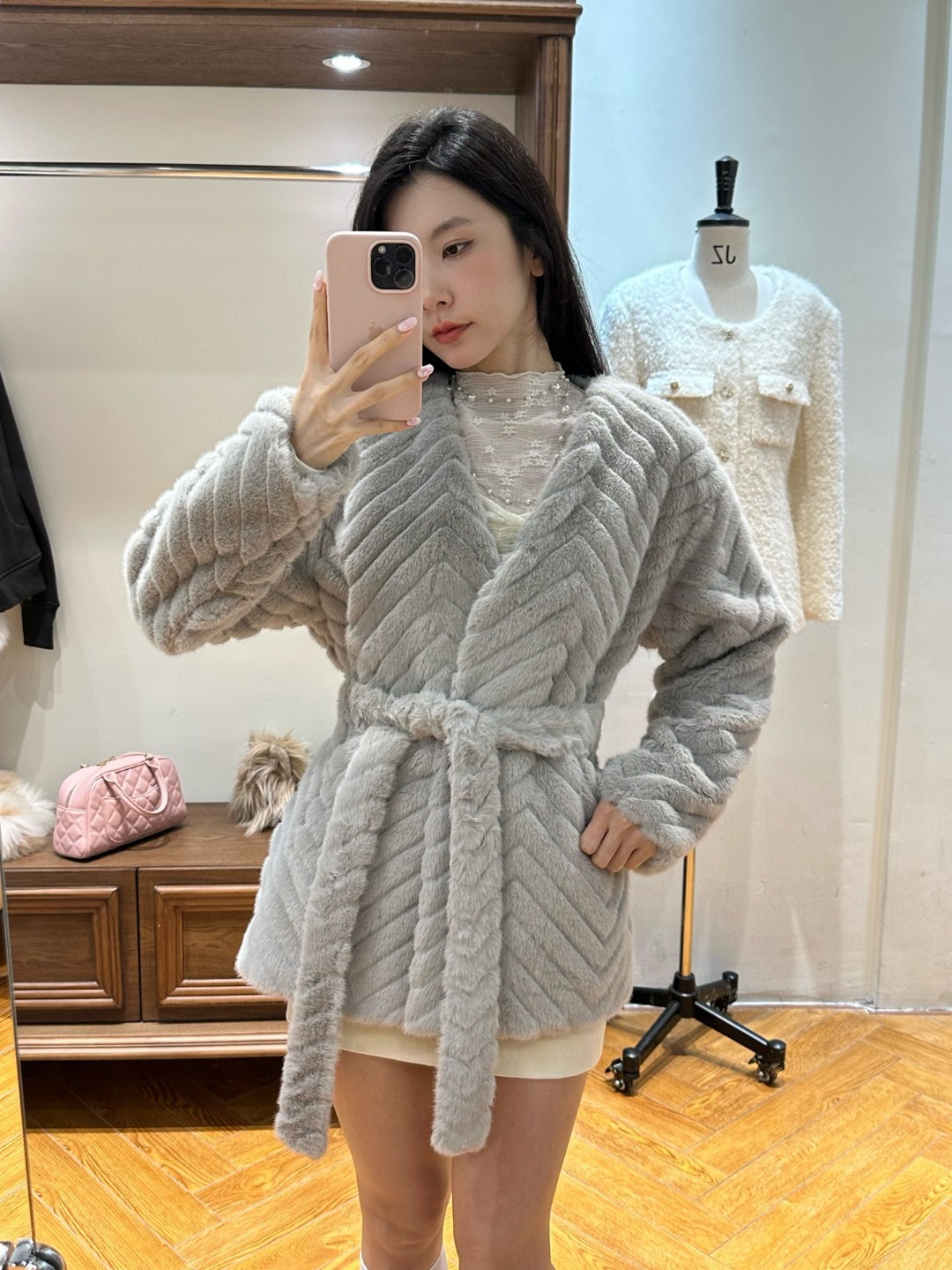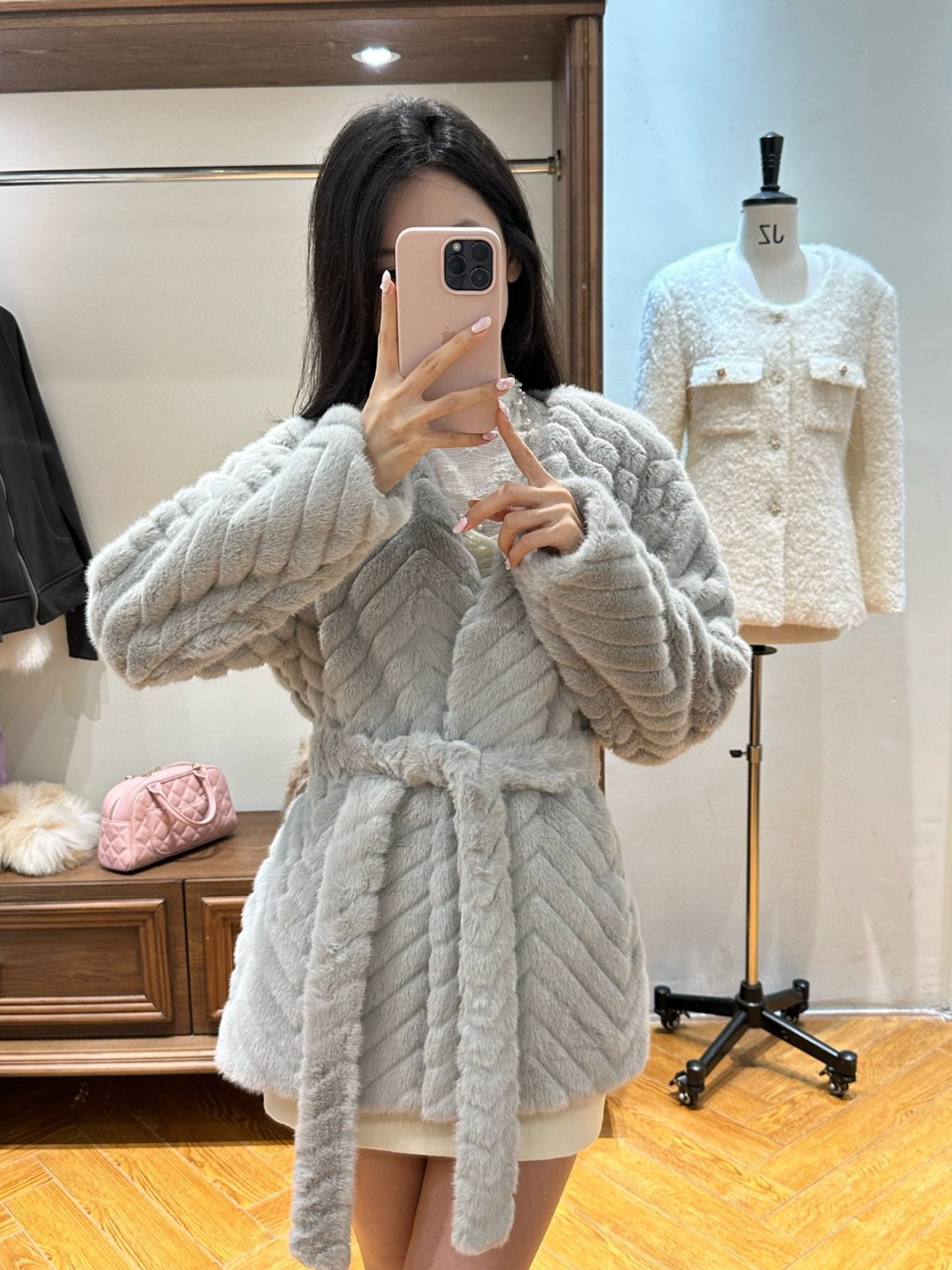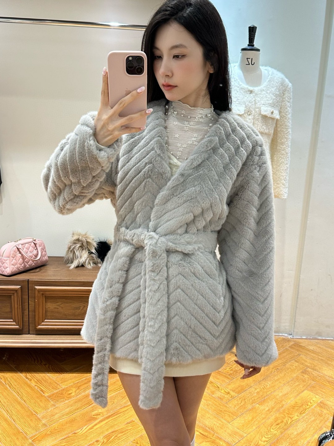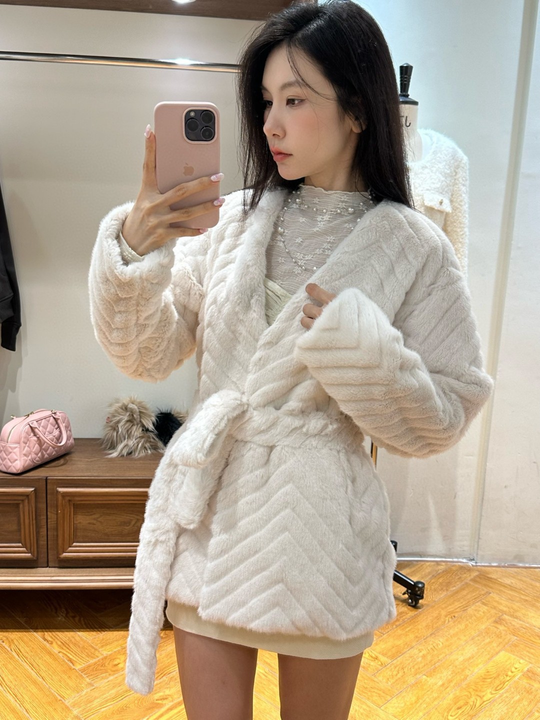 부드러운 화이트 핏 벨트 친환경 모방 밍크 헤어 슬림 V-넥 겨울 올 매치 모피 코트 여성용 2024 겨울복스토어 가기