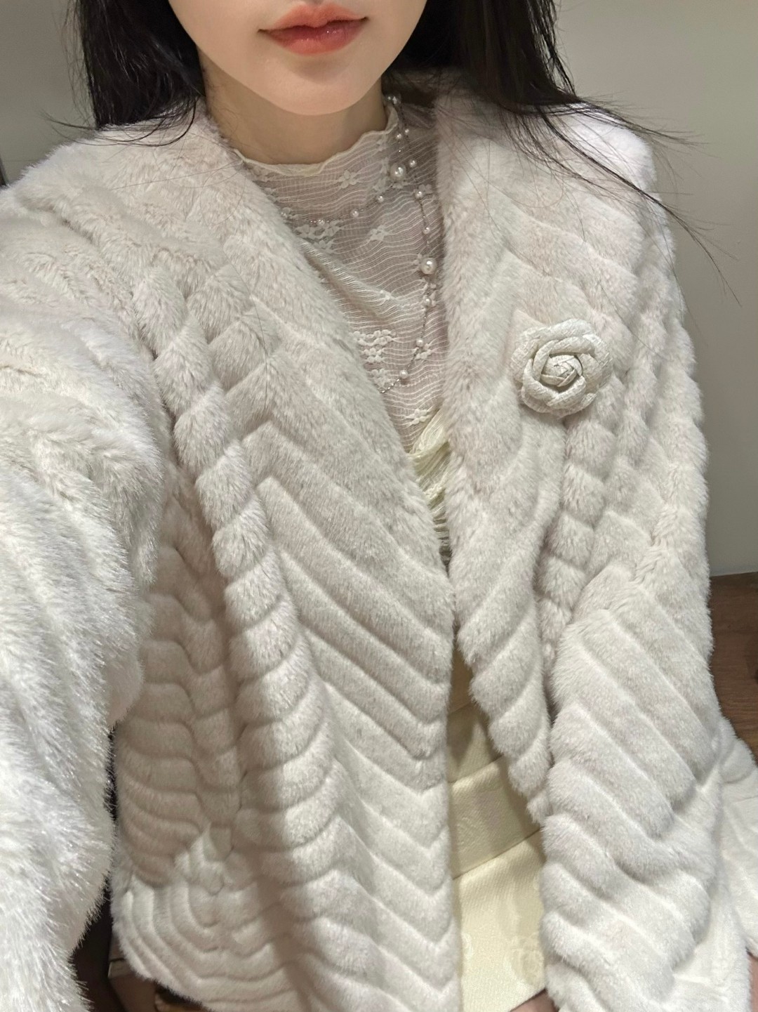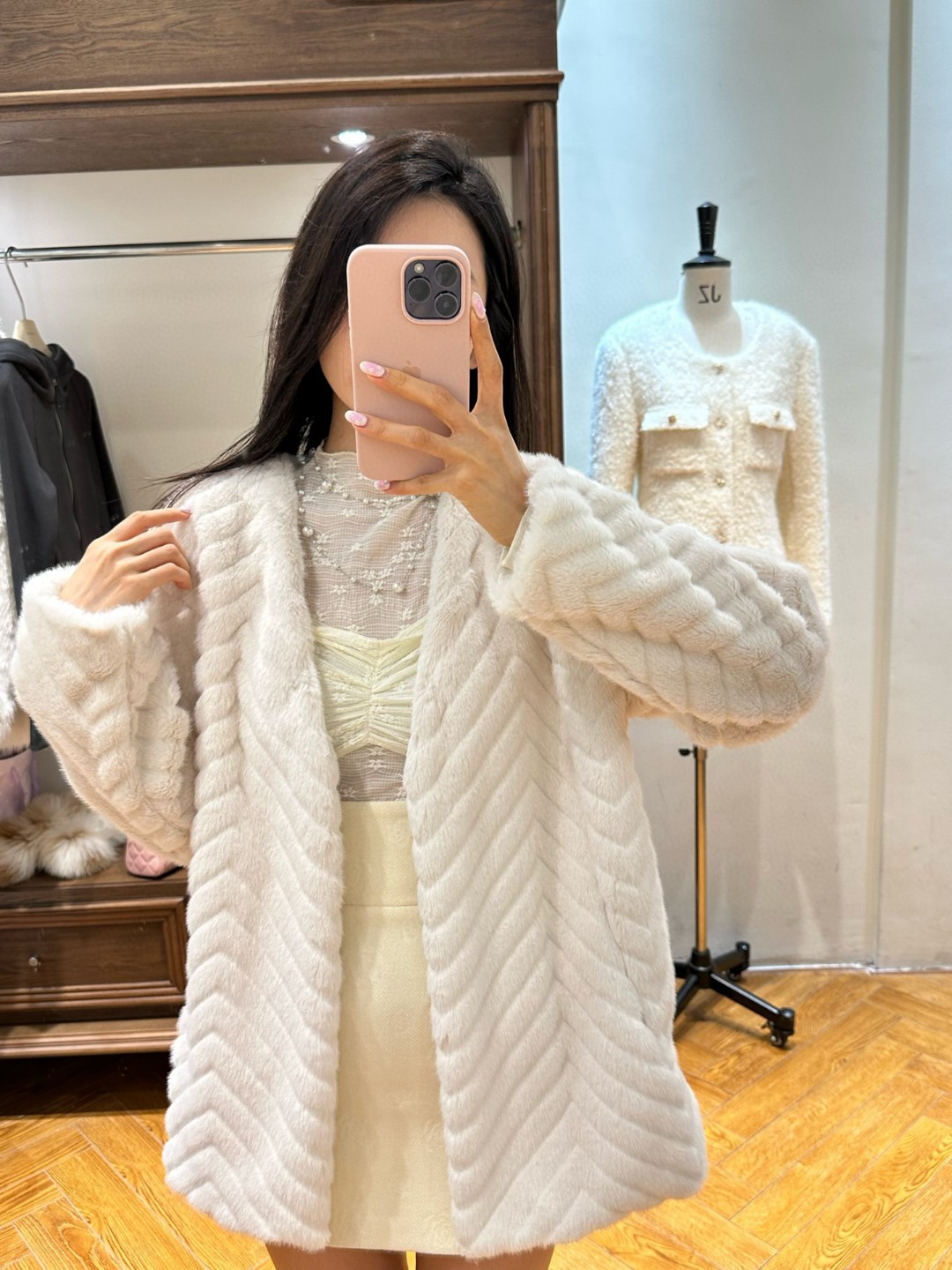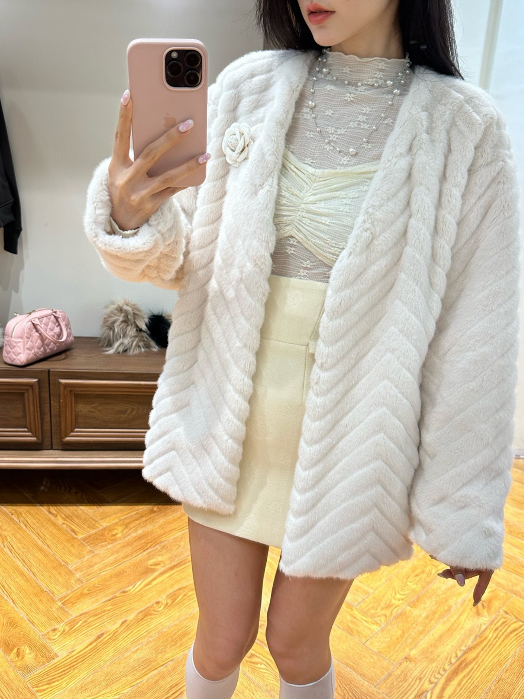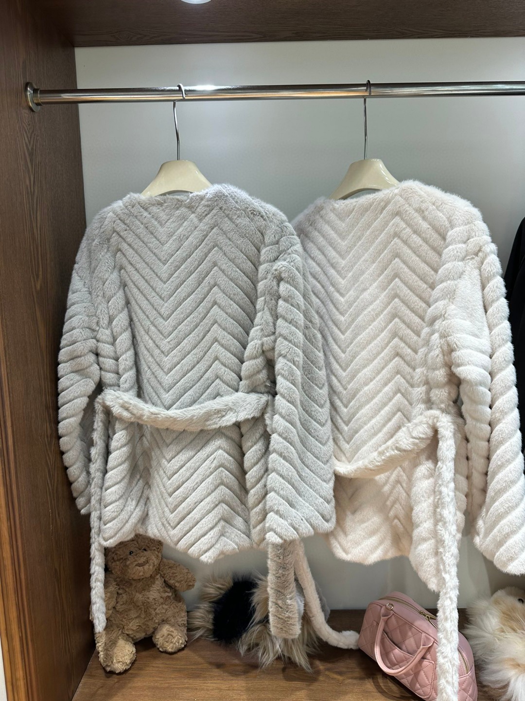 부드러운 화이트 핏 벨트 친환경 모방 밍크 헤어 슬림 V-넥 겨울 올 매치 모피 코트 여성용 2024 겨울복스토어 가기