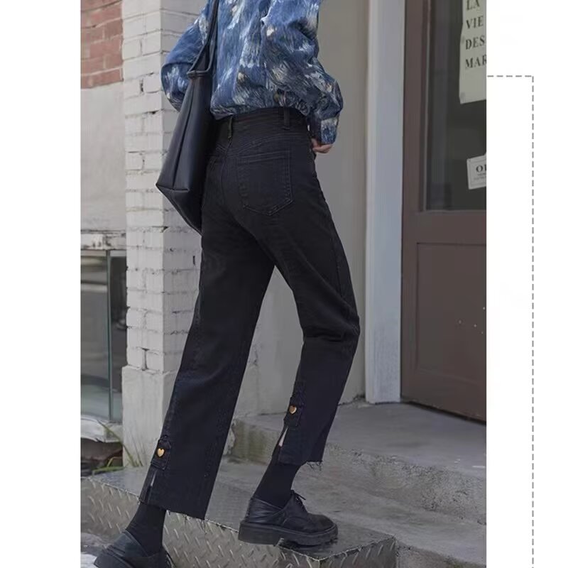 검은 청바지 여성의 봄과 가을 한국 스타일 2024 새로운 디자인 센스 사랑 분할 높은 허리 슬리밍 스트레이트 바지스토어 가기