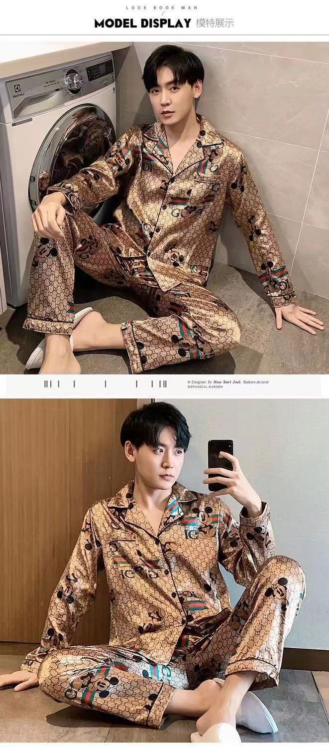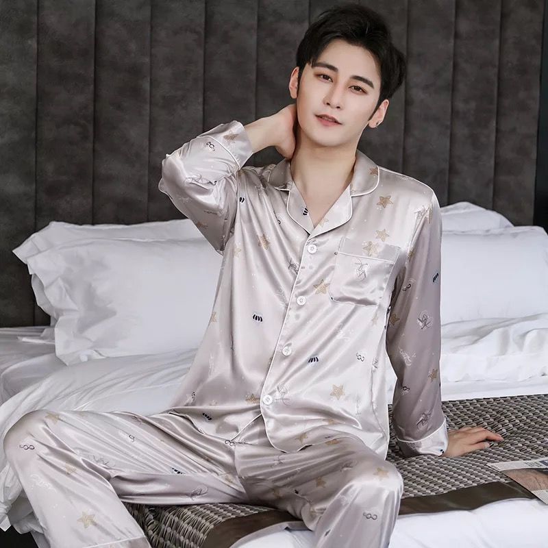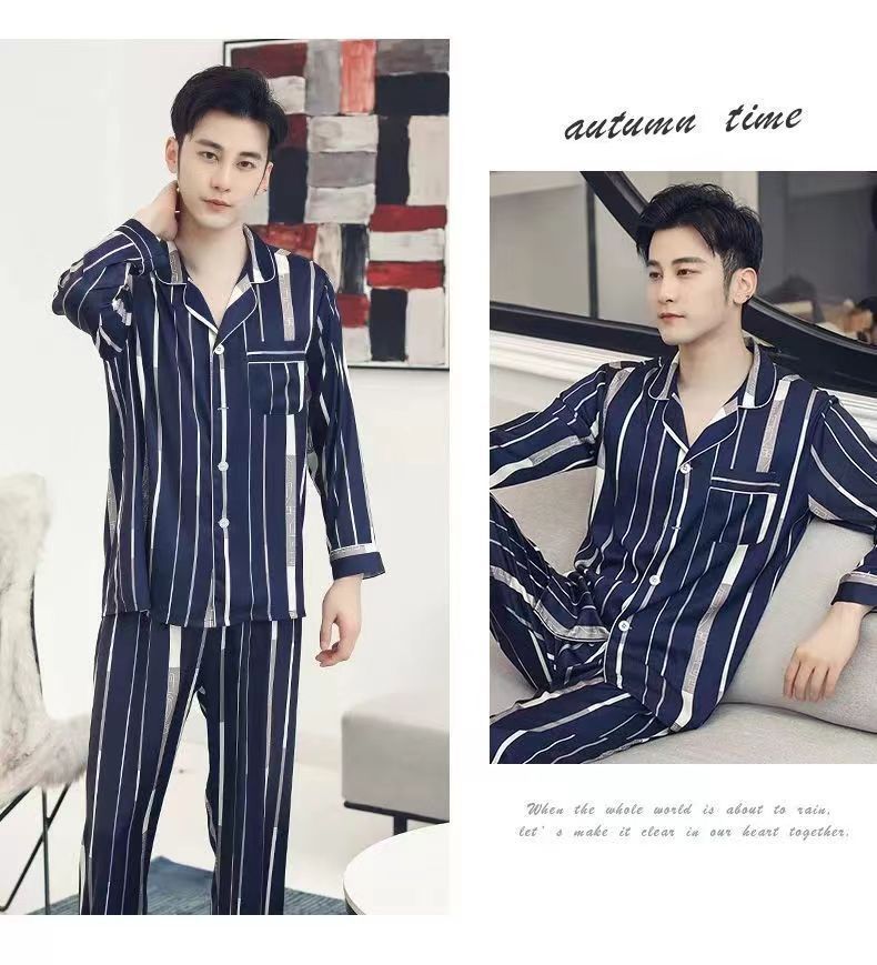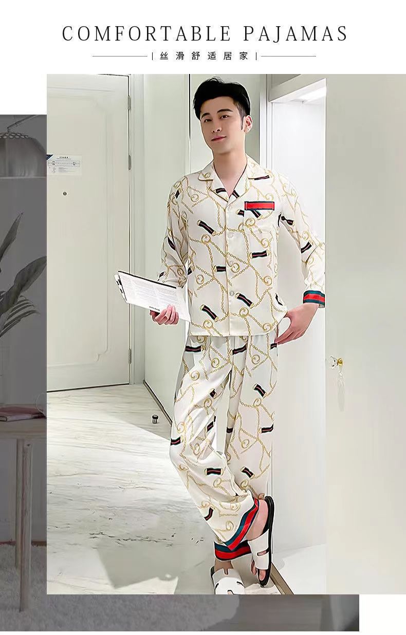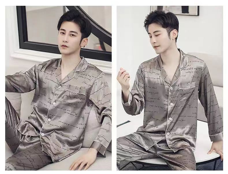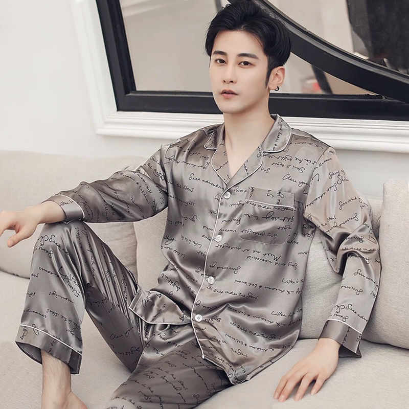 핫셀러 잠옷 남성용 봄과 가을 아이스 실크 긴팔 플러스 사이즈 느슨한 솔리드 컬러 옷깃 실크 홈 의류 남성용 투피스 세트스토어 가기