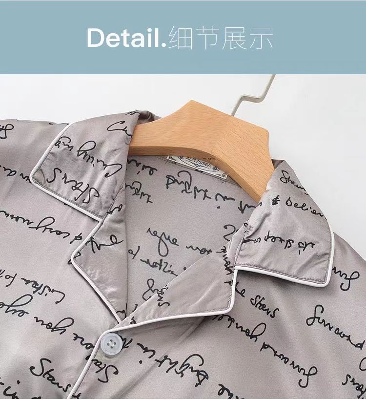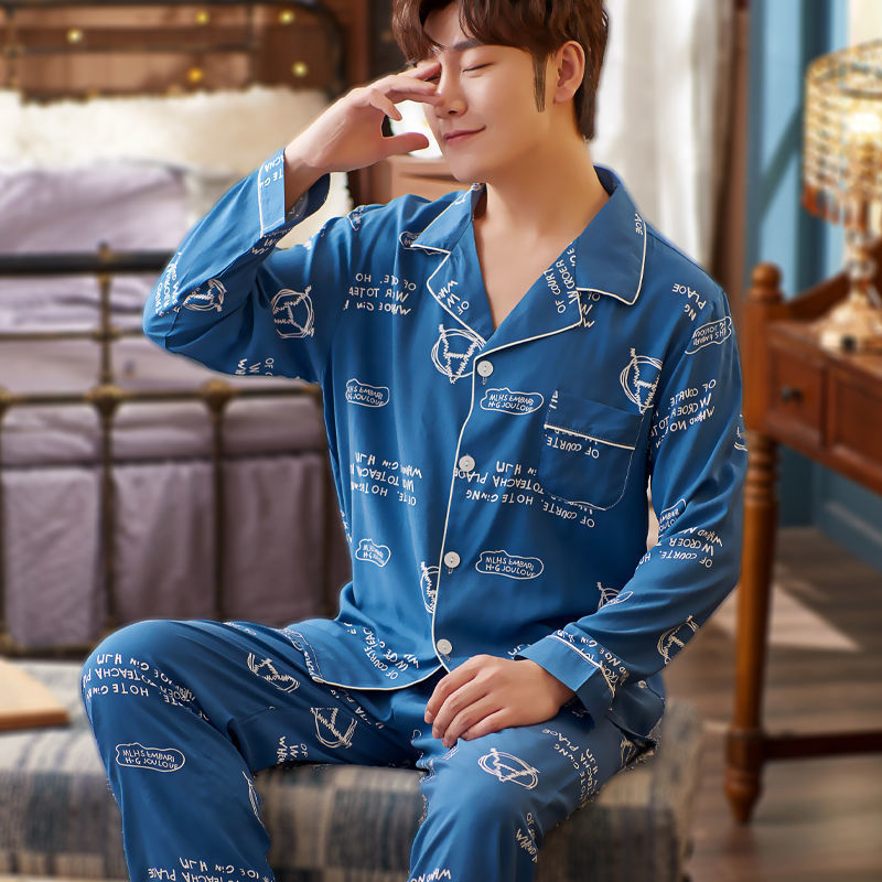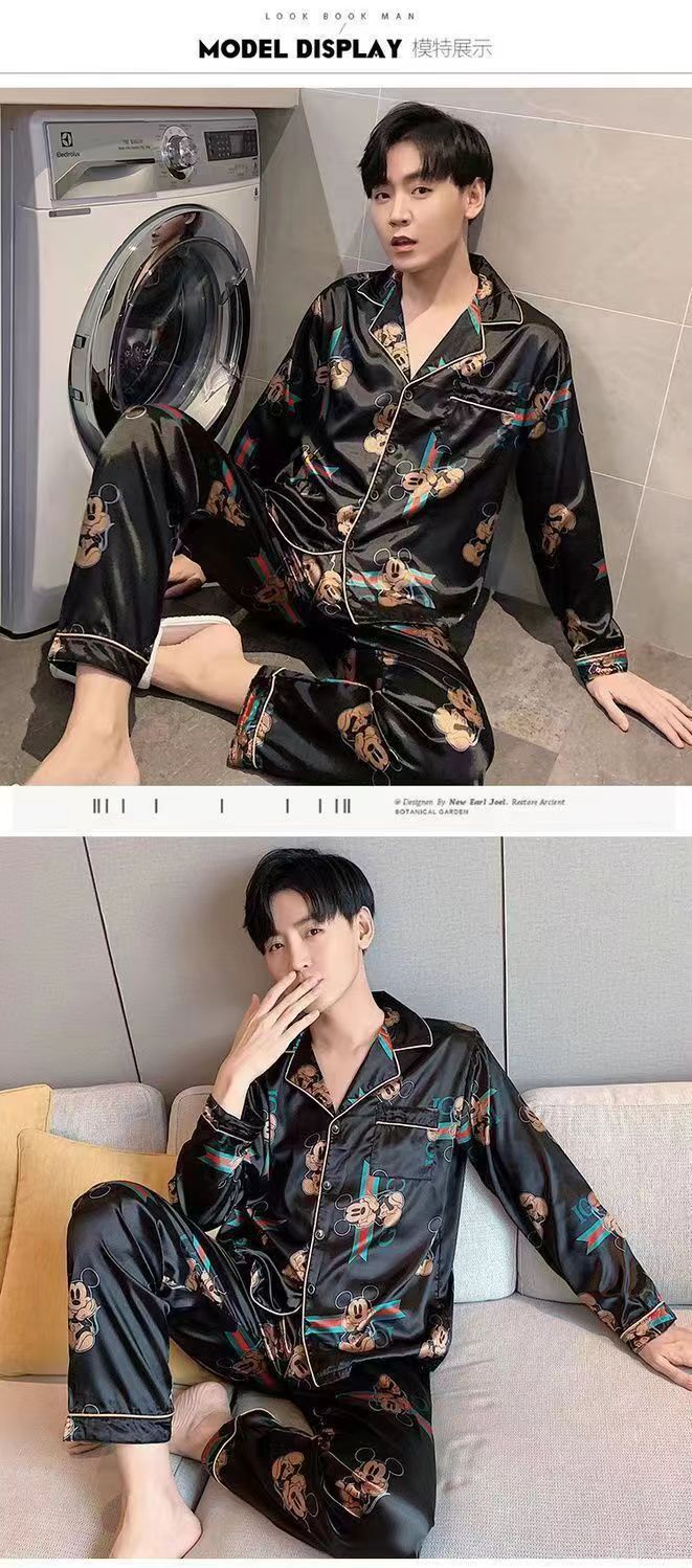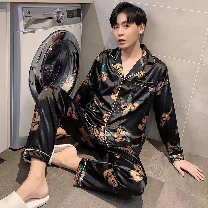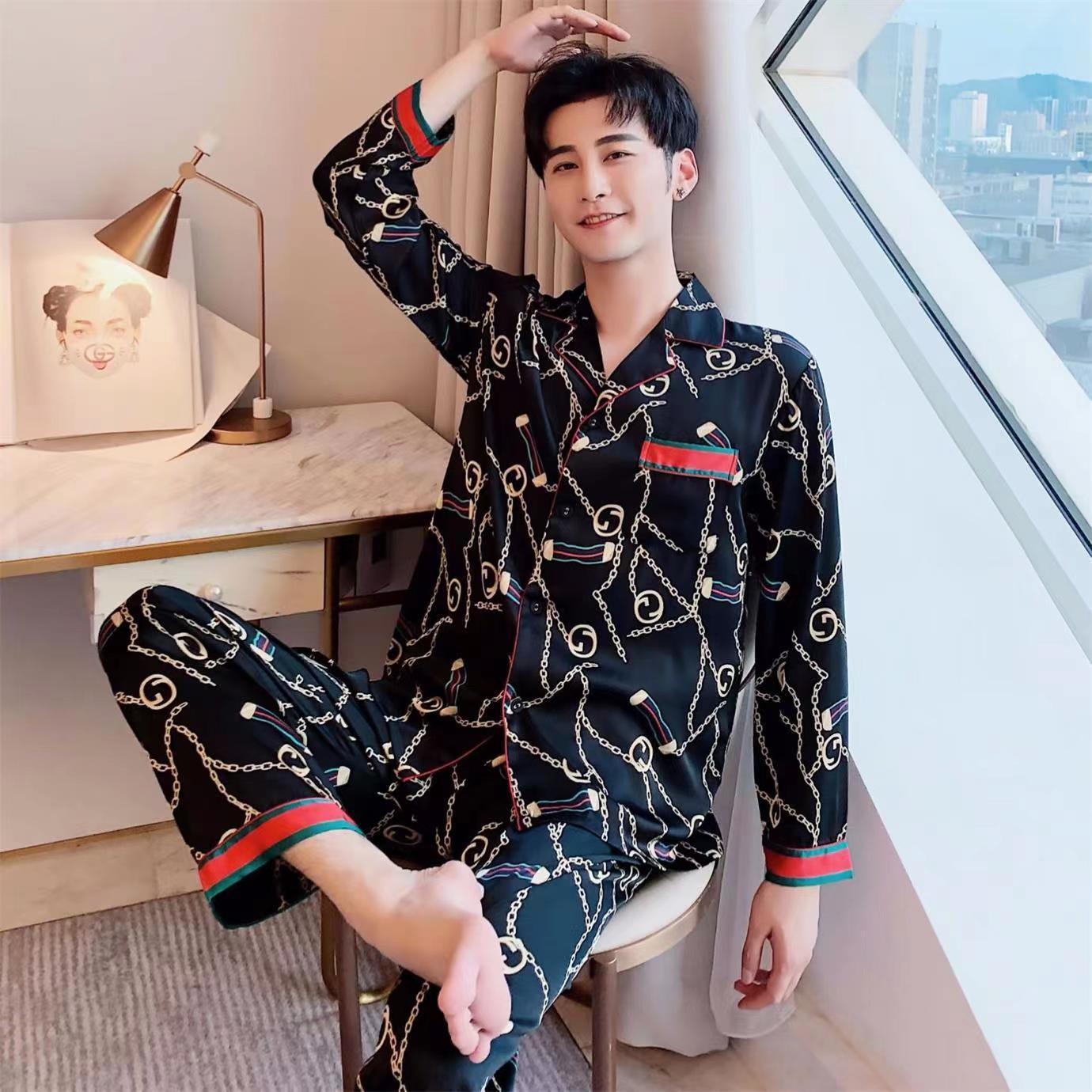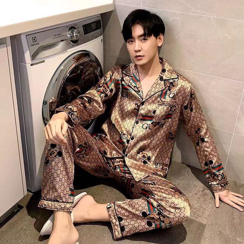 핫셀러 잠옷 남성용 봄과 가을 아이스 실크 긴팔 플러스 사이즈 느슨한 솔리드 컬러 옷깃 실크 홈 의류 남성용 투피스 세트스토어 가기