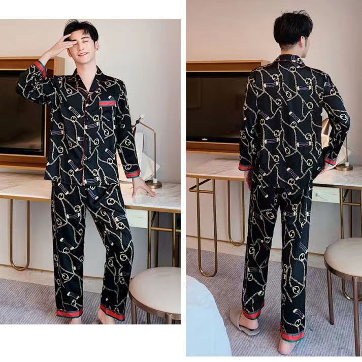 핫셀러 잠옷 남성용 봄과 가을 아이스 실크 긴팔 플러스 사이즈 느슨한 솔리드 컬러 옷깃 실크 홈 의류 남성용 투피스 세트