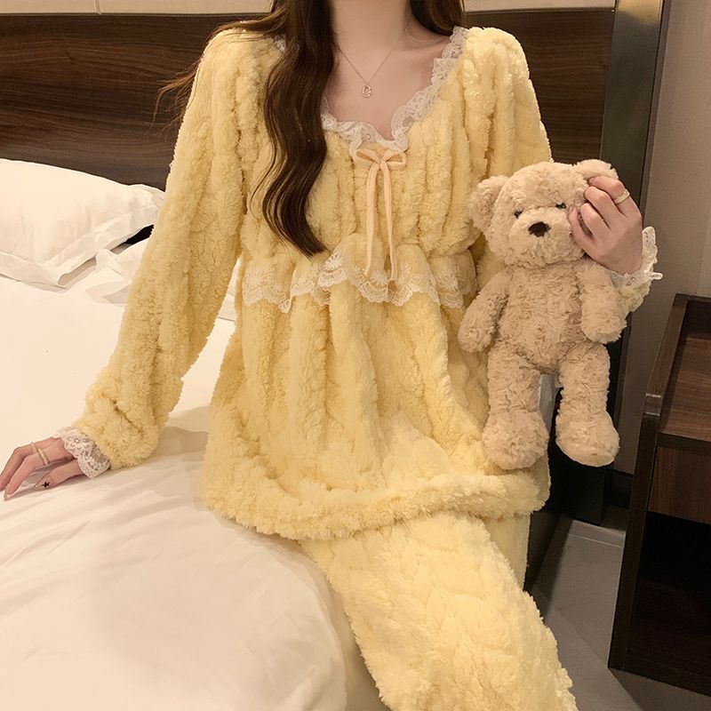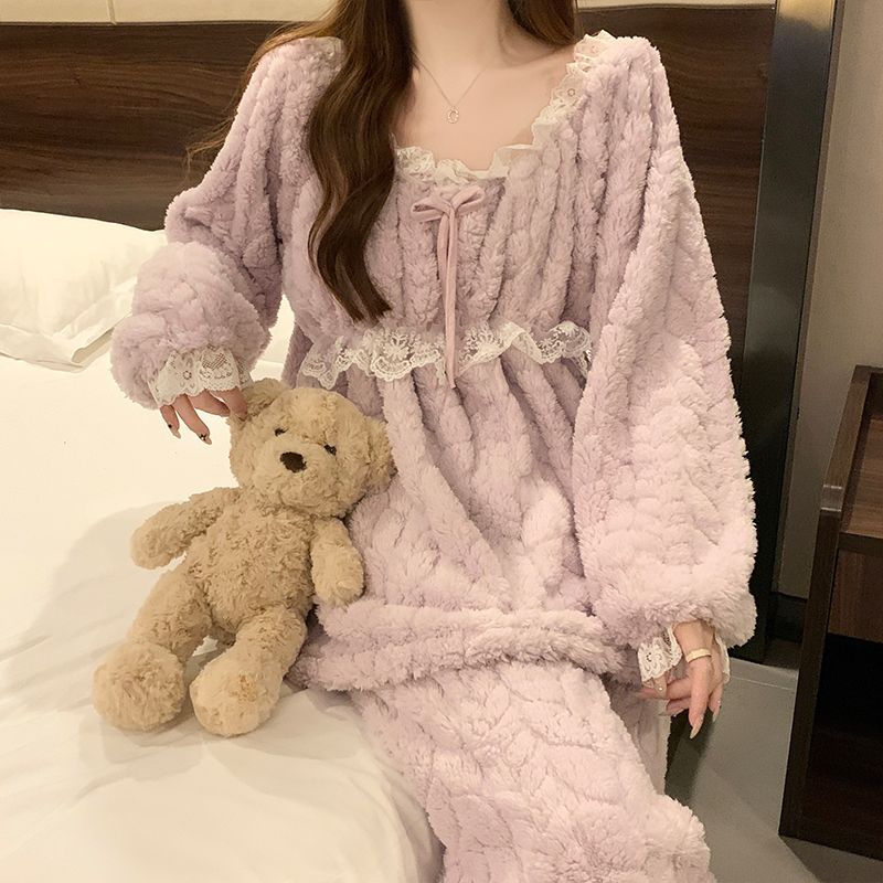 공주 스타일 잠옷 여성의 가을과 겨울 산호 양털 기모 두꺼운 플란넬 달콤한 인터넷 축하 고급 홈 옷스토어 가기