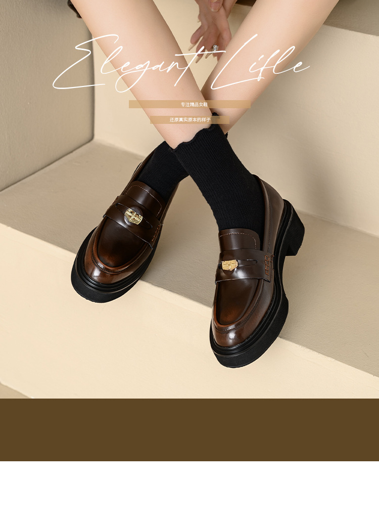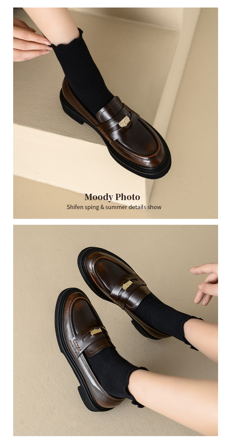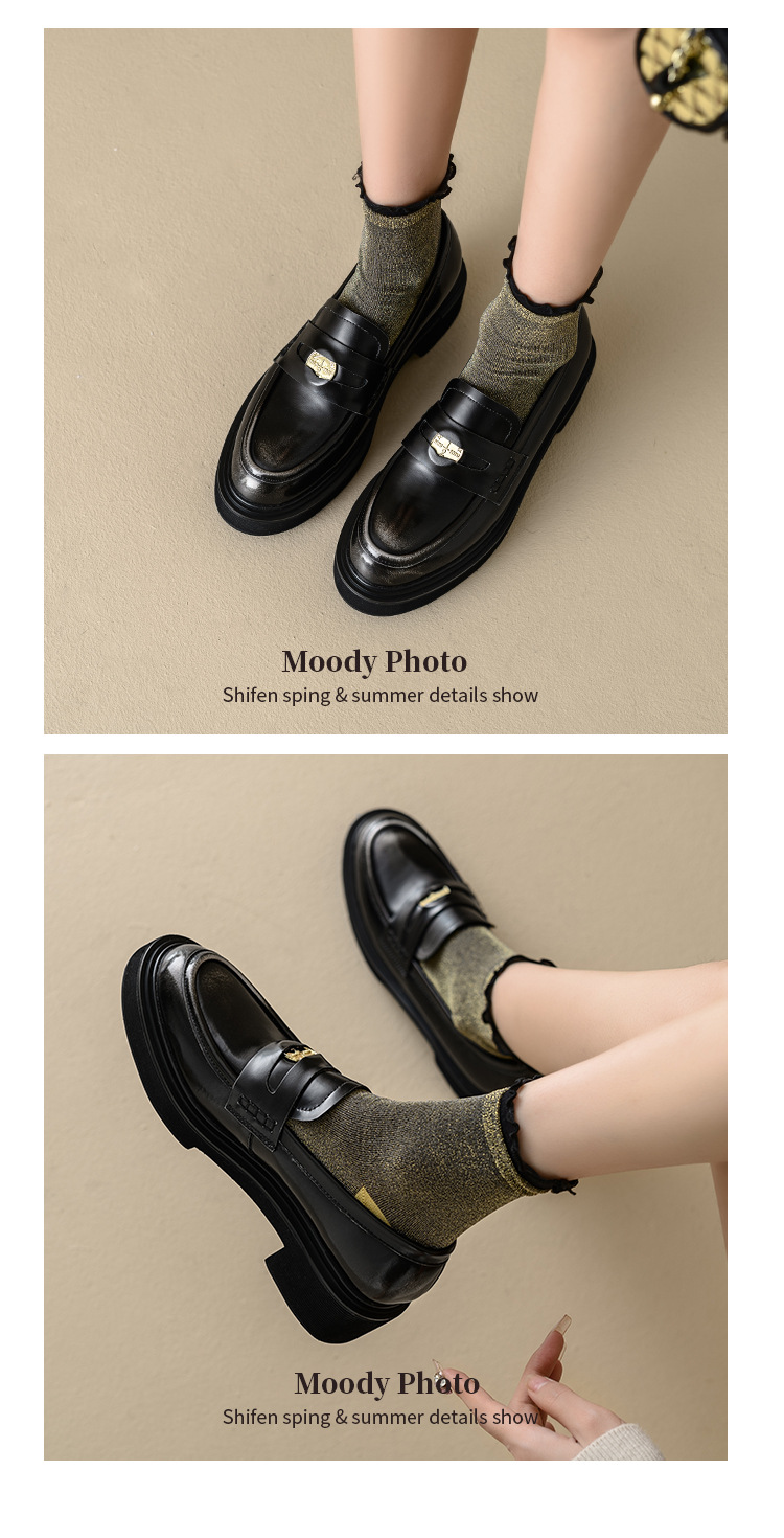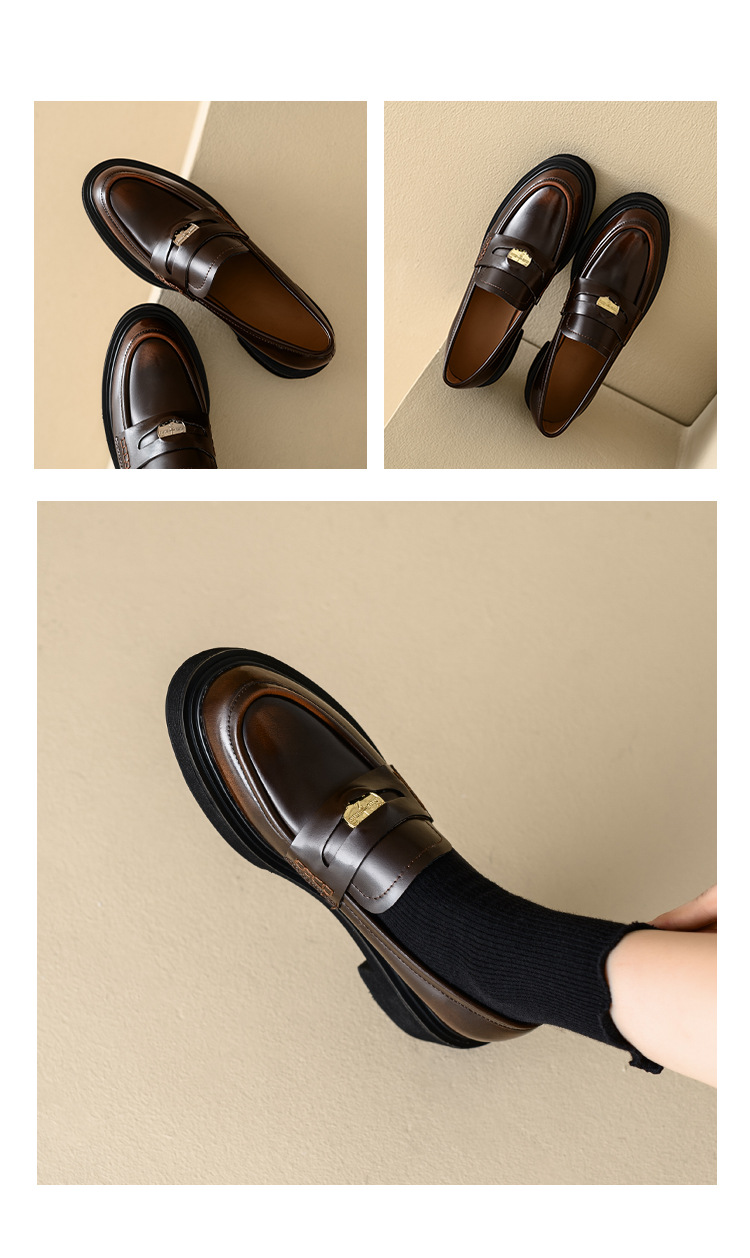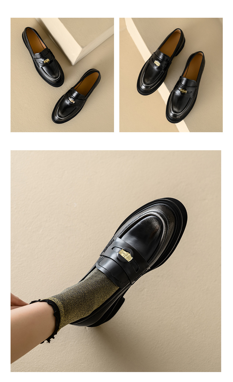 골드 코인 로퍼 2025 가을 신작 여성 신발 슬립 온 작은 가죽 신발 두꺼운 밑창 플랫 로우 컷 신발 깊은 입 싱글 신발스토어 가기