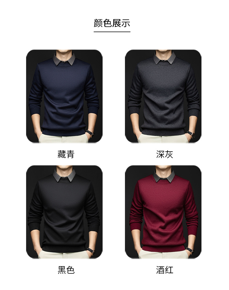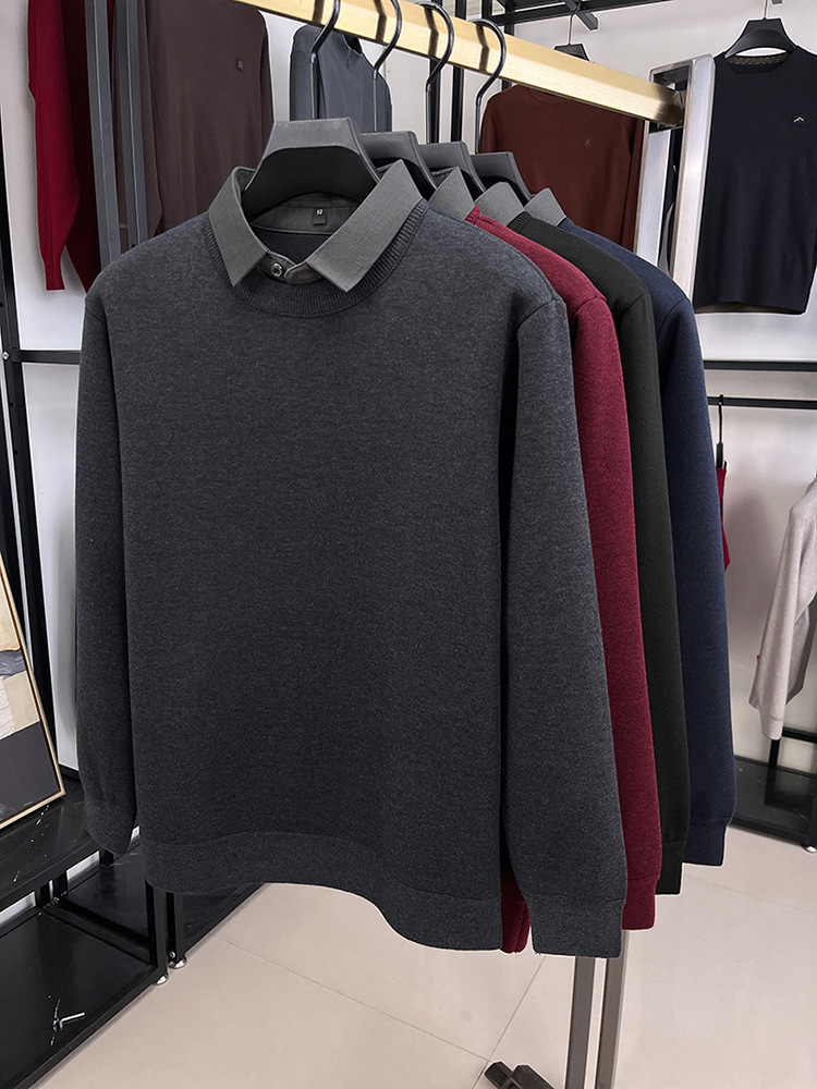 2024 가을과 겨울 새로운 양모 기모 가짜 투피스 스웨터 남성 옷깃 따뜻한 긴 소매 바닥 스웨터스토어 가기