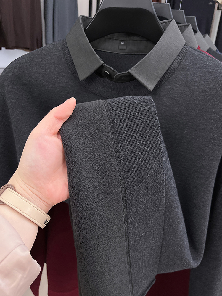 2024 가을과 겨울 새로운 양모 기모 가짜 투피스 스웨터 남성 옷깃 따뜻한 긴 소매 바닥 스웨터