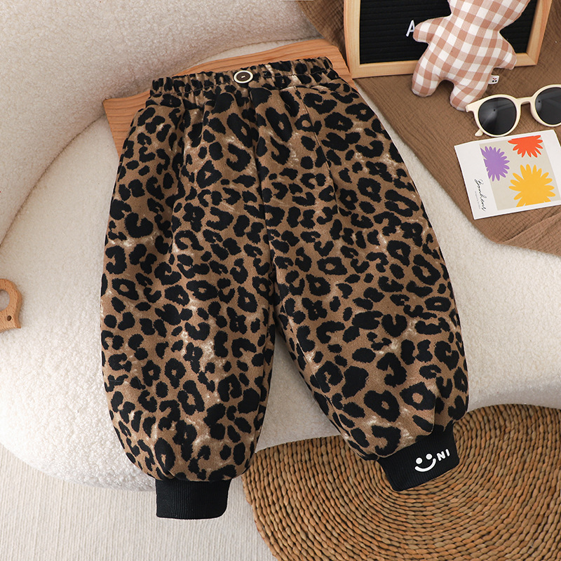따뜻한 두꺼운 따뜻한 바지 뽕나무 실크 겨울 새 여자 레오파드 바지 어린이 기모 두꺼운 외부 착용 캐주얼 바지