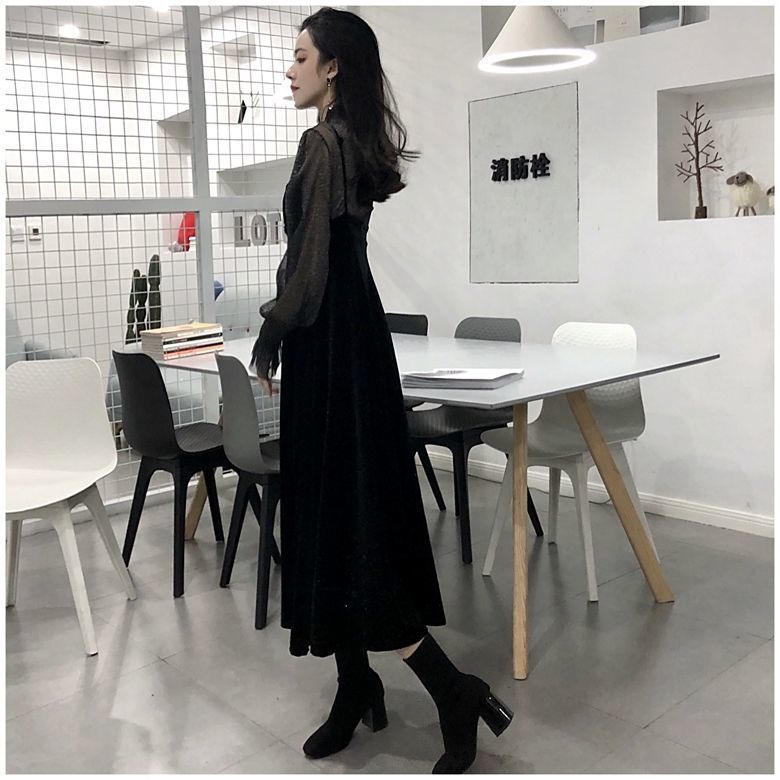 벨벳 드레스와 메쉬 이너웨어로 구성된 봄 가을 투피스 여성복 2025 신상 섹시하고 우아한 스타일리시 세트스토어 가기