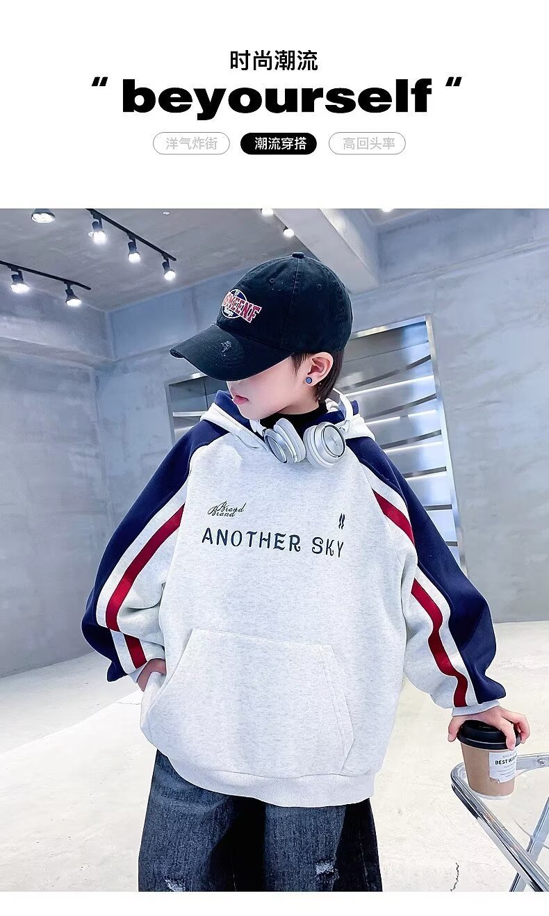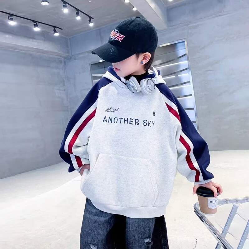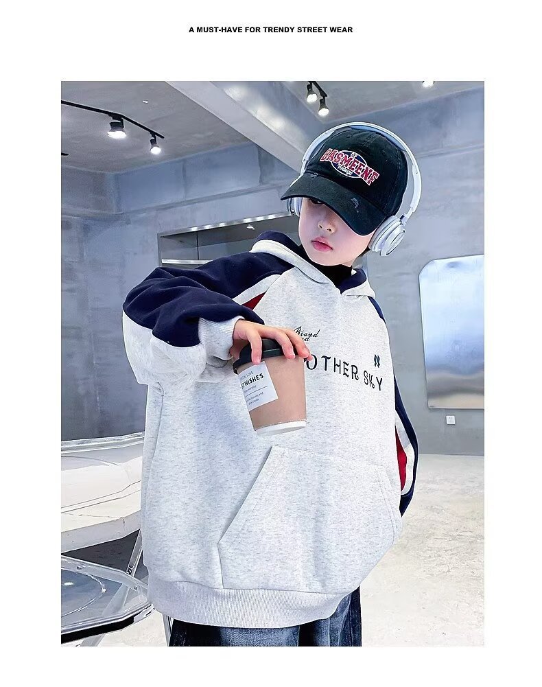 소년 가을과 겨울 한국 색상 대비 기모 후드 땀 2024 새로운 어린이 소년 겨울 쿨 잘 생긴 스포츠 탑스토어 가기