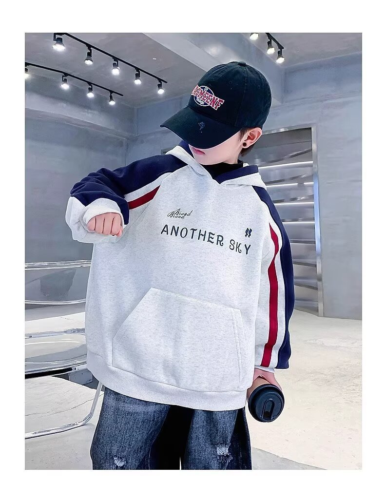 소년 가을과 겨울 한국 색상 대비 기모 후드 땀 2024 새로운 어린이 소년 겨울 쿨 잘 생긴 스포츠 탑