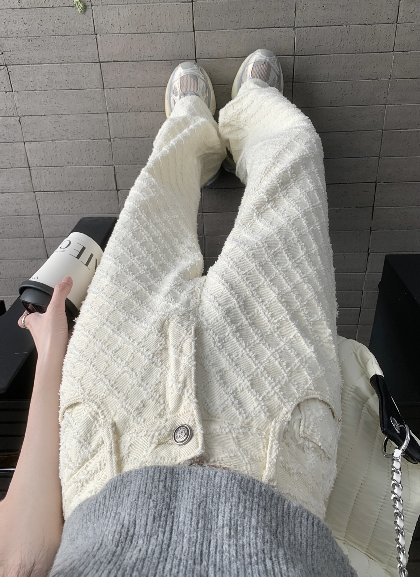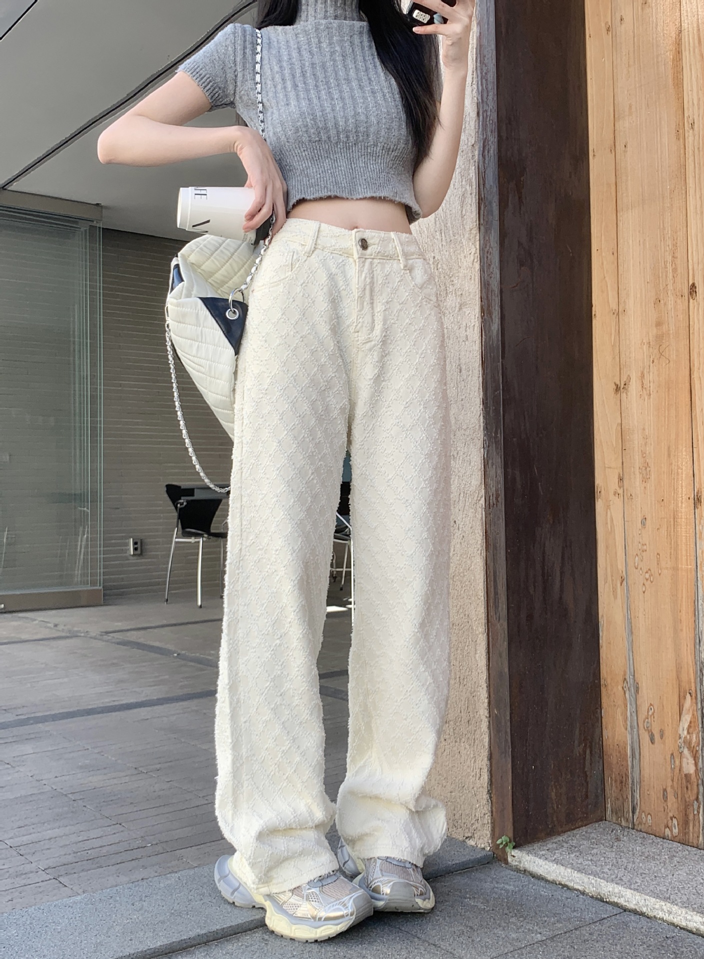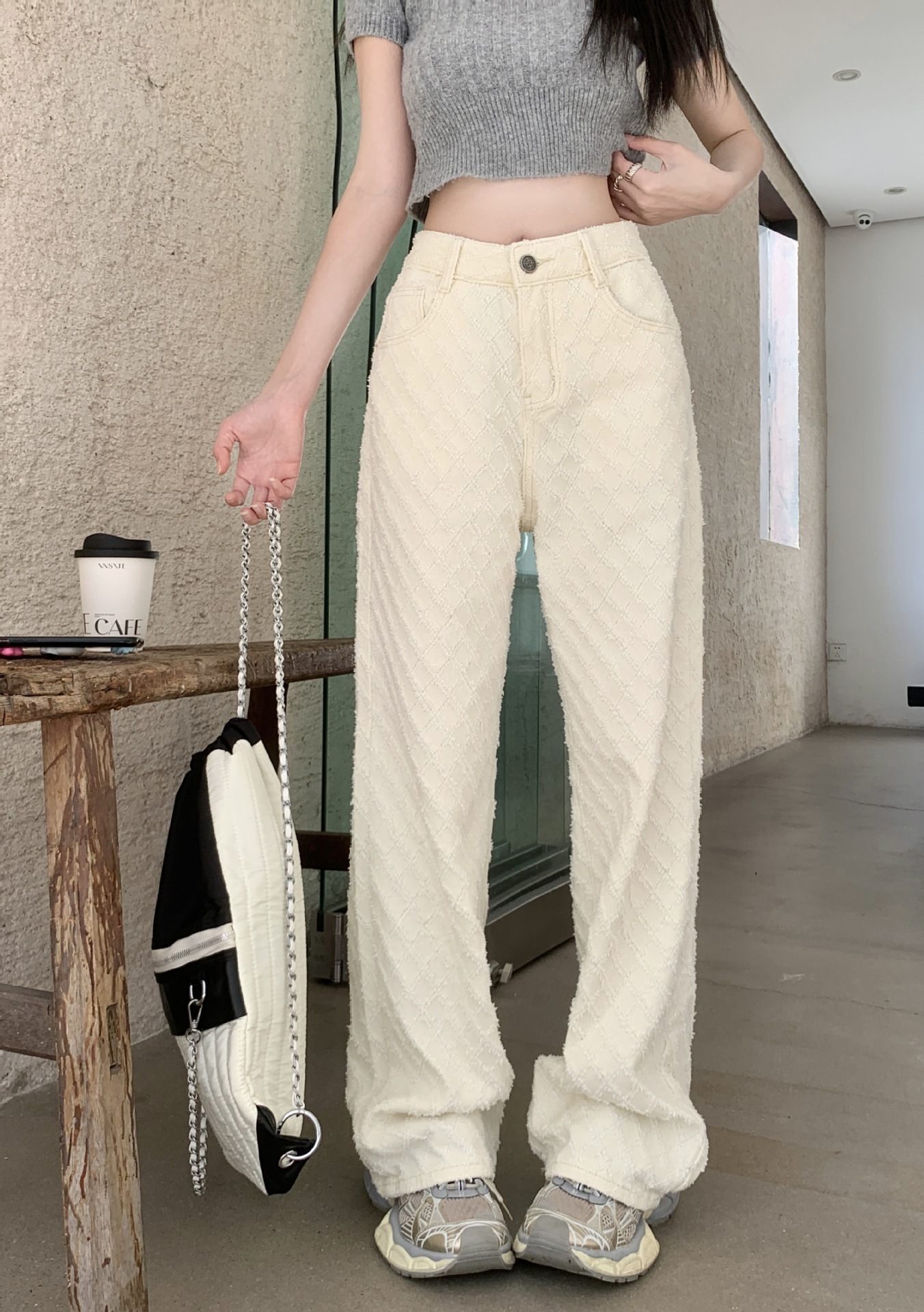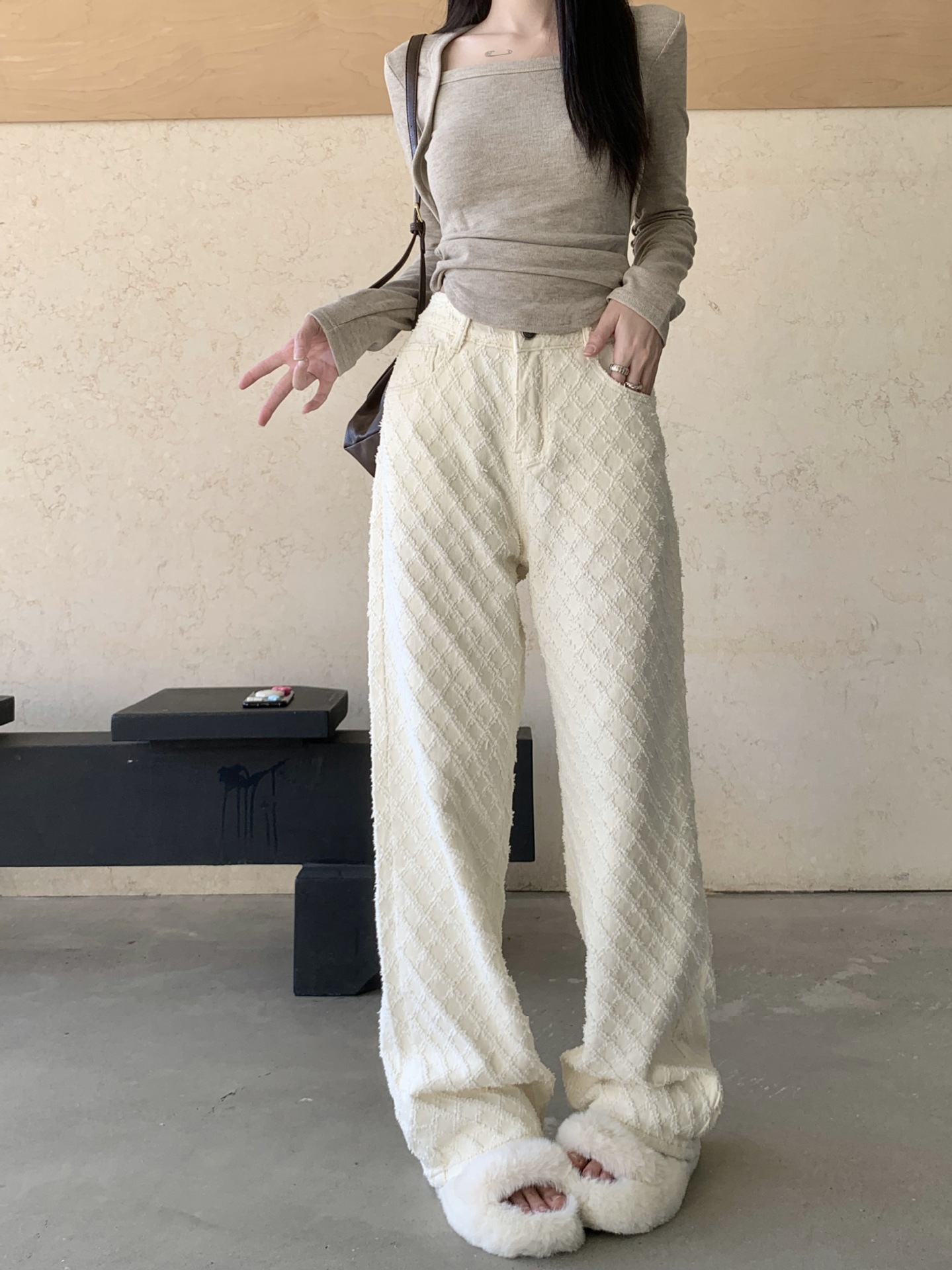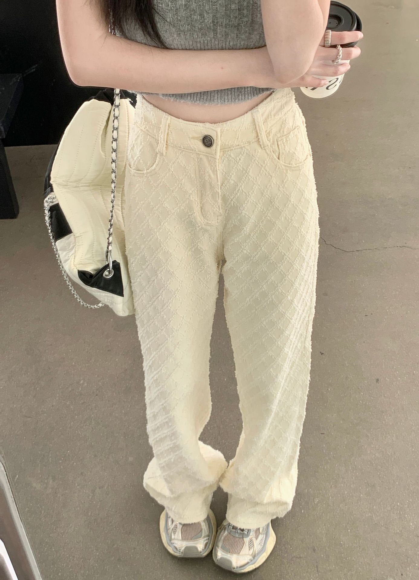 디자인 센스 향기로운 스타일 격자 무늬 화이트 높은 허리 다이아몬드 격자 무늬 청바지 여성의 새로운 자카드 슬리밍 넓은 다리 바지