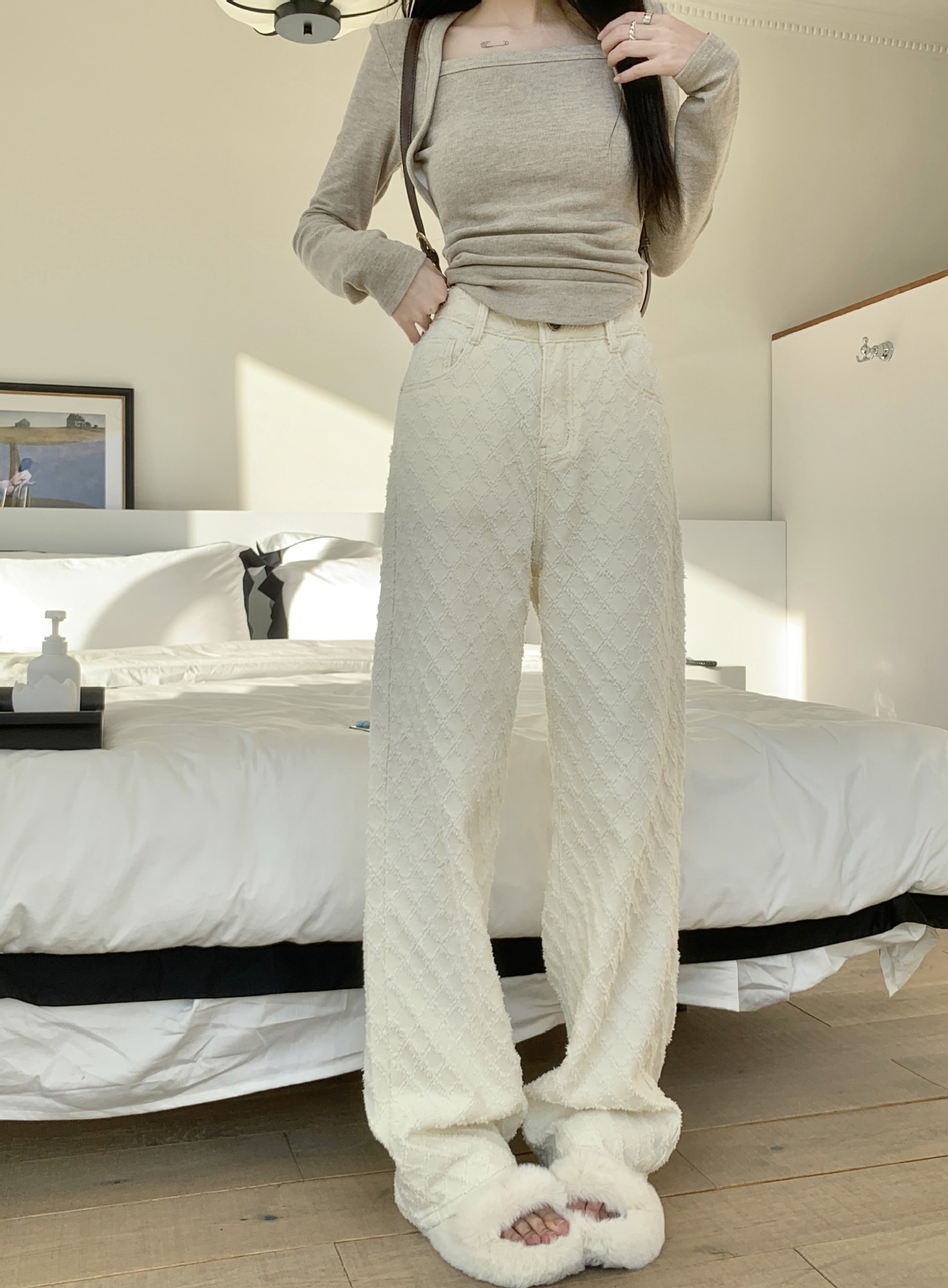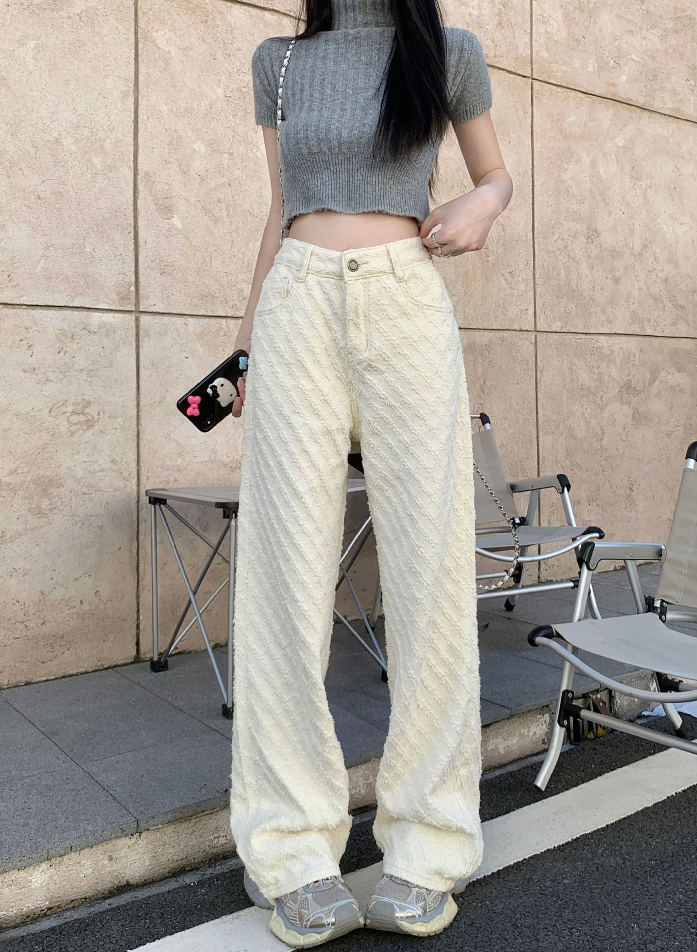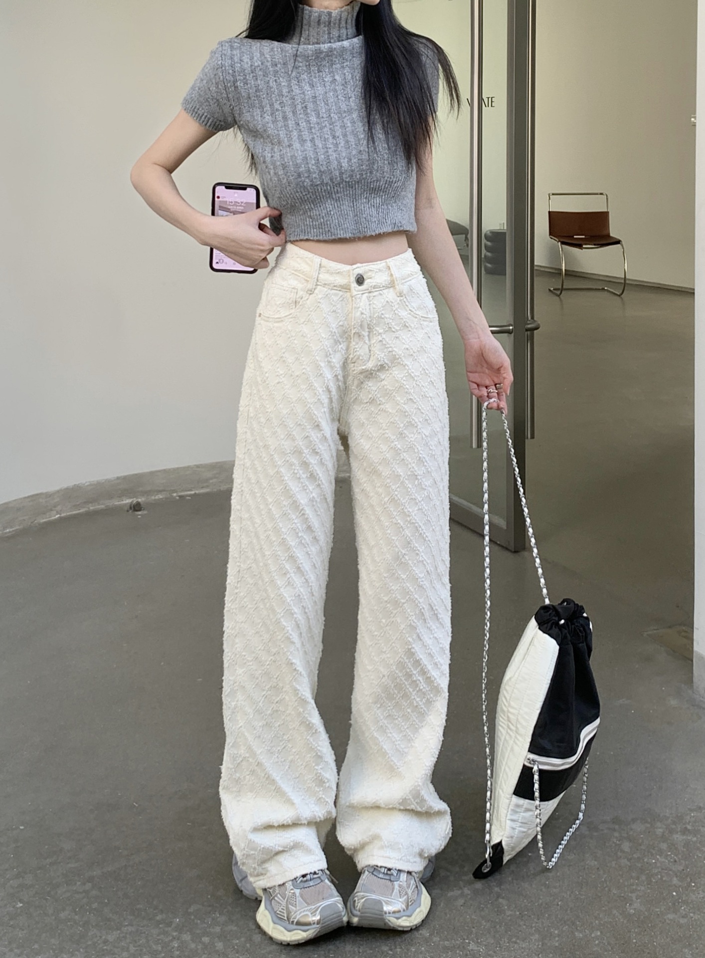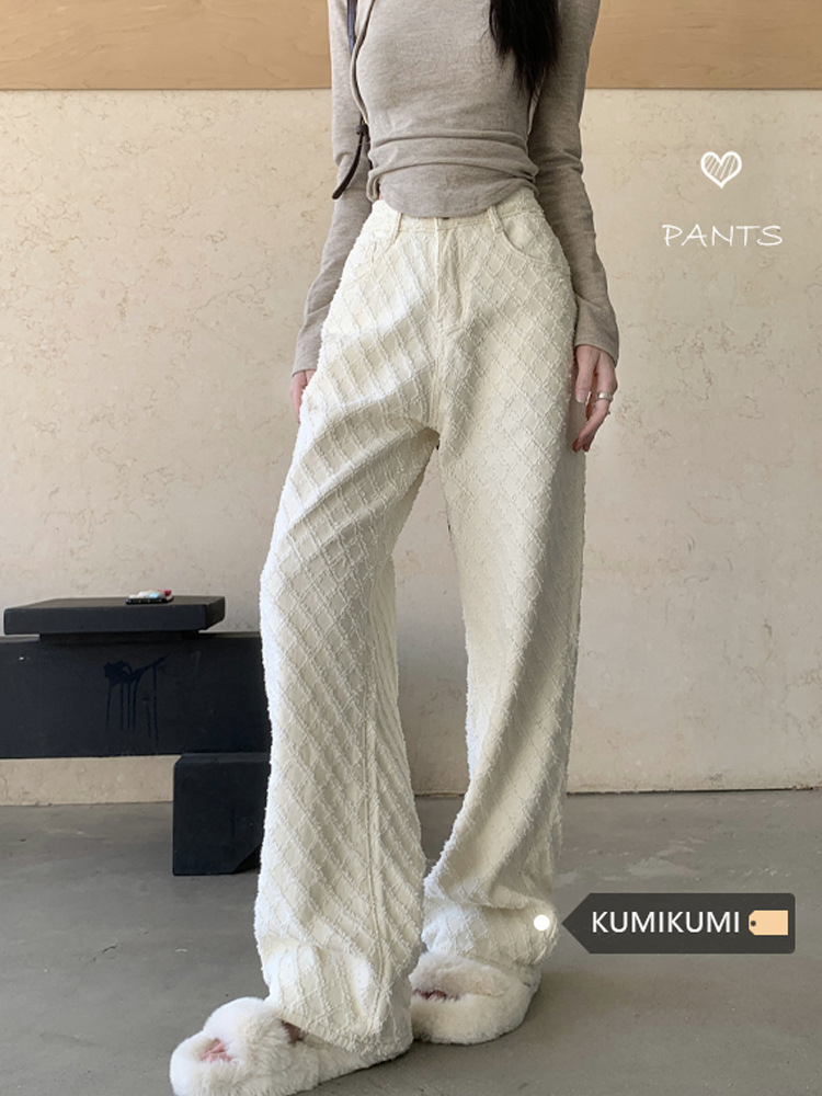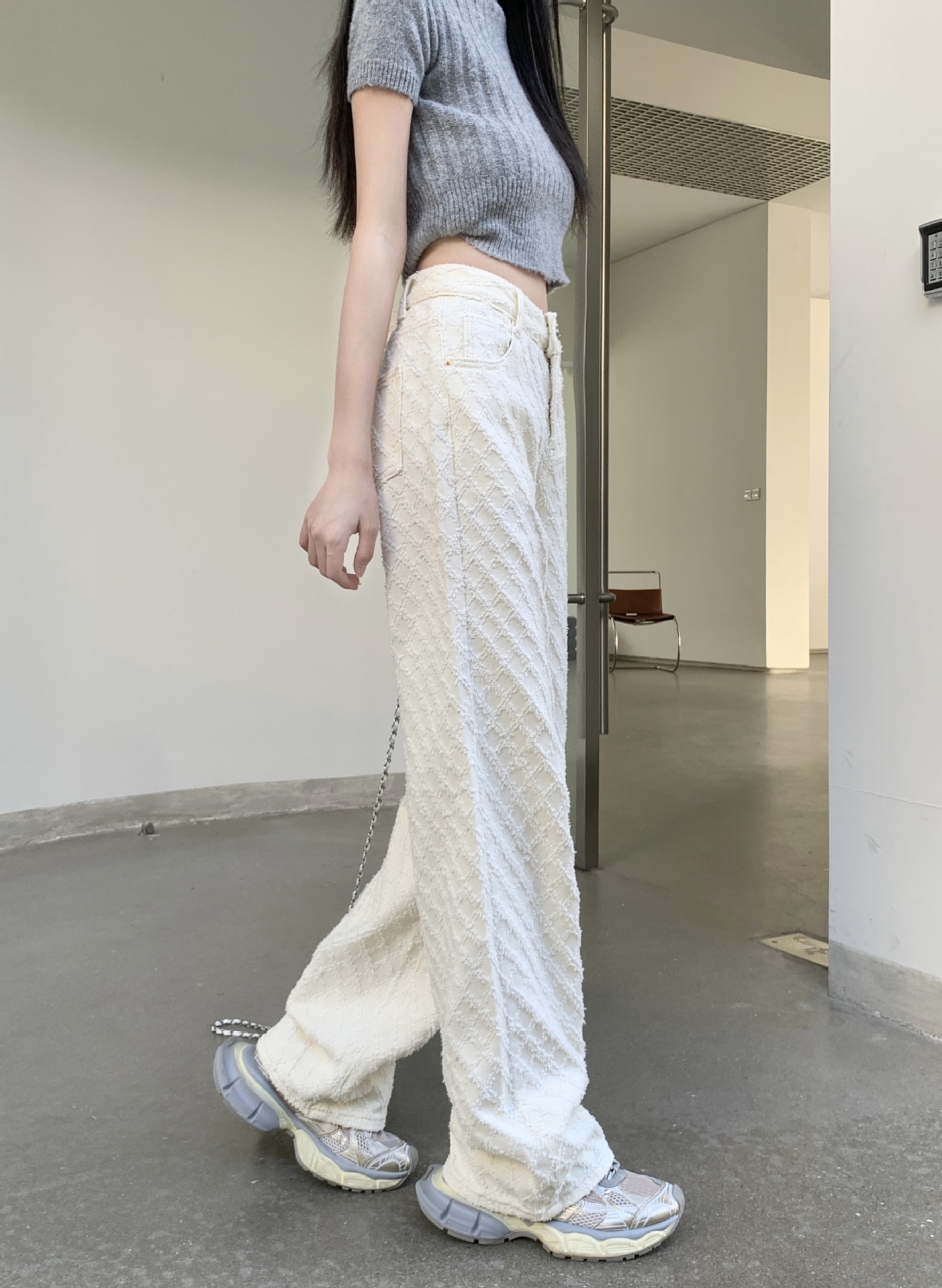 디자인 센스 향기로운 스타일 격자 무늬 화이트 높은 허리 다이아몬드 격자 무늬 청바지 여성의 새로운 자카드 슬리밍 넓은 다리 바지