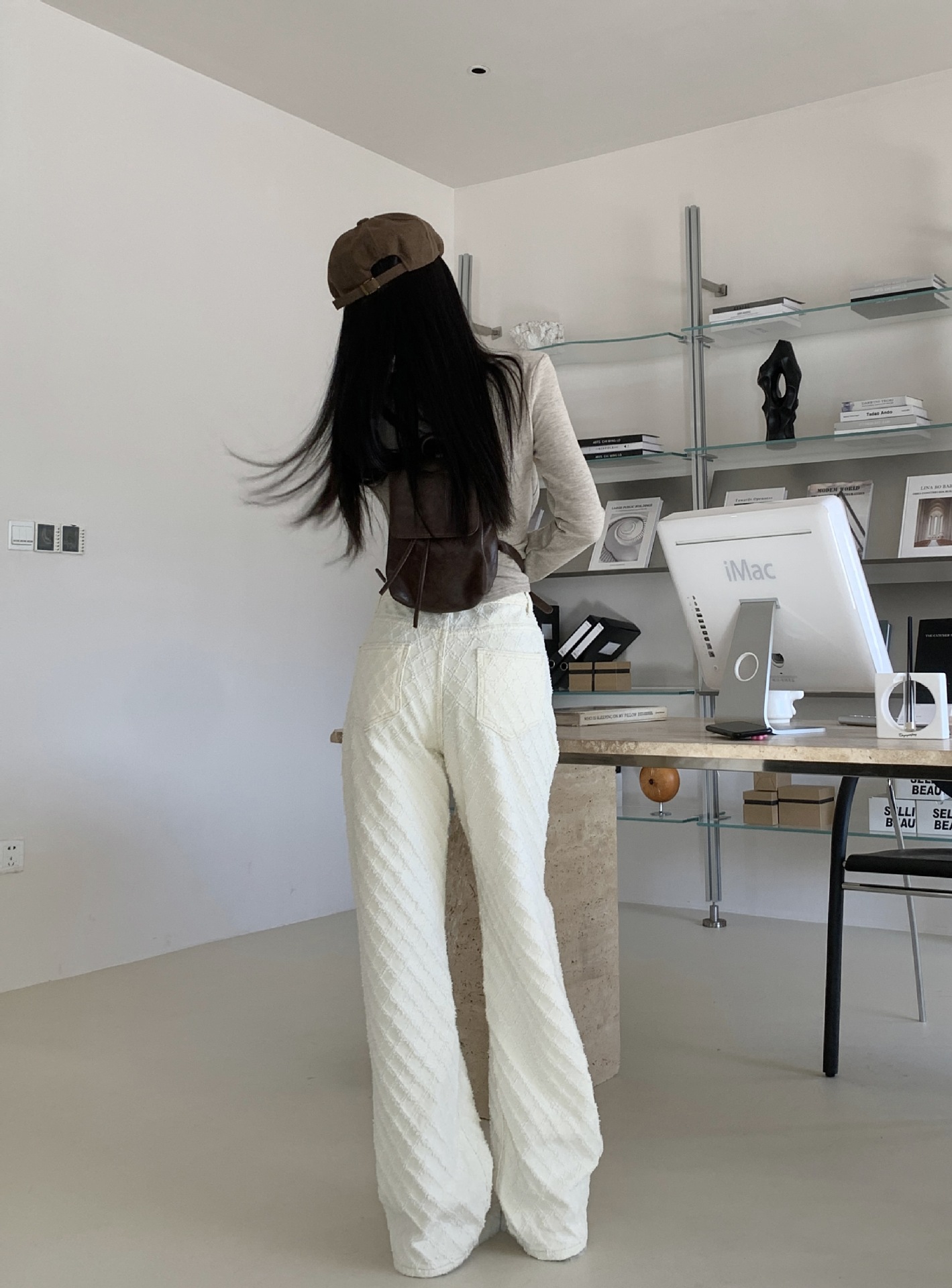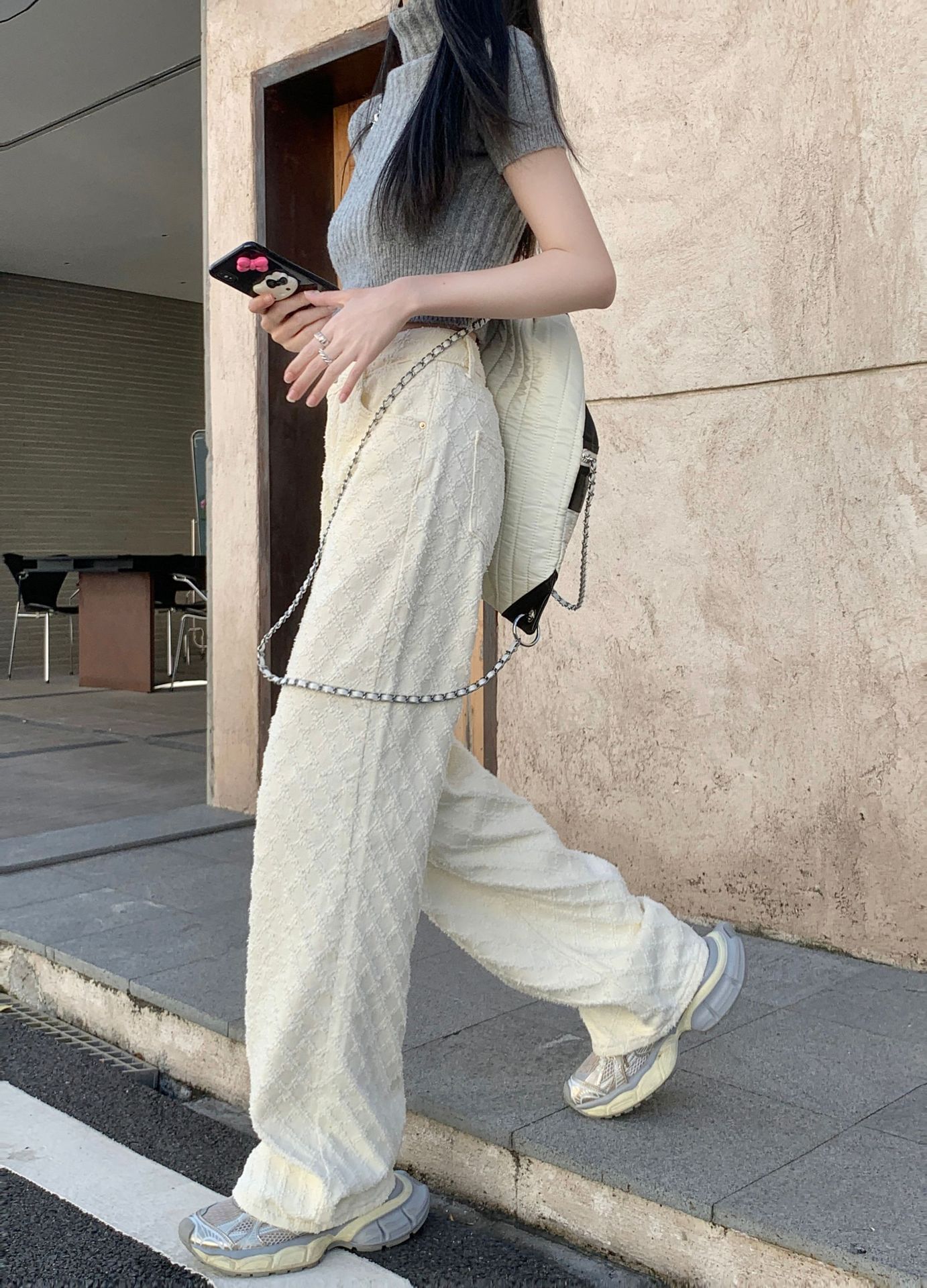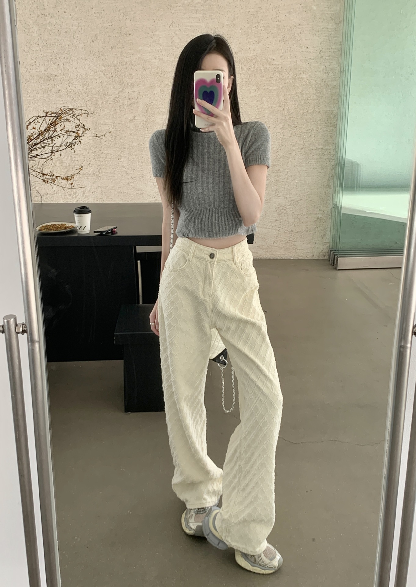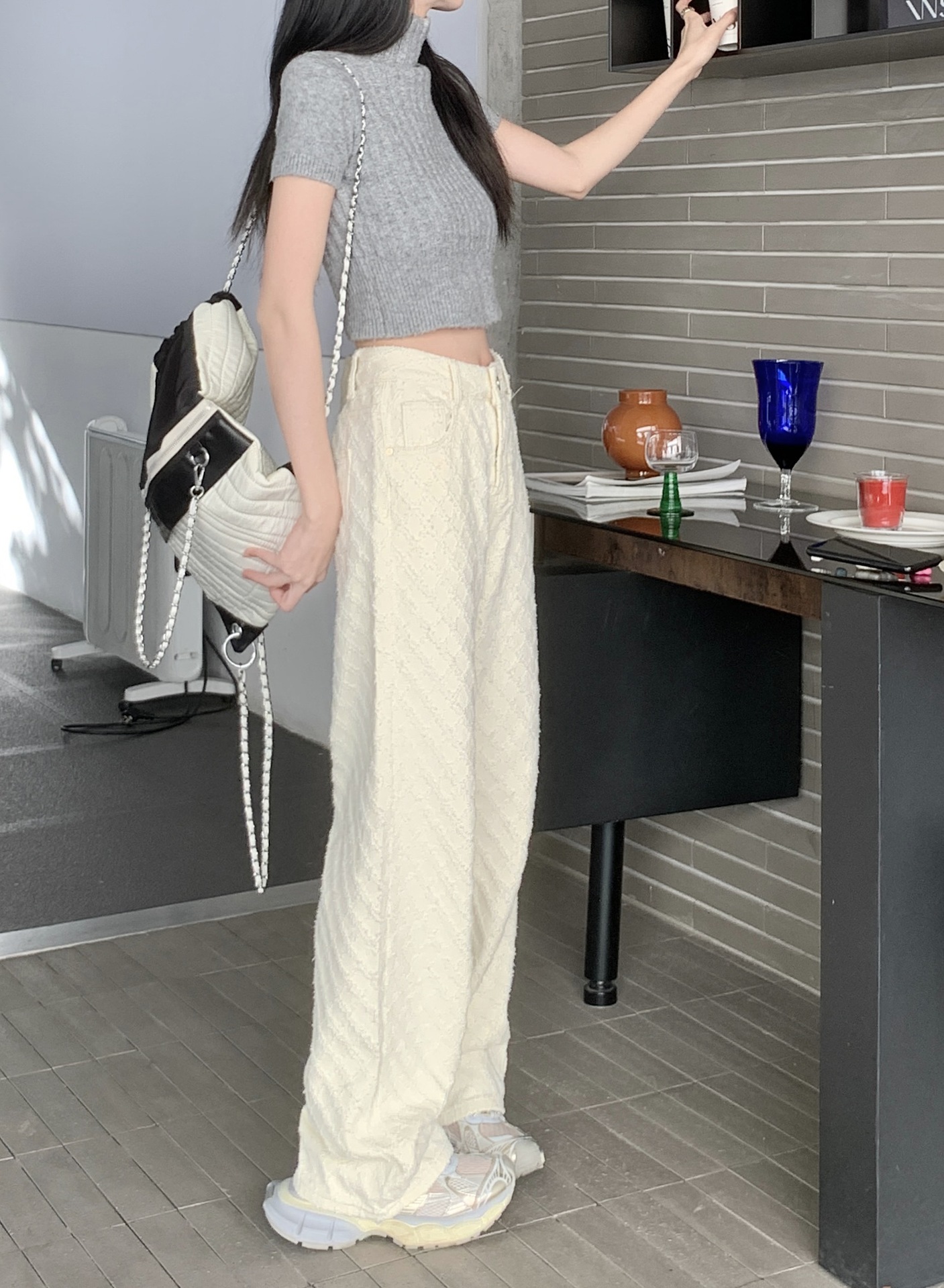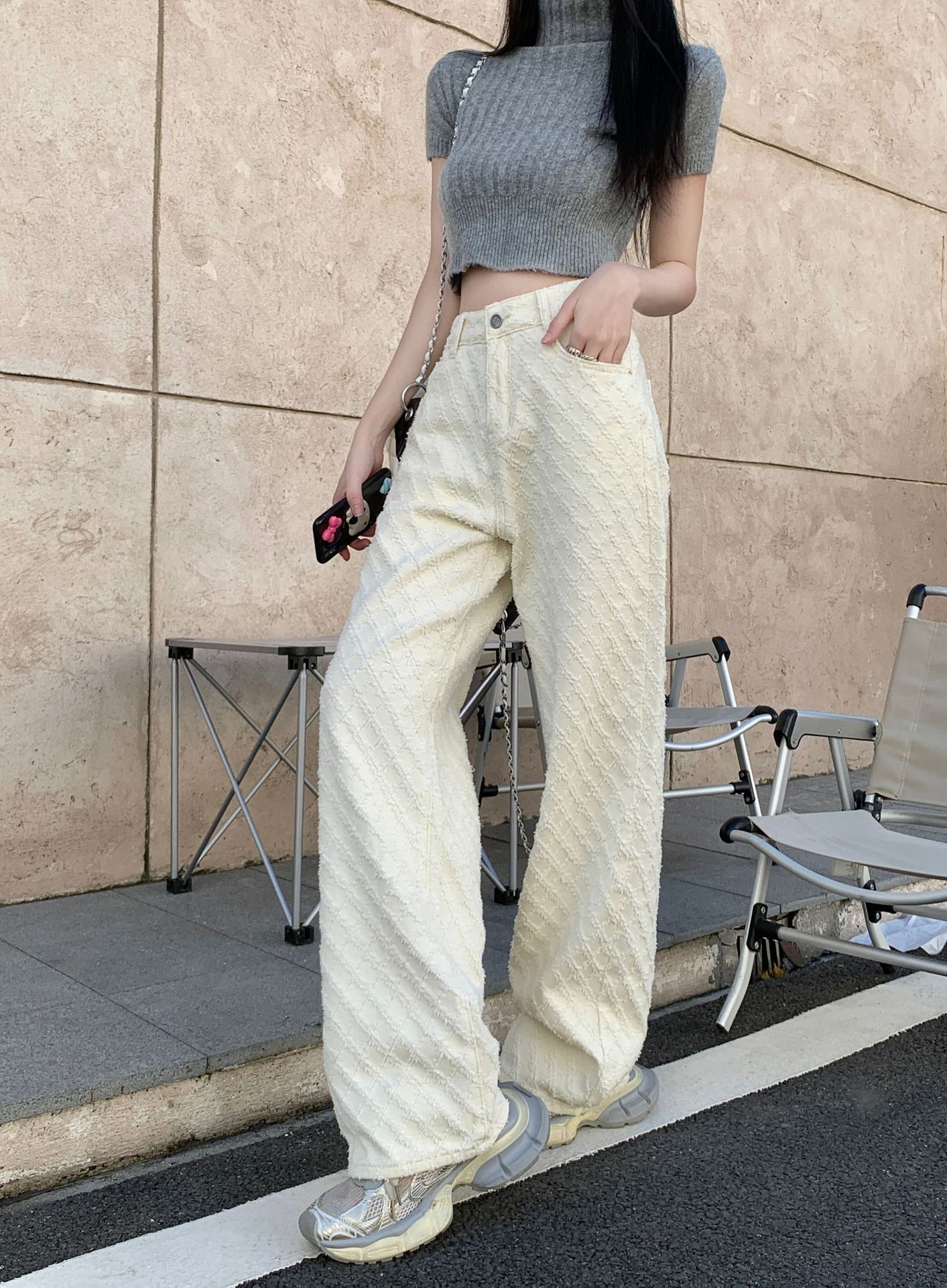 디자인 센스 향기로운 스타일 격자 무늬 화이트 높은 허리 다이아몬드 격자 무늬 청바지 여성의 새로운 자카드 슬리밍 넓은 다리 바지