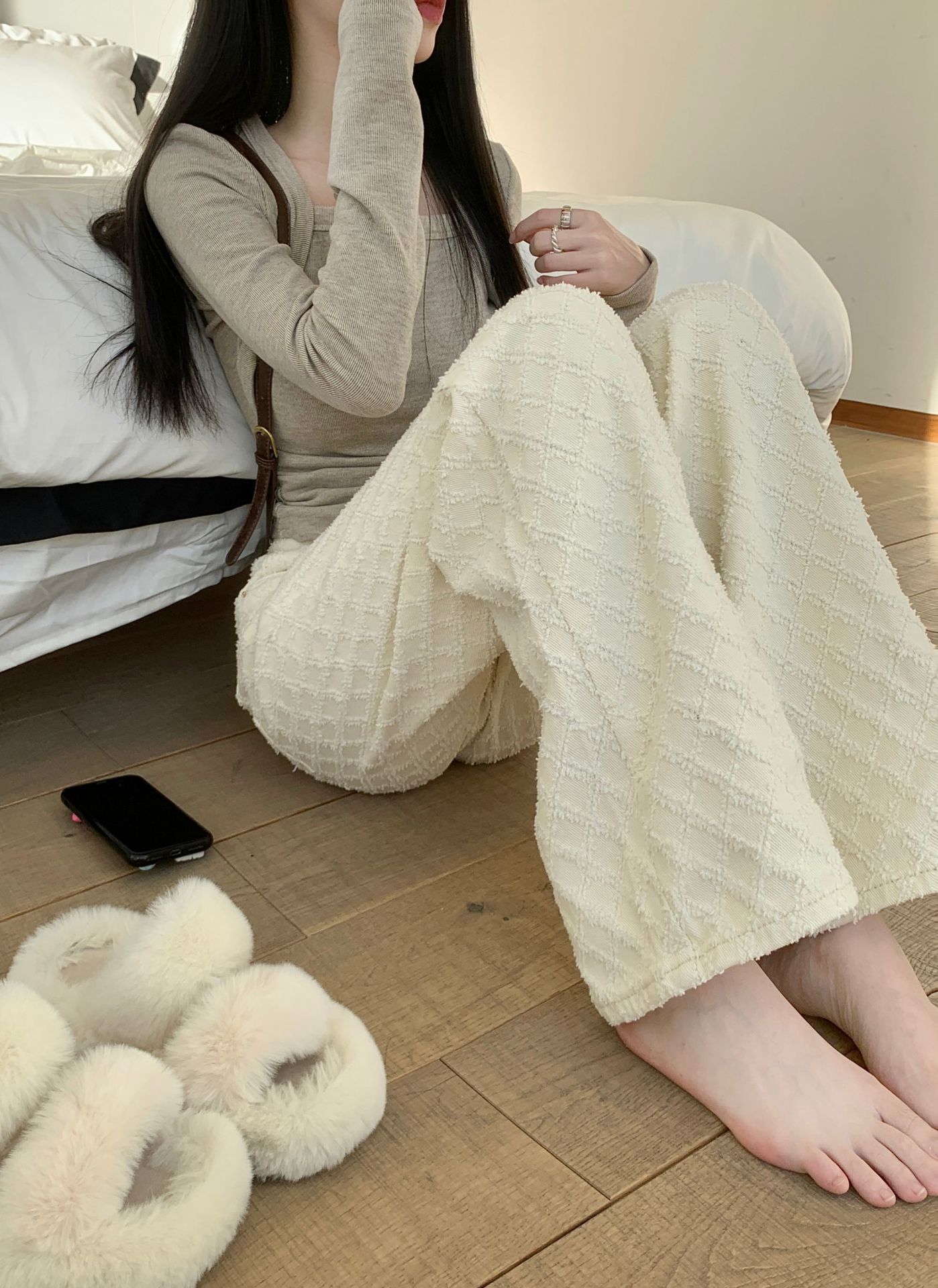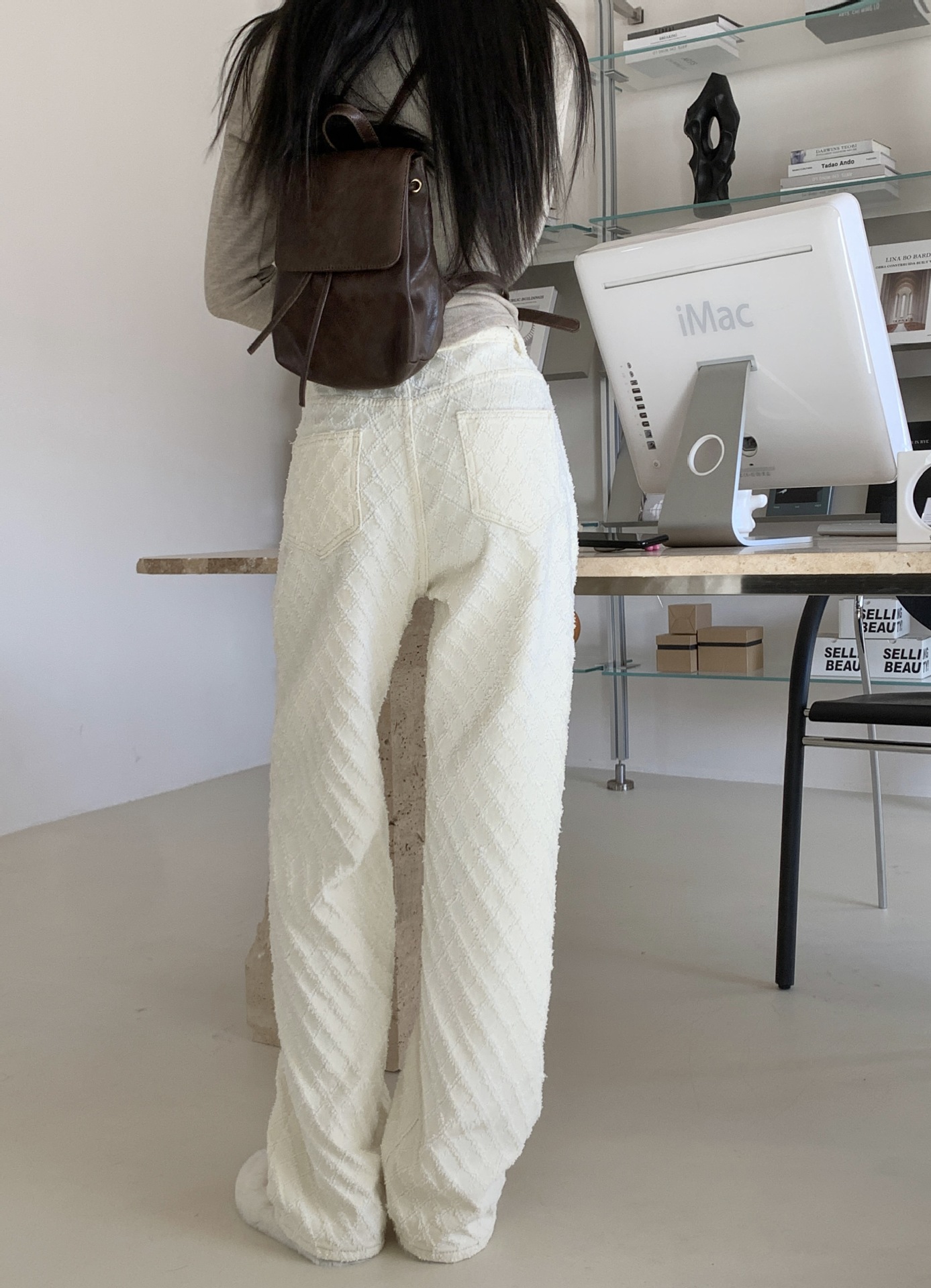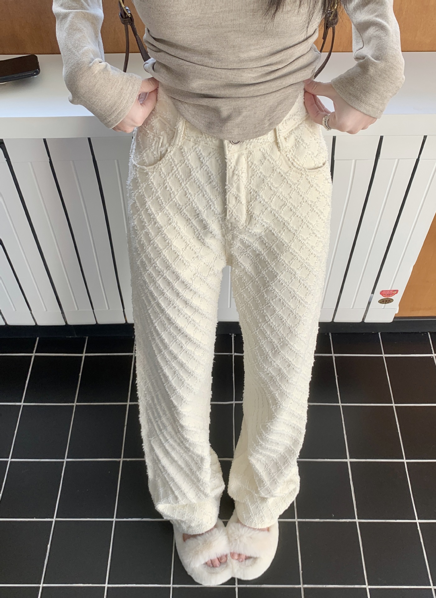 디자인 센스 향기로운 스타일 격자 무늬 화이트 높은 허리 다이아몬드 격자 무늬 청바지 여성의 새로운 자카드 슬리밍 넓은 다리 바지스토어 가기