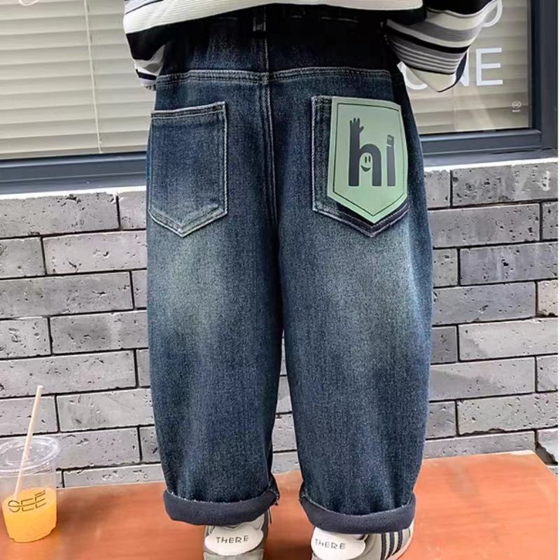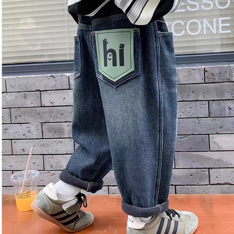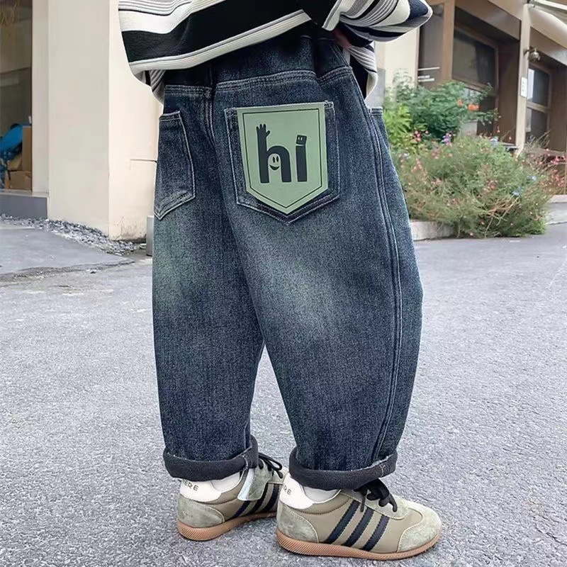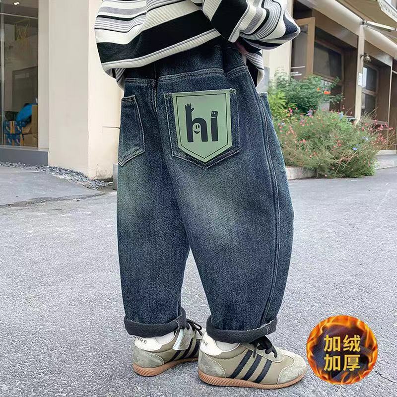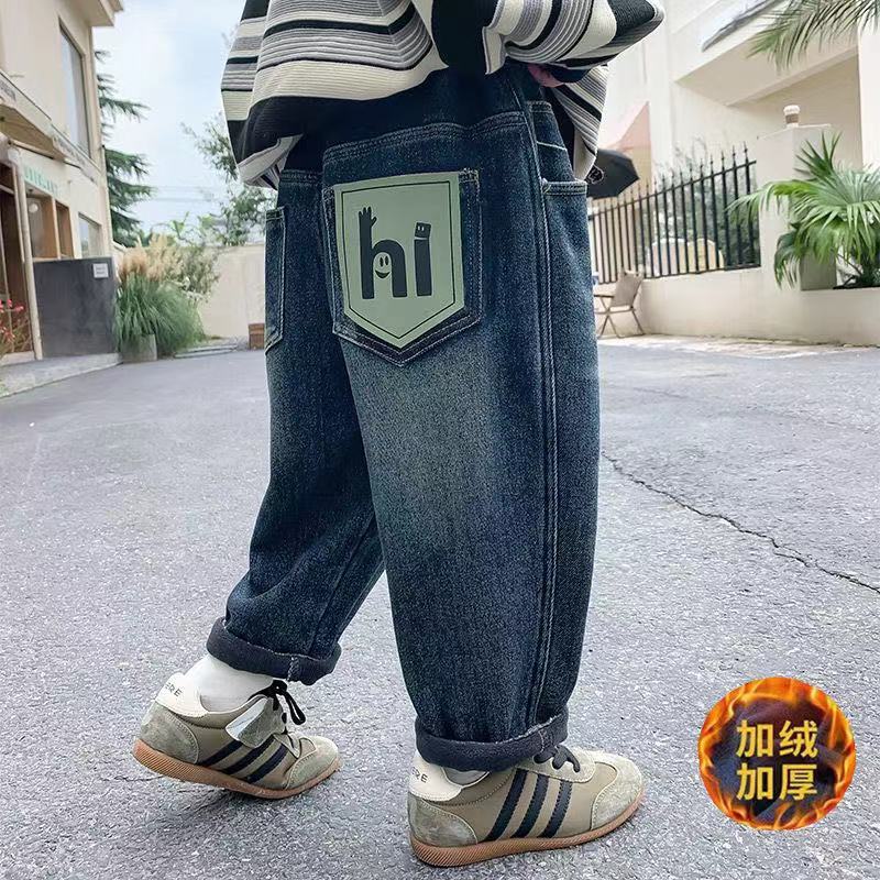 소년의 청바지 2024 기모 새로운 어린이의 간단한 가을과 겨울 한 조각 벨벳 데님 캐주얼 바지 남자 보물 아빠 바지스토어 가기