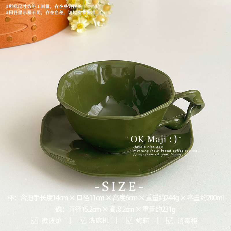 • 불규칙한 손으로 꼬집은 커피 컵과 접시 - 녹색