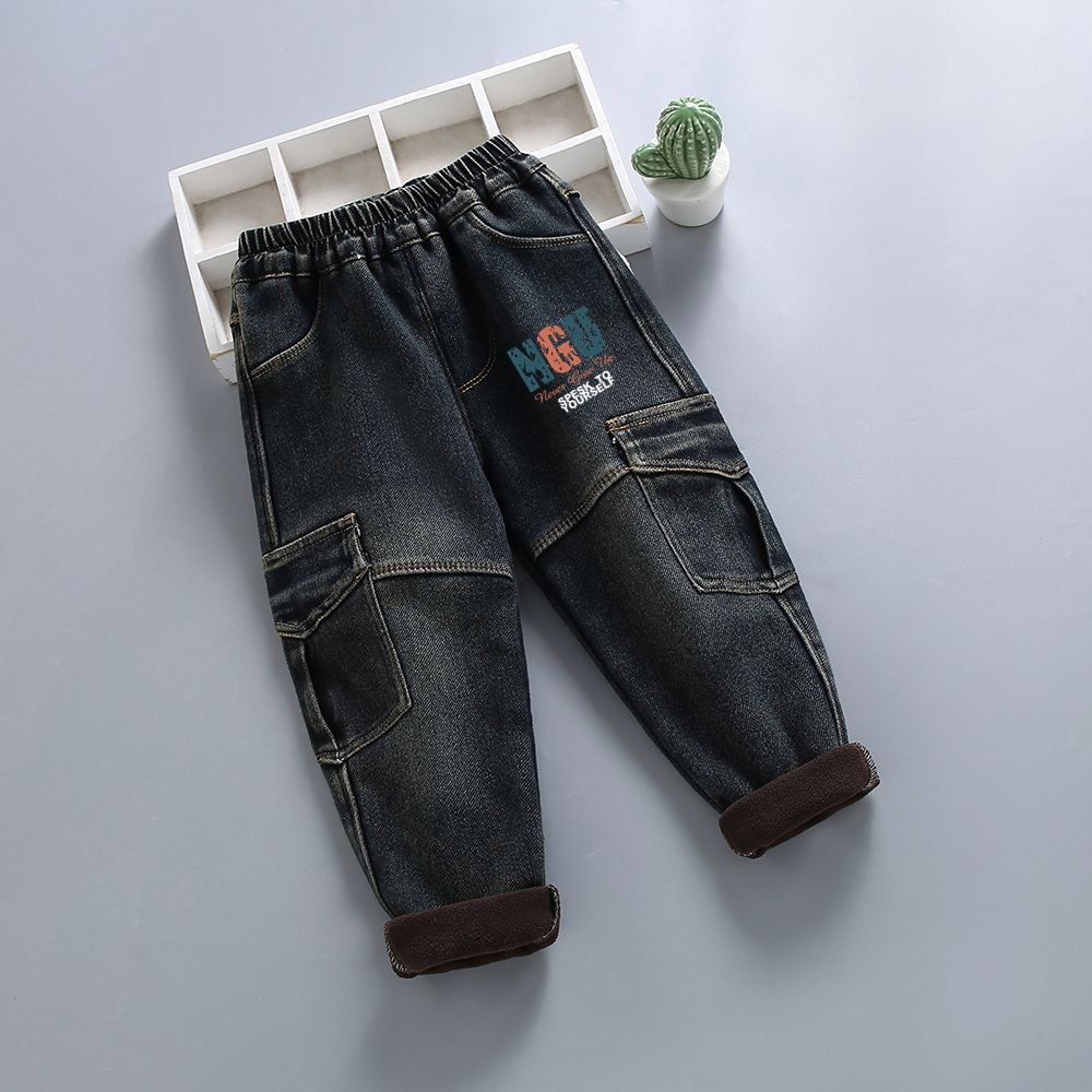 남자 기모 청바지 가을 겨울 새로운 도착 작업복 포켓 남성 아기 외부 착용 데님 바지 두꺼운 데님
