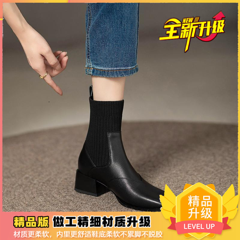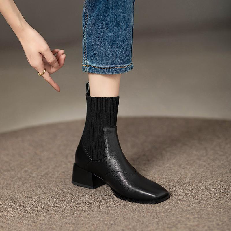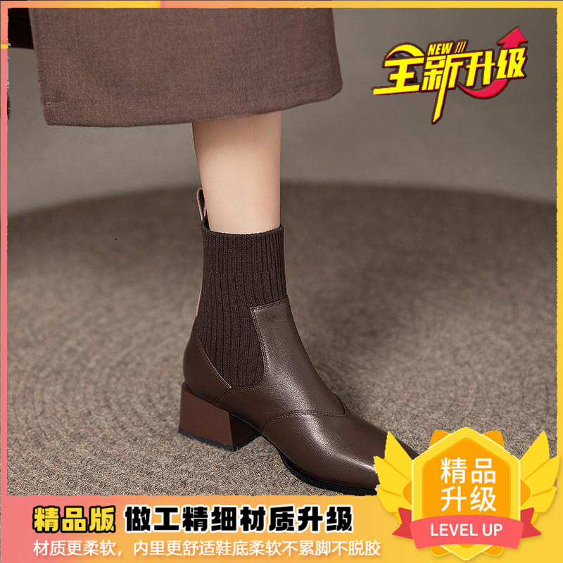 프렌치 레트로 작은 발목 부츠 스키니 부츠 짧은 부츠 다크 브라운 소프트 가죽 마틴 부츠 여성용 니트 스트레치 부츠 두꺼운 미드 힐 양말 부츠스토어 가기
