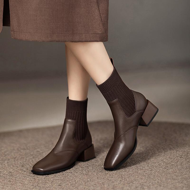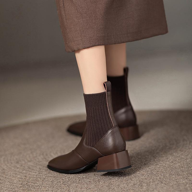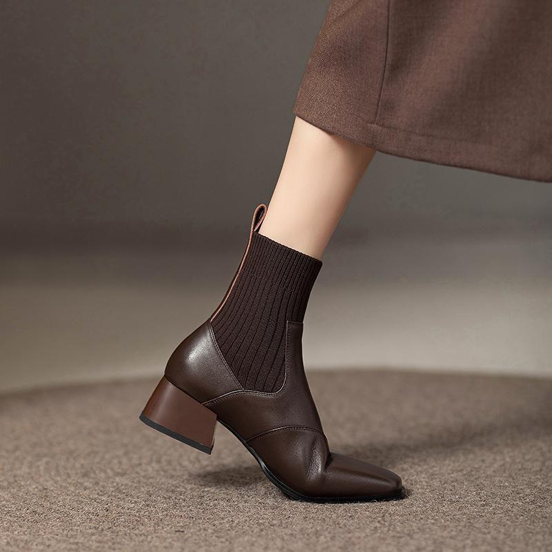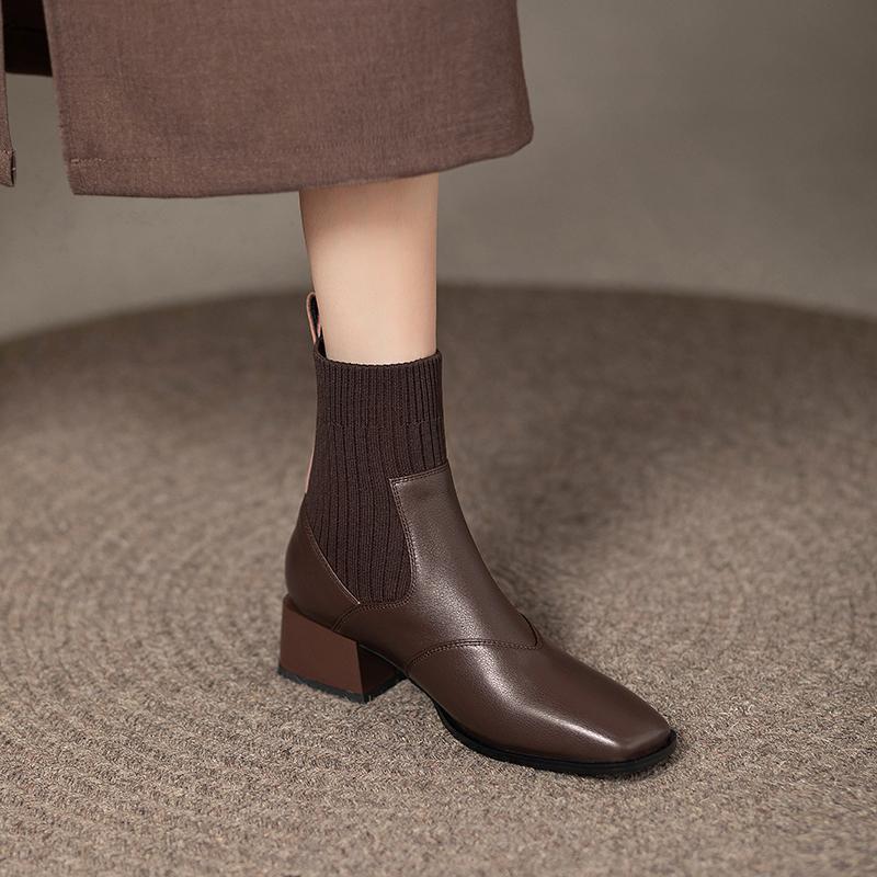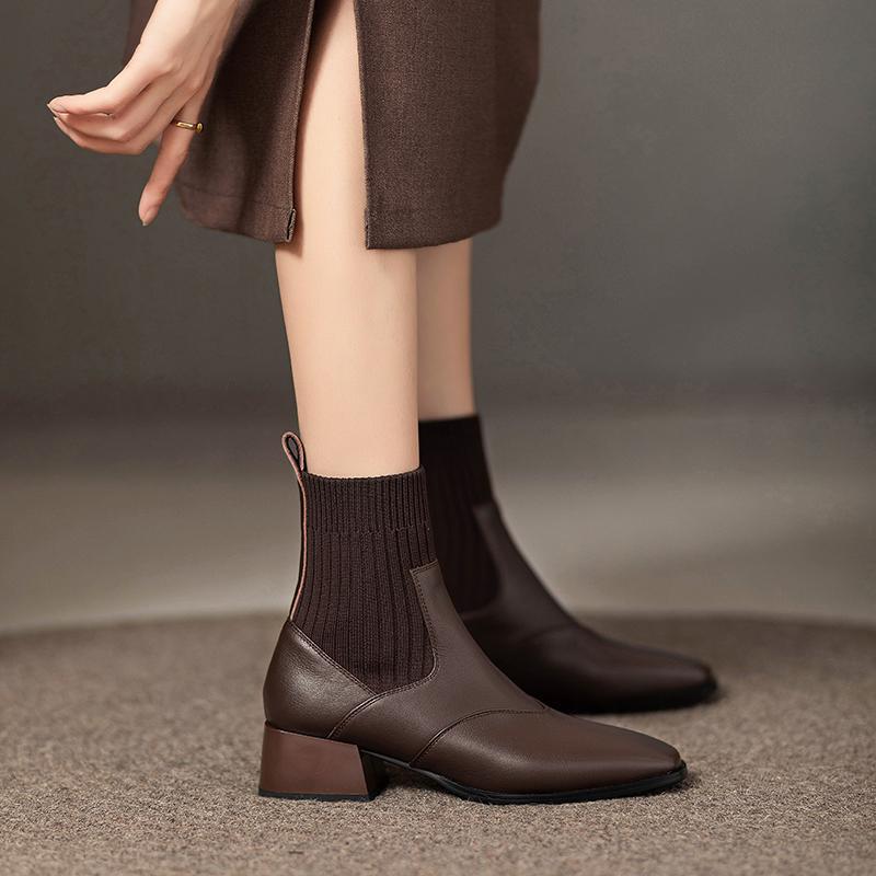 프렌치 레트로 작은 발목 부츠 스키니 부츠 짧은 부츠 다크 브라운 소프트 가죽 마틴 부츠 여성용 니트 스트레치 부츠 두꺼운 미드 힐 양말 부츠