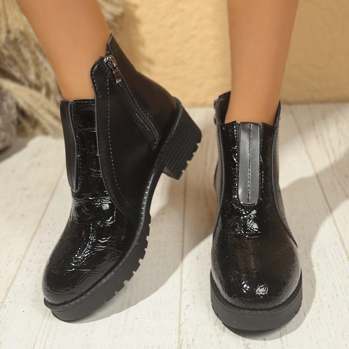 유럽과 미국의 대외 무역 가을과 겨울 새로운 밝은 마틴 부츠 두꺼운 바닥 두꺼운 힐 사이드 지퍼 플러스 사이즈 여성을위한 편안한 올 매치 패션 부츠스토어 가기
