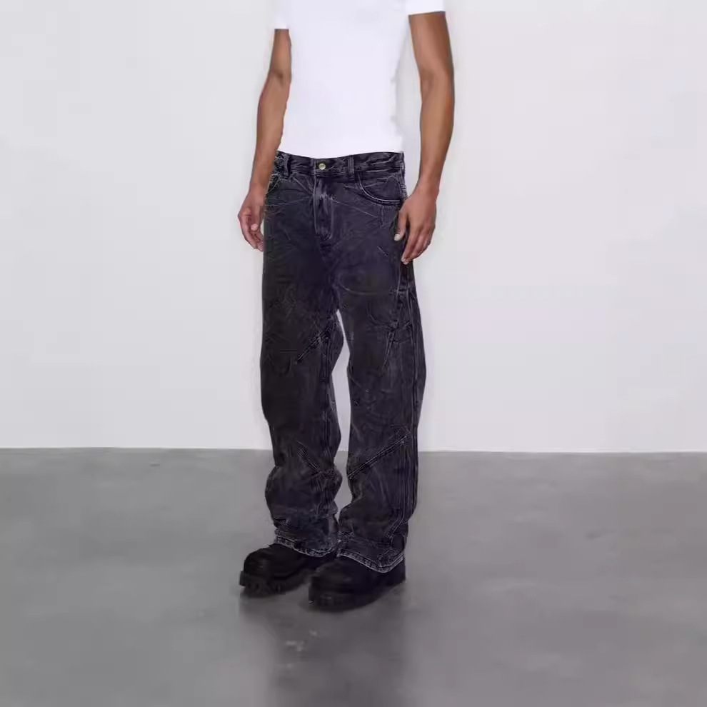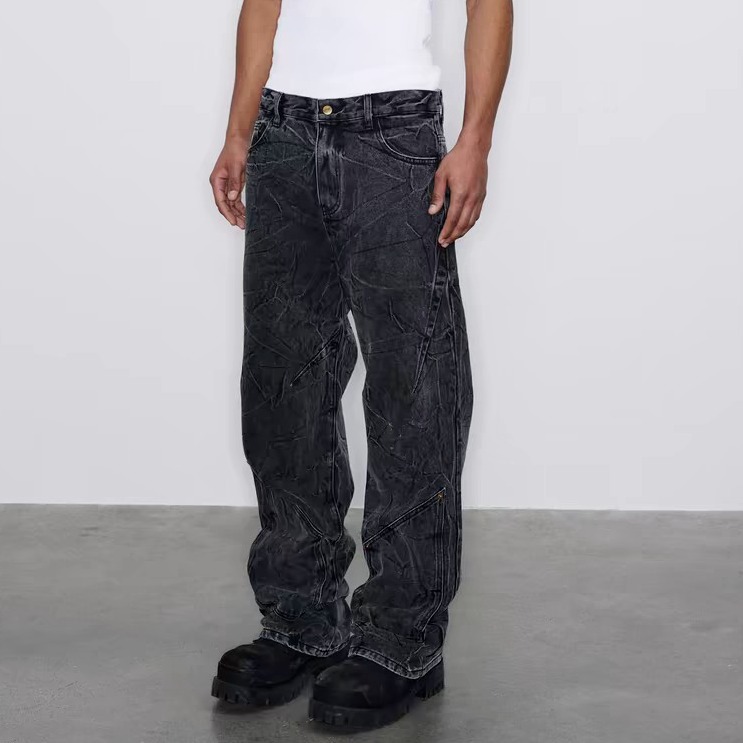 아메리칸 스타일 클렌핏 빈티지 눈송이 세탁 청바지 남성 중공업 옷을 입은 워터 웨이브 폴딩 패턴 바이브 스트레이트 팬츠