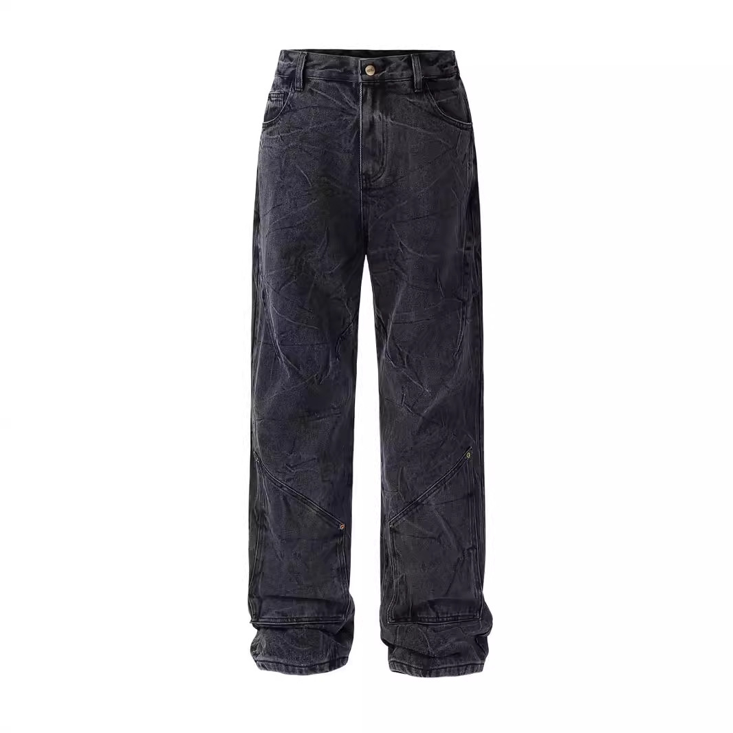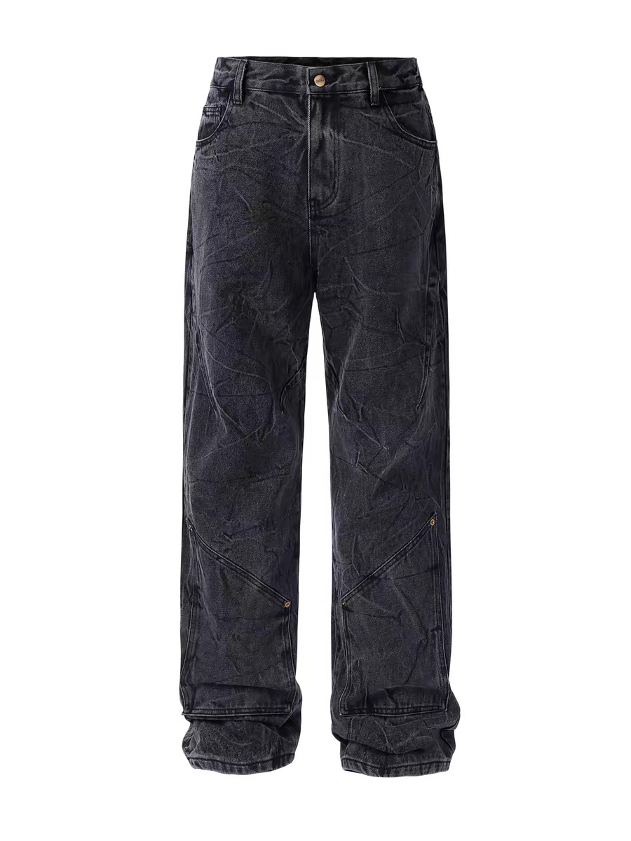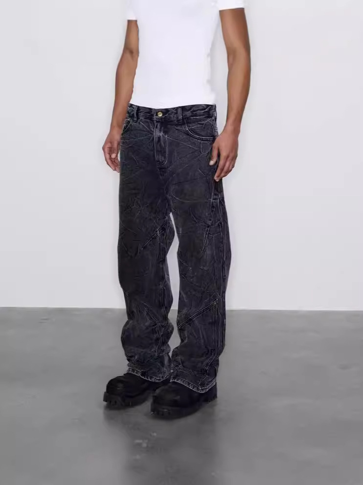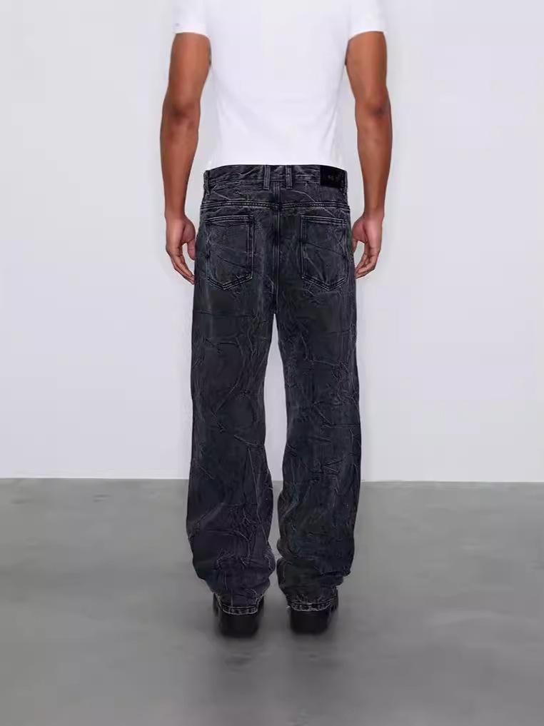 美式cleanfit复古雪花水洗牛仔裤男重工做旧水波纹折纹vibe直筒裤