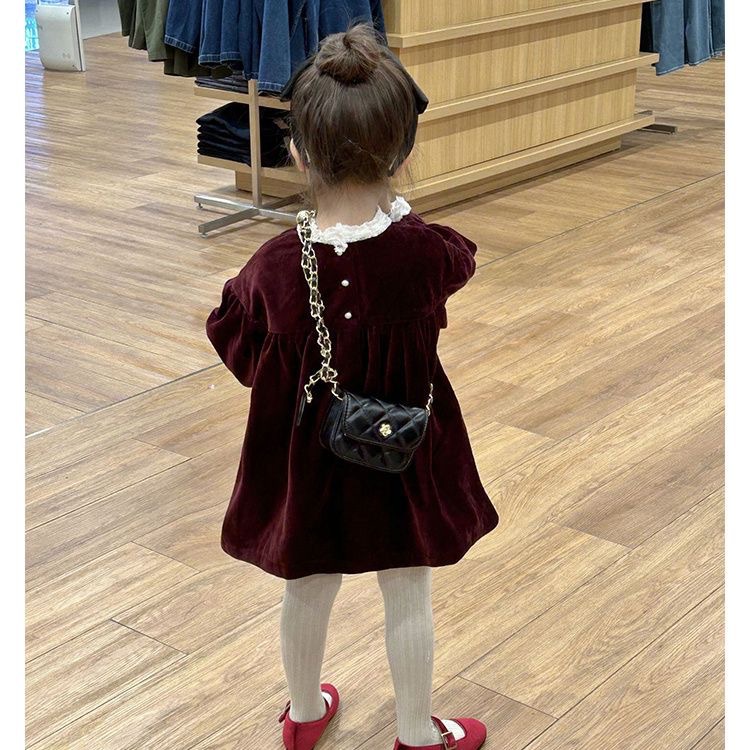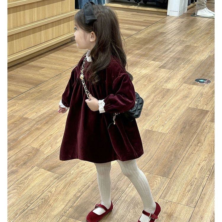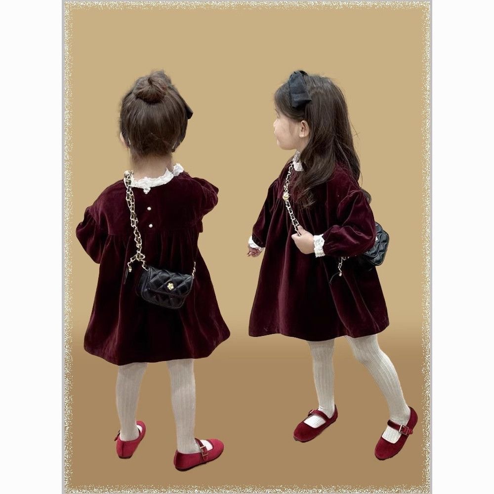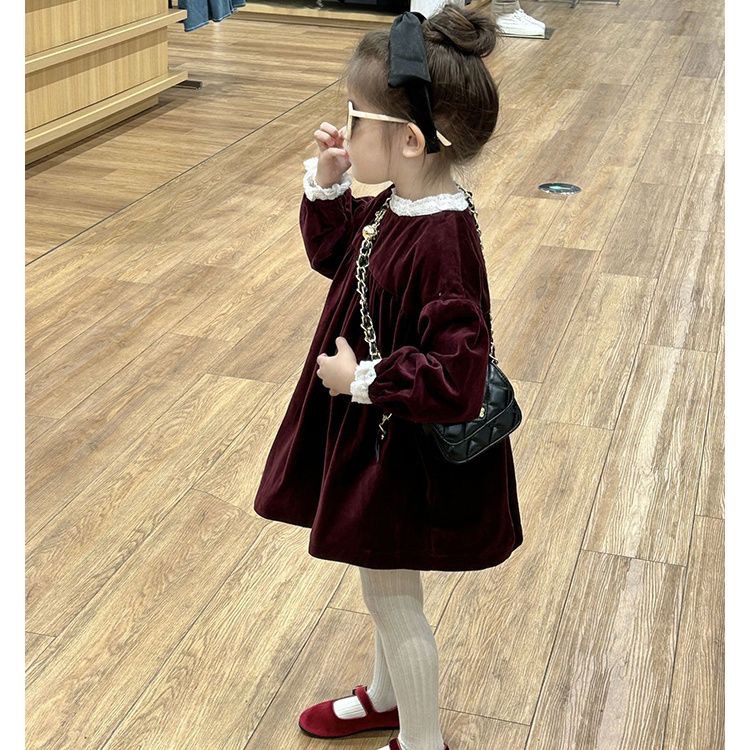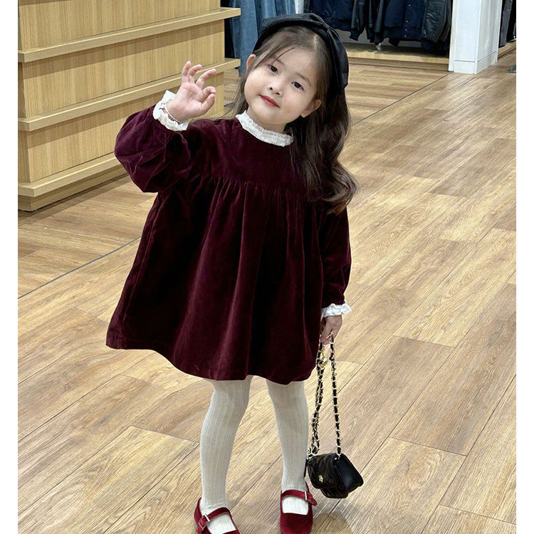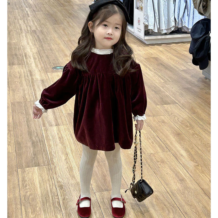 아동복 가을과 겨울 새로운 여성 바오양 스타일 스커트 소녀 벨벳 레이스 원피스 귀여운 매트 버건디 공주 원피스스토어 가기