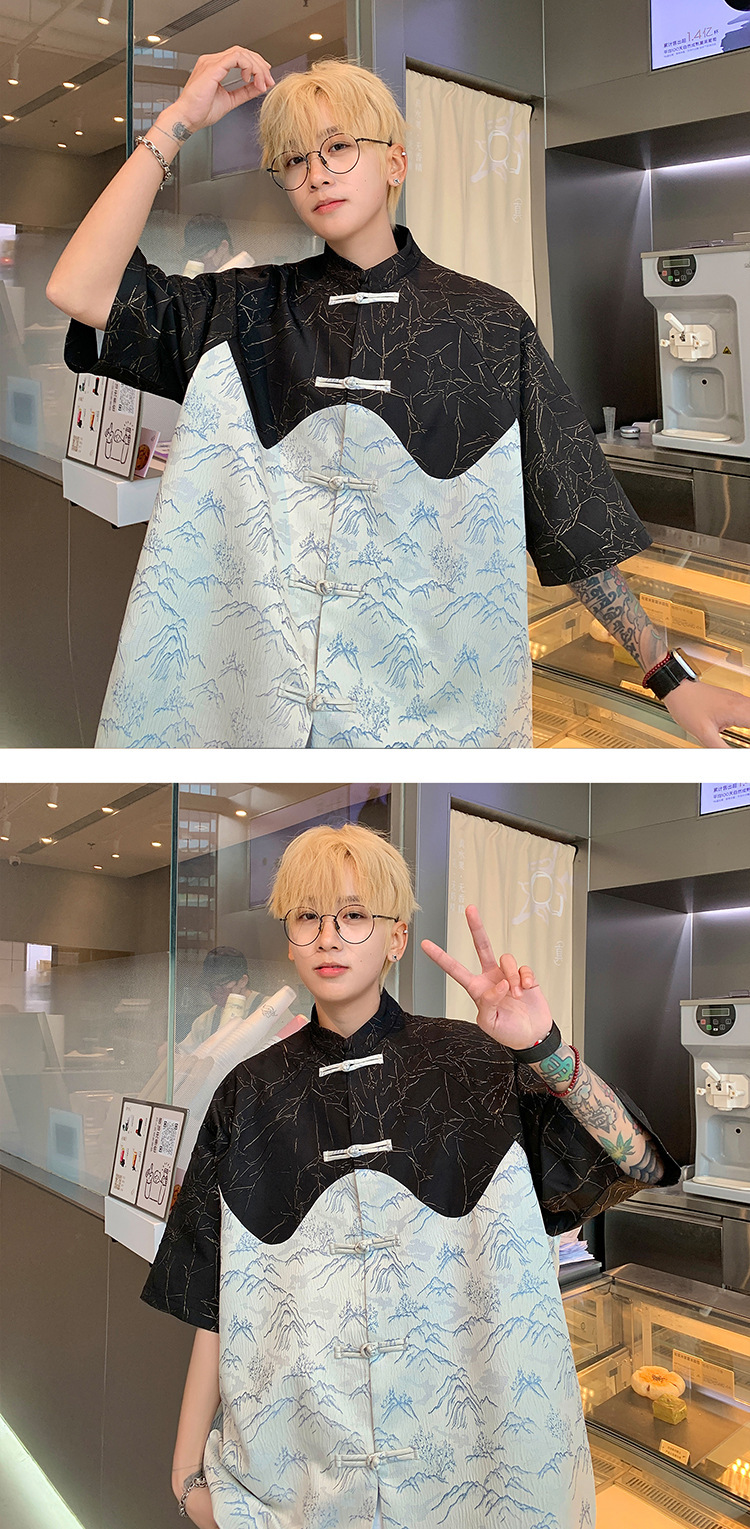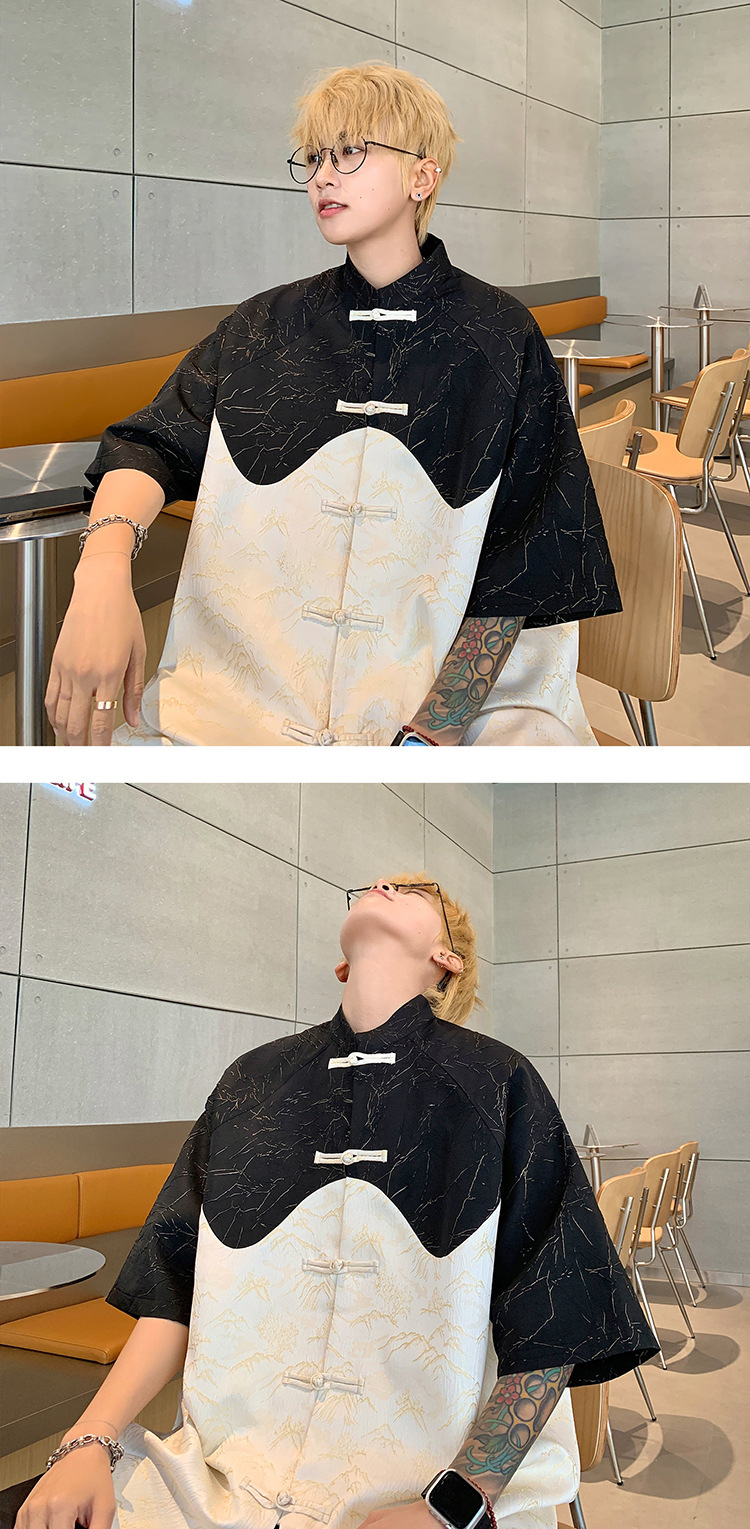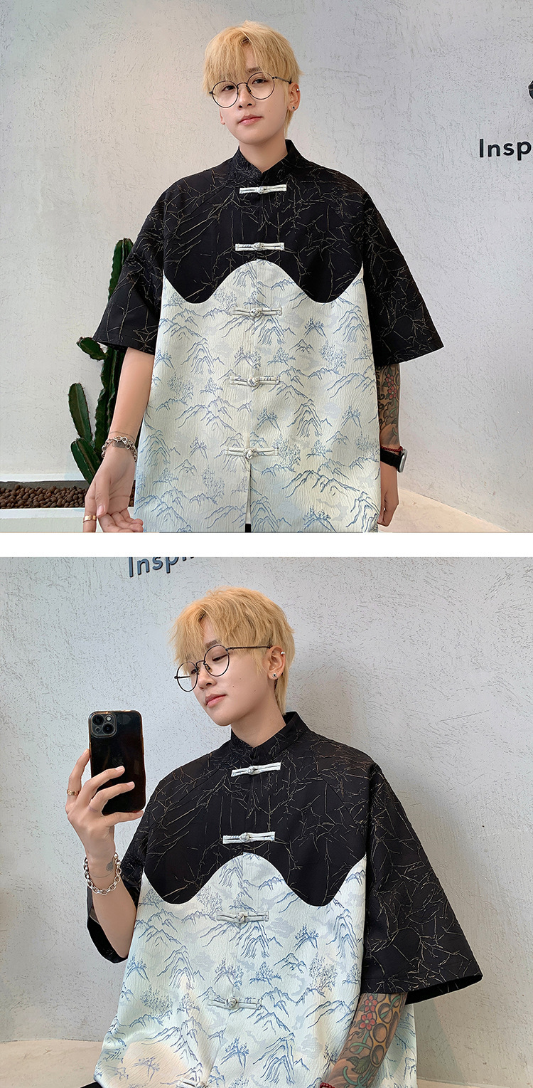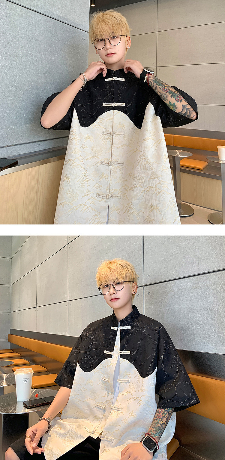 새로운 중국 스타일 국가 스타일 반팔 셔츠 남자 2024 년 여름 새로운 스티칭 대비 컬러 버클 중산 탕 원피스 반소매 셔츠스토어 가기