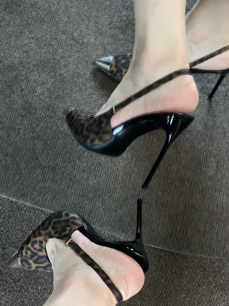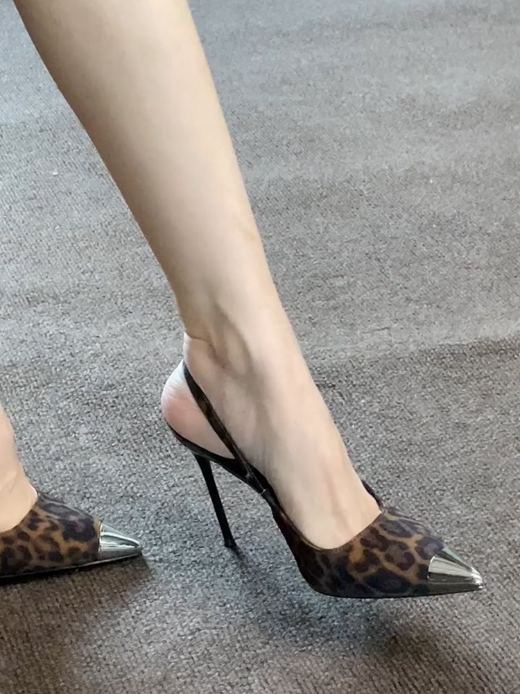 2025 봄 여름 신상 레오파드 프린트 메탈 토 섹시 하이힐, 우아한 스타일의 뒤트임 슬림힐 샌들 여성용스토어 가기