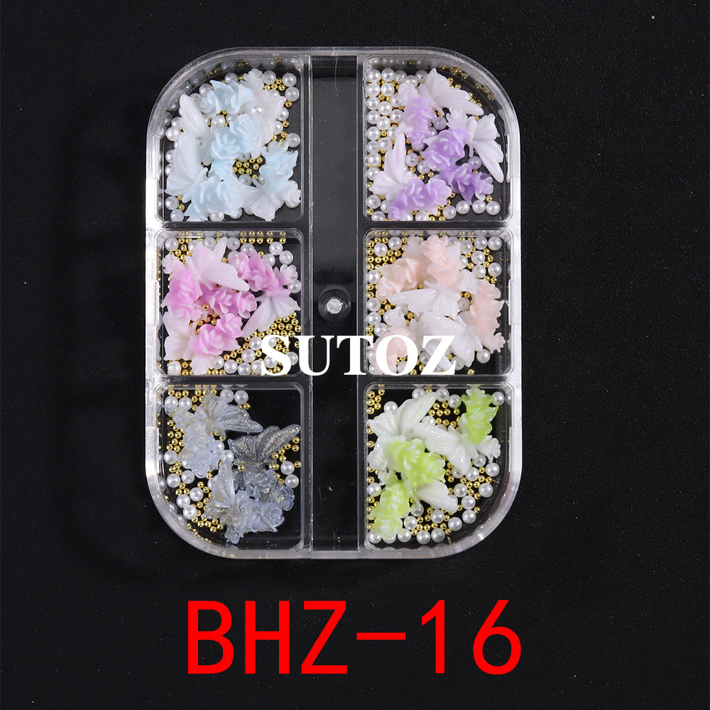 국경 뉴 네일 쥬얼리 도매 6 박스 3 차원 꽃잎 나비 진주 스틸 볼 혼합 네일 쥬얼리