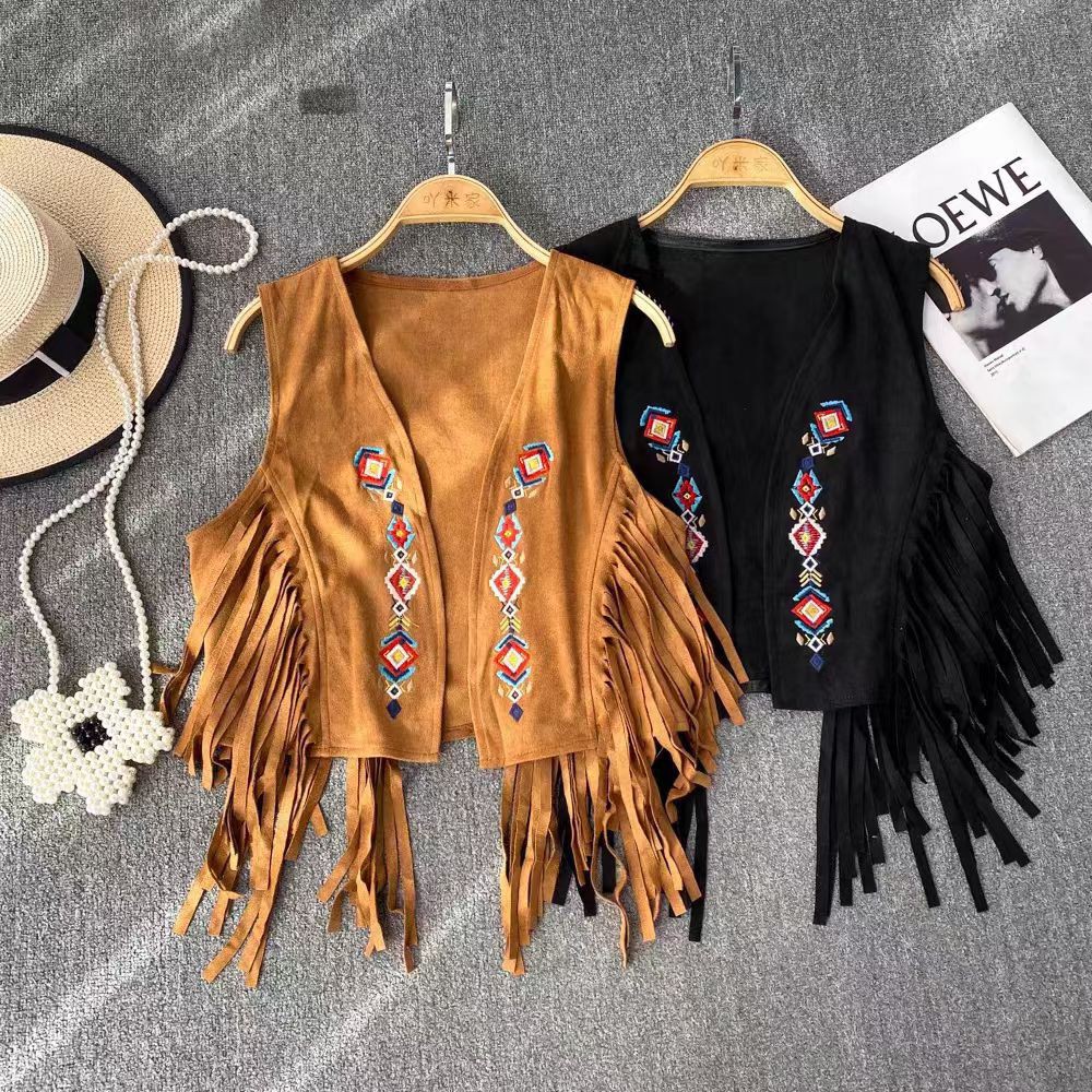 패션 가을과 겨울 서양 데님 Deerskin 벨벳 수놓은 술 민족 스타일 조끼 여성 캐주얼 재킷 코트