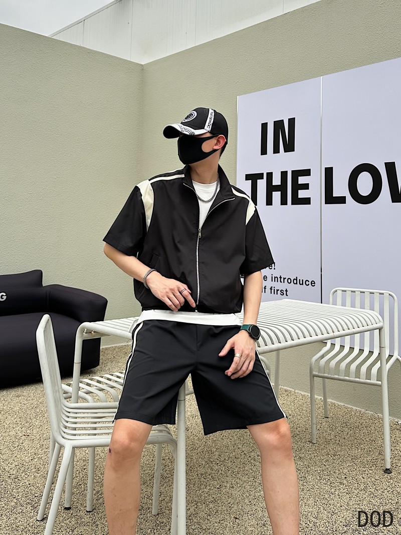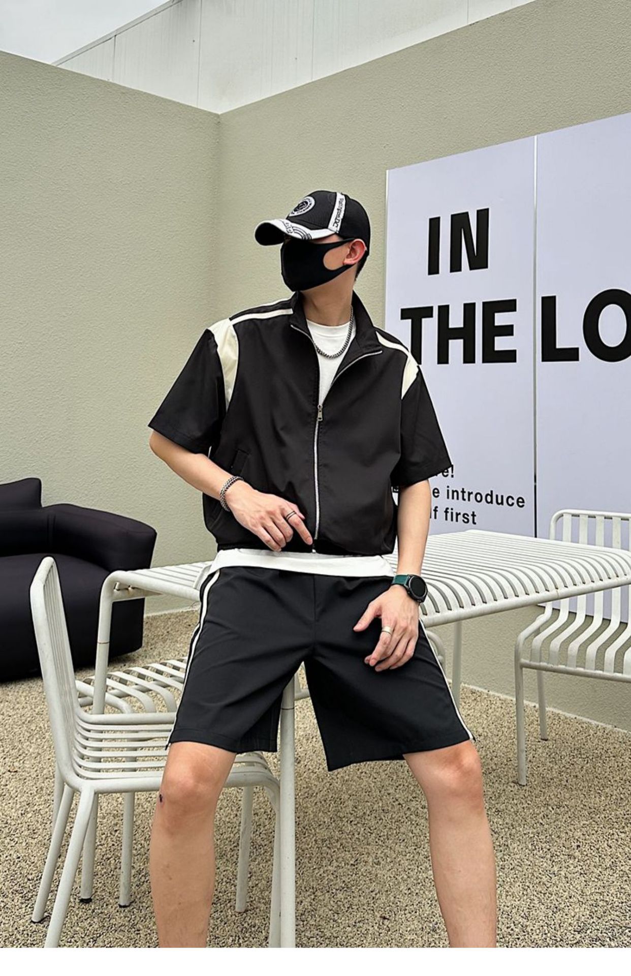 여름 새로운 반 높이 칼라 반팔 스포츠 세트 남성 패션 브랜드 패션 컬러 매칭 캐주얼 루즈 반바지 투피스 세트스토어 가기