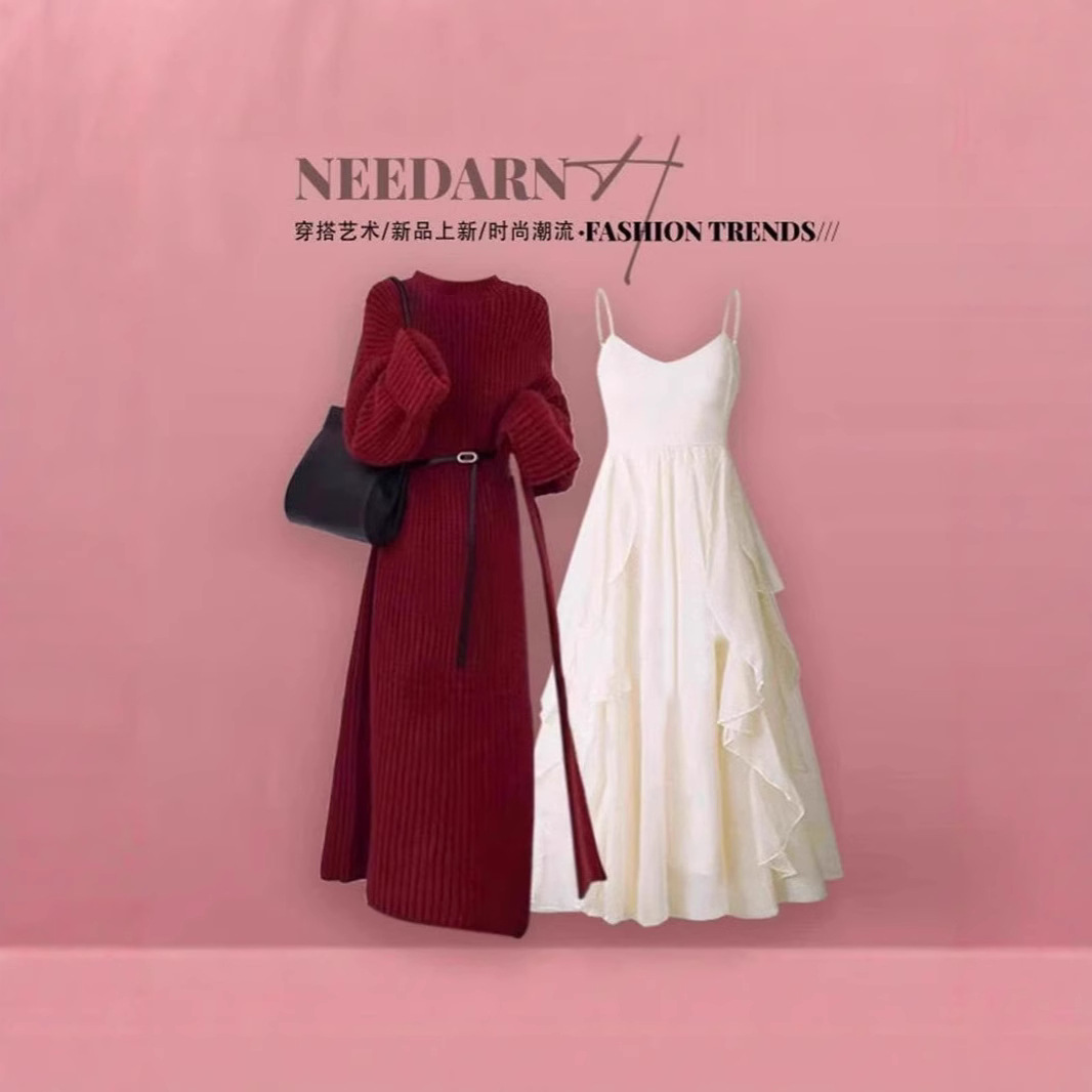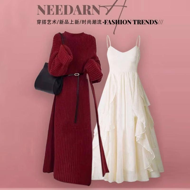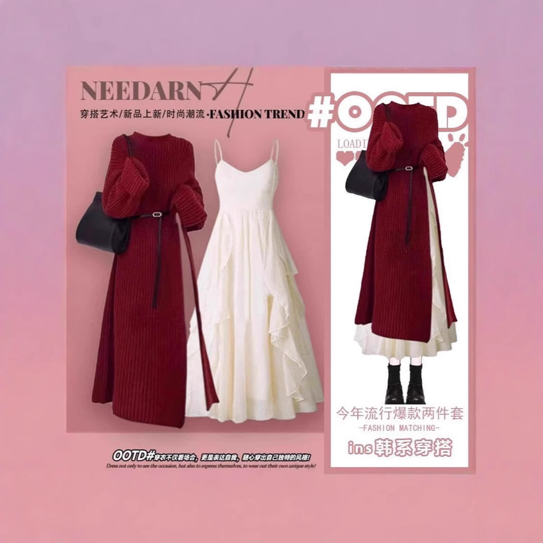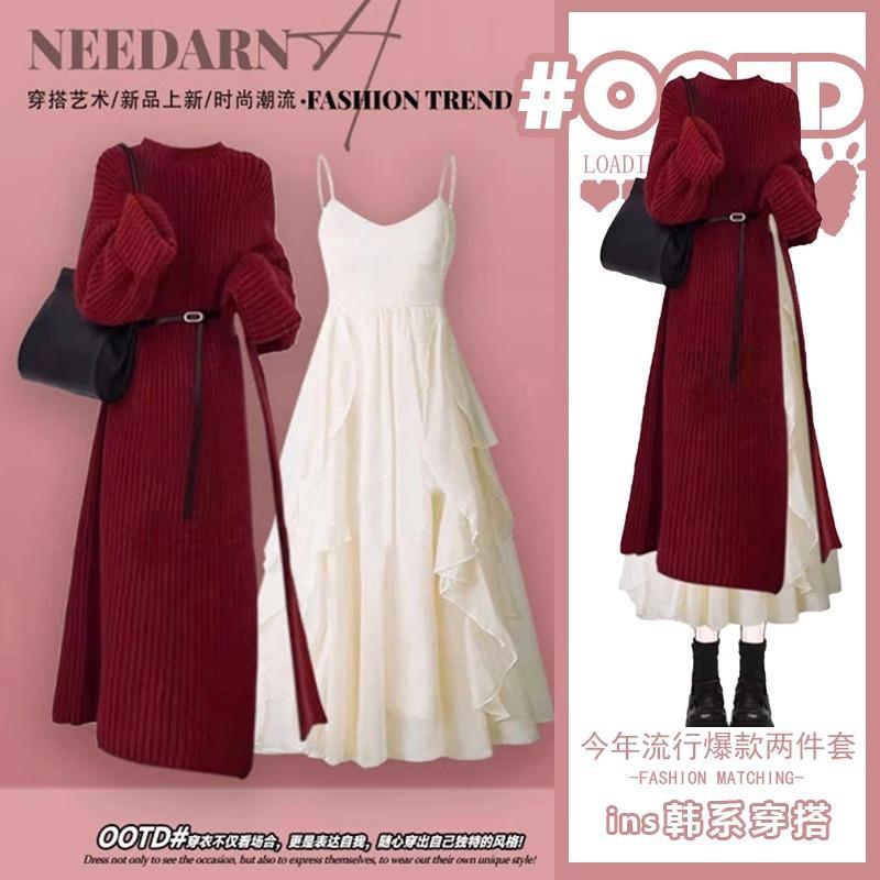 프랑스 원피스 여성 2024 새로운 작은 니트 스웨터 세트 긴 치마 세트가있는 가을과 겨울 옷스토어 가기