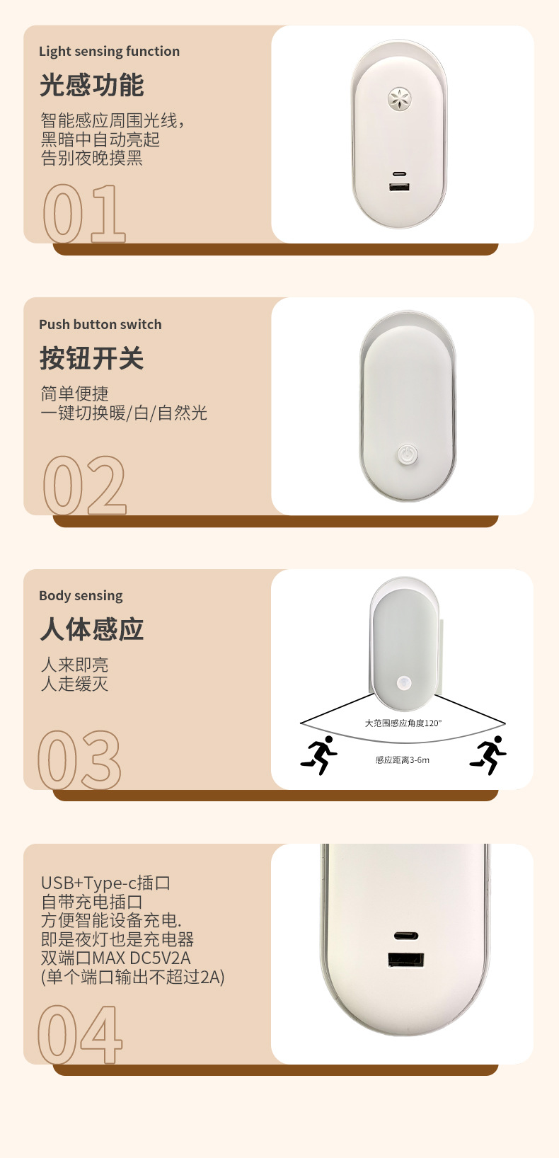 방 침실 타원형 야간 조명 유럽과 영국 벽 빛 따뜻한 빛 LED 플러그인 스마트 센서 빛 usb 조명 제어 야간 조명