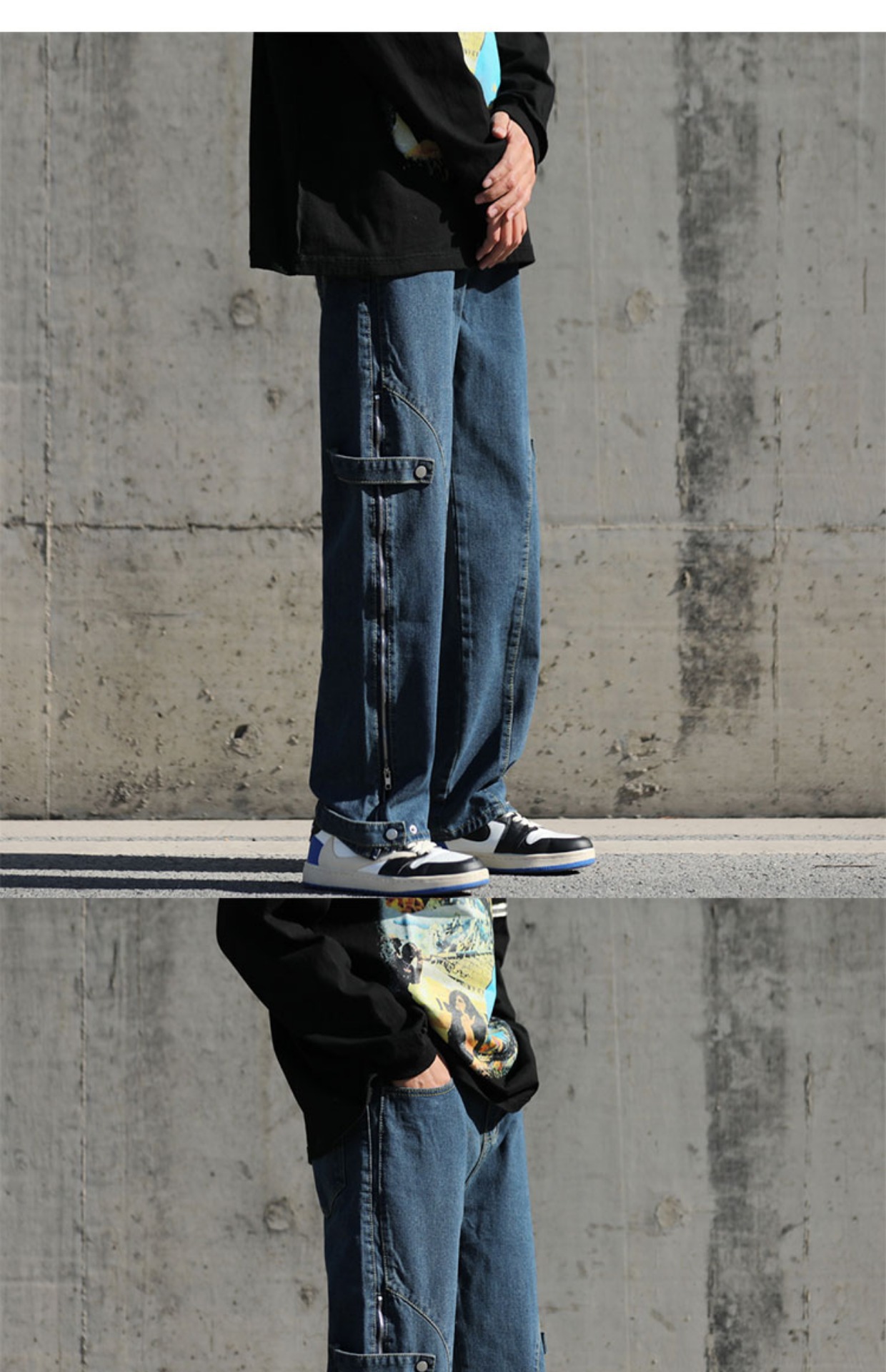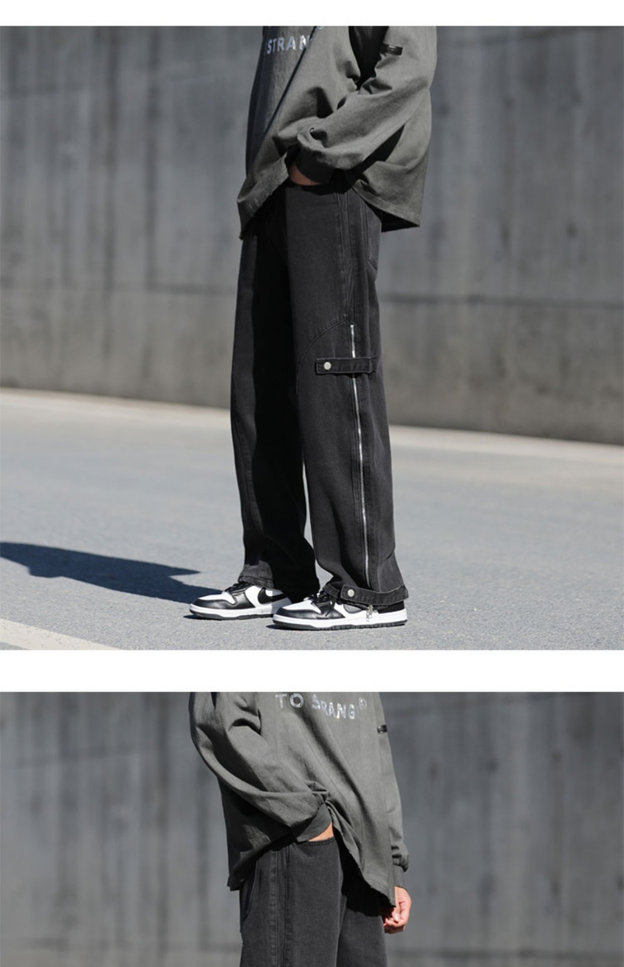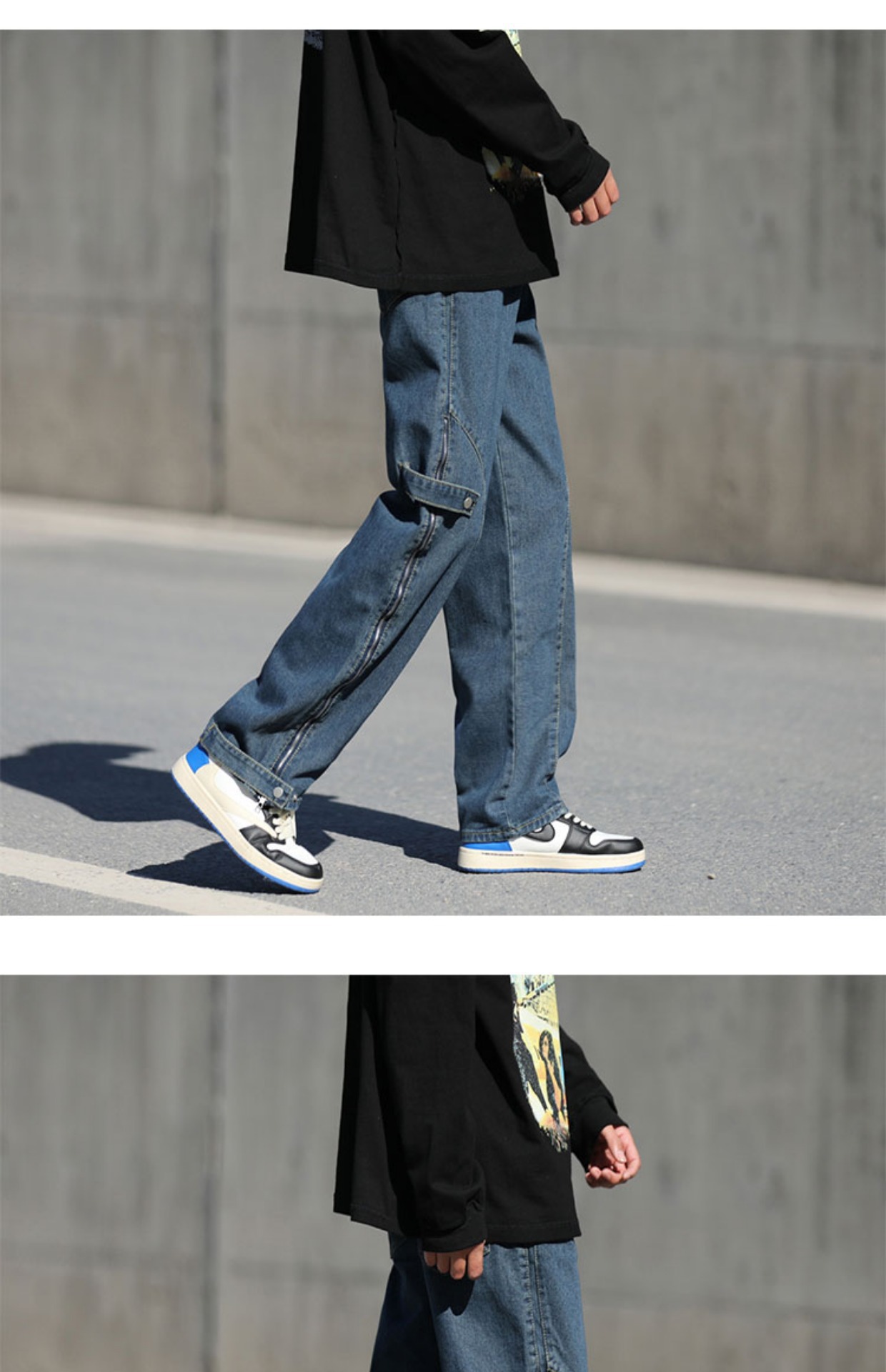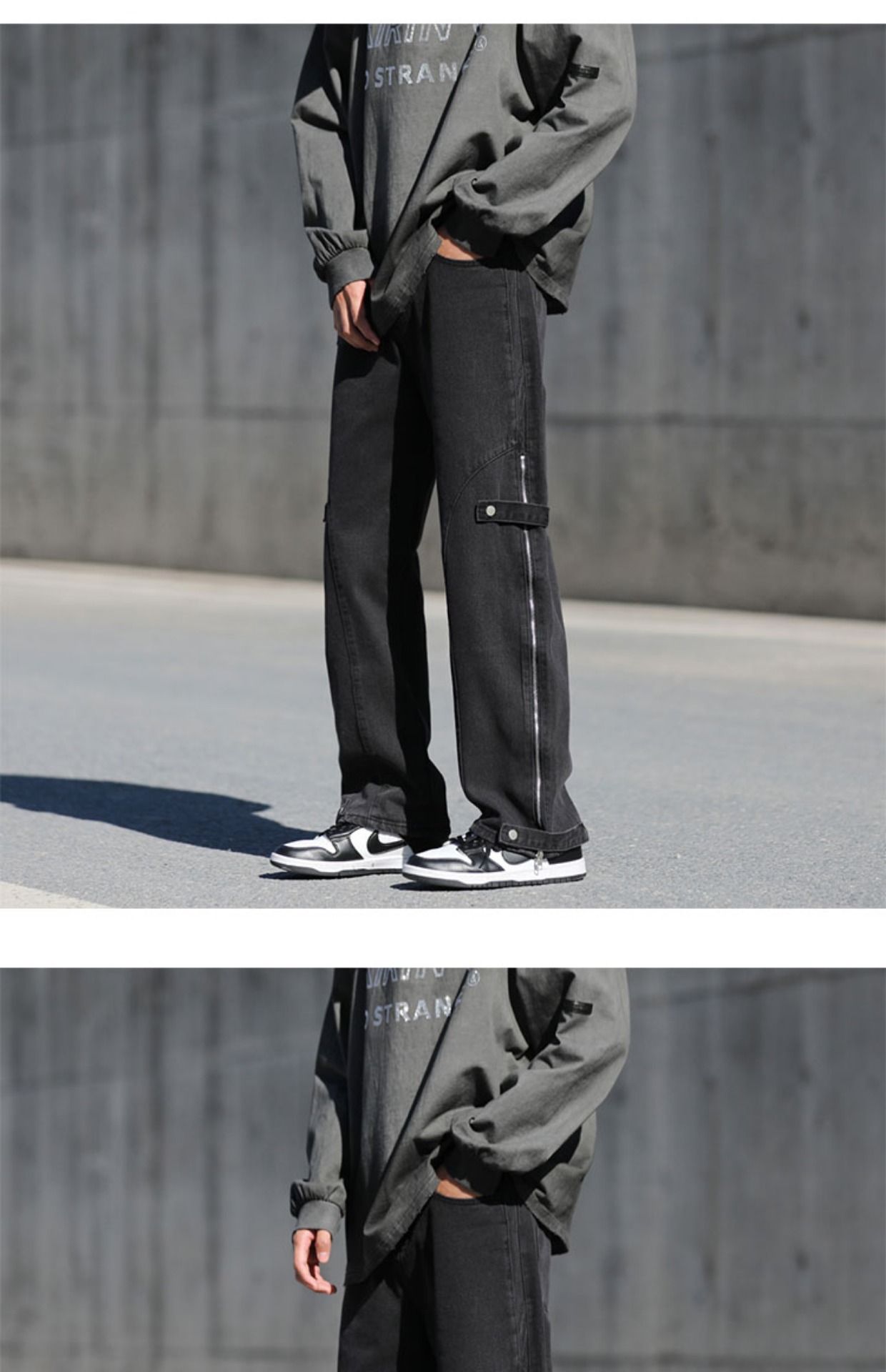 남성용 아메리칸 스타일 하이 스트리트 청바지 남성용 봄과 가을 지퍼 스플릿 스트레이트 팬츠 루즈 인 인기 브랜드 와이드 레그 팬츠