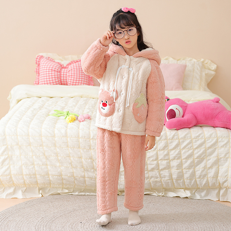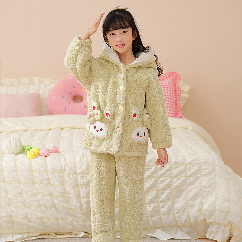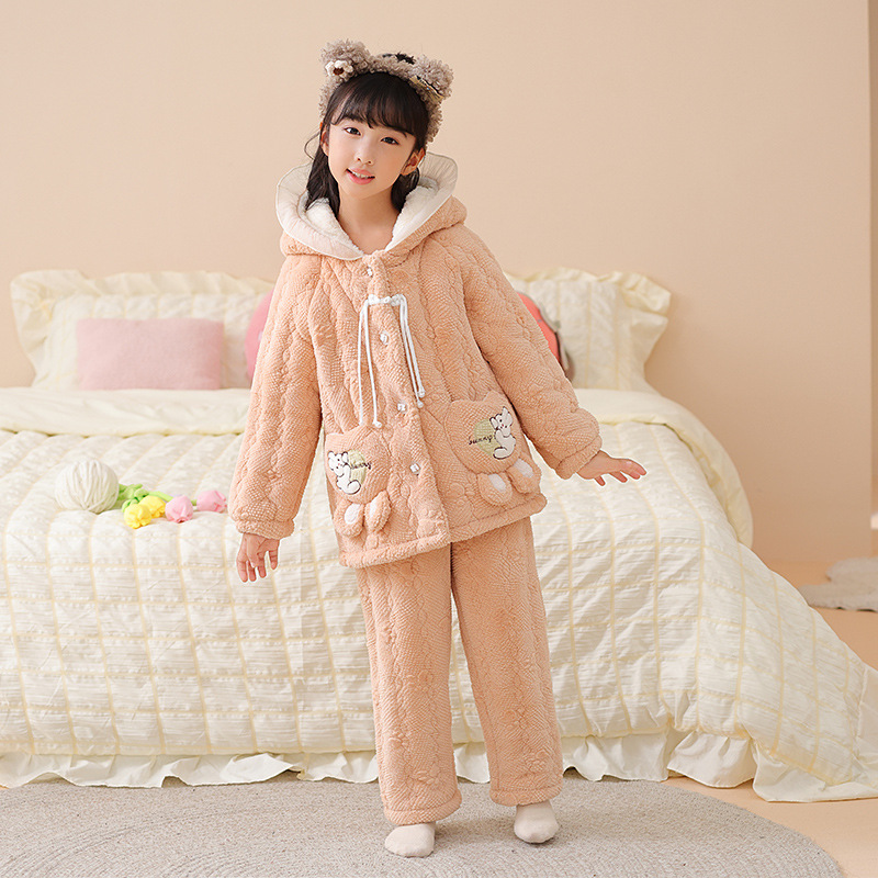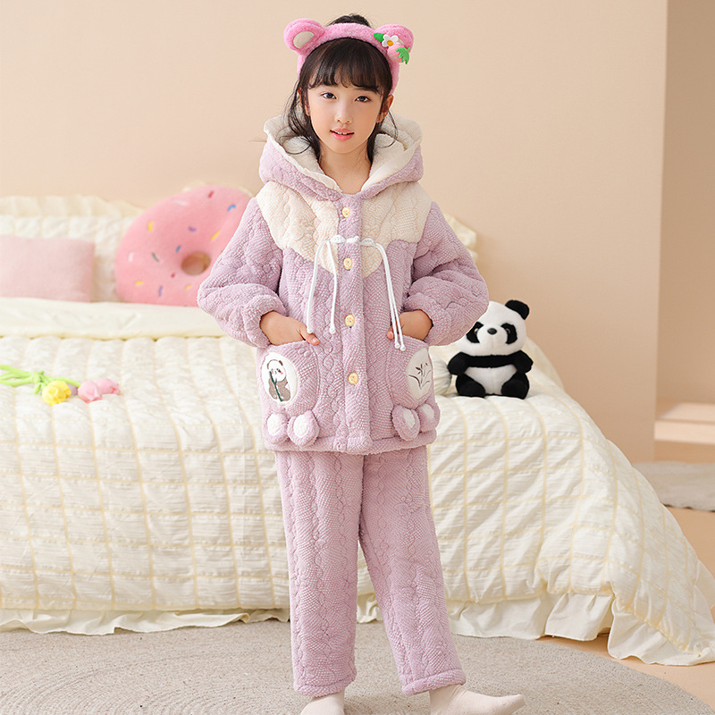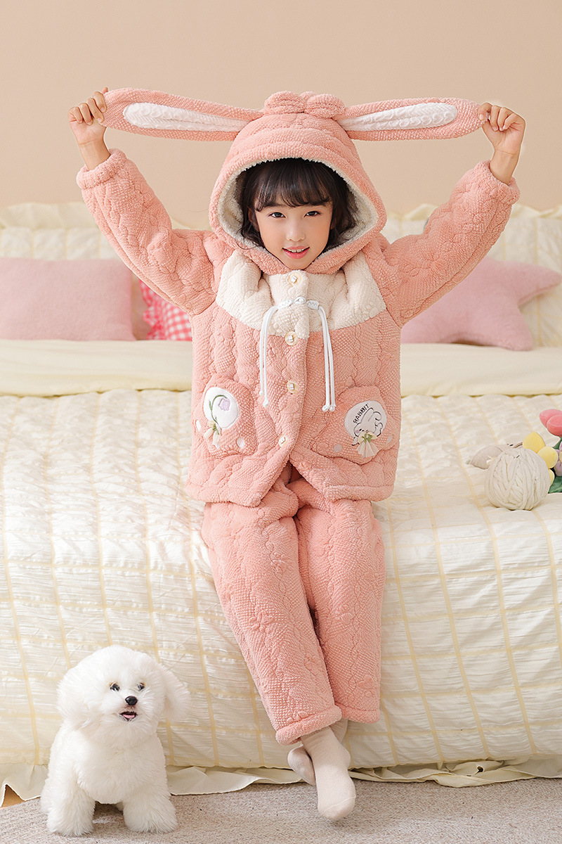 소녀 핑크 3 층 퀼트 겨울 잠옷 큰 어린이 플란넬 패딩 홈 의류 세트