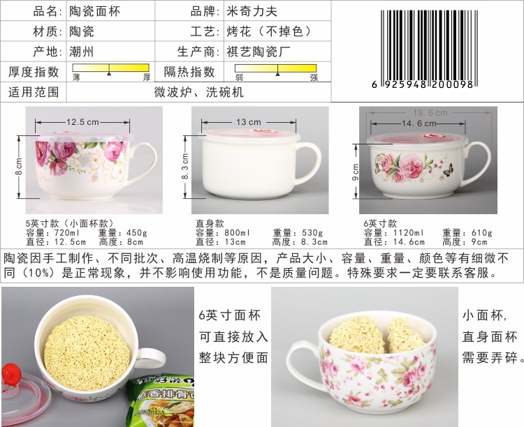 공장 직접 공급 6 인치 전자 레인지 라운드 중국 스타일 세라믹 인스턴트 국수 컵 로고 선물 큰 즉석 국수 그릇스토어 가기