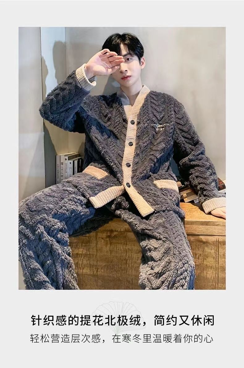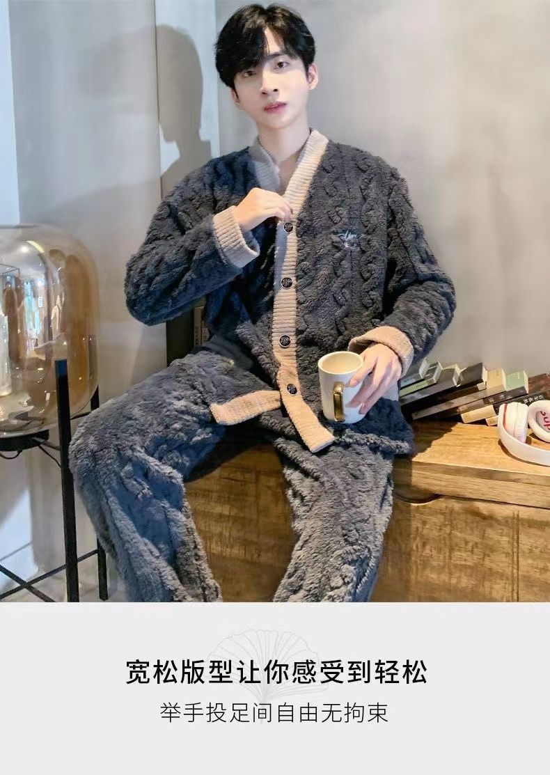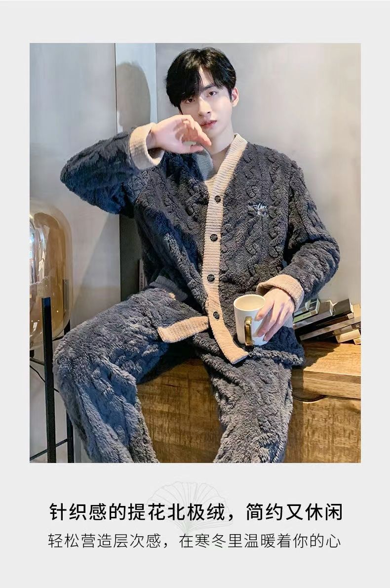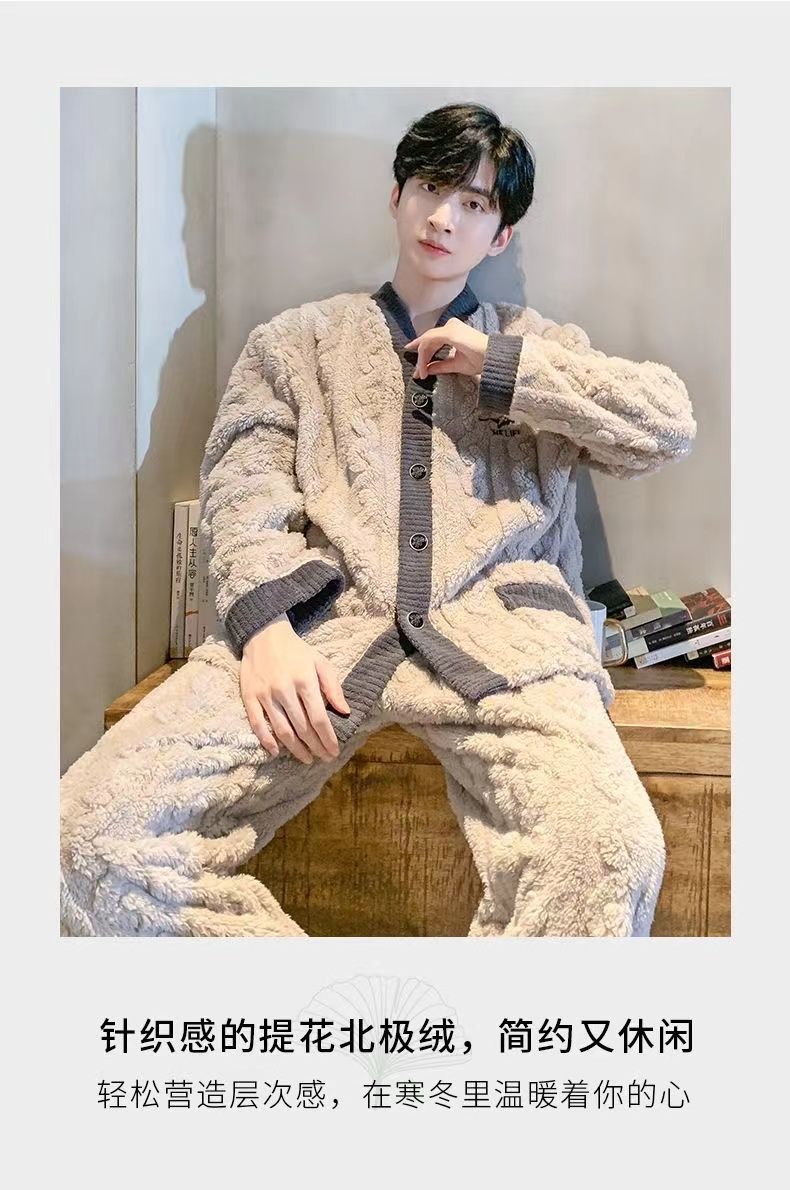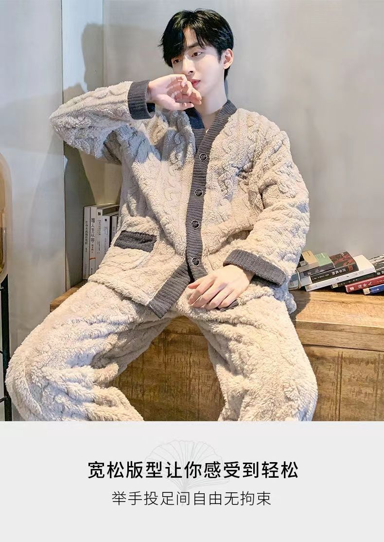 산호 양털 잠옷 남자 가을과 겨울 겨울은 따뜻한 플란넬 겨울 플러스 사이즈 홈 의류 세트 기모 두꺼워졌습니다.스토어 가기