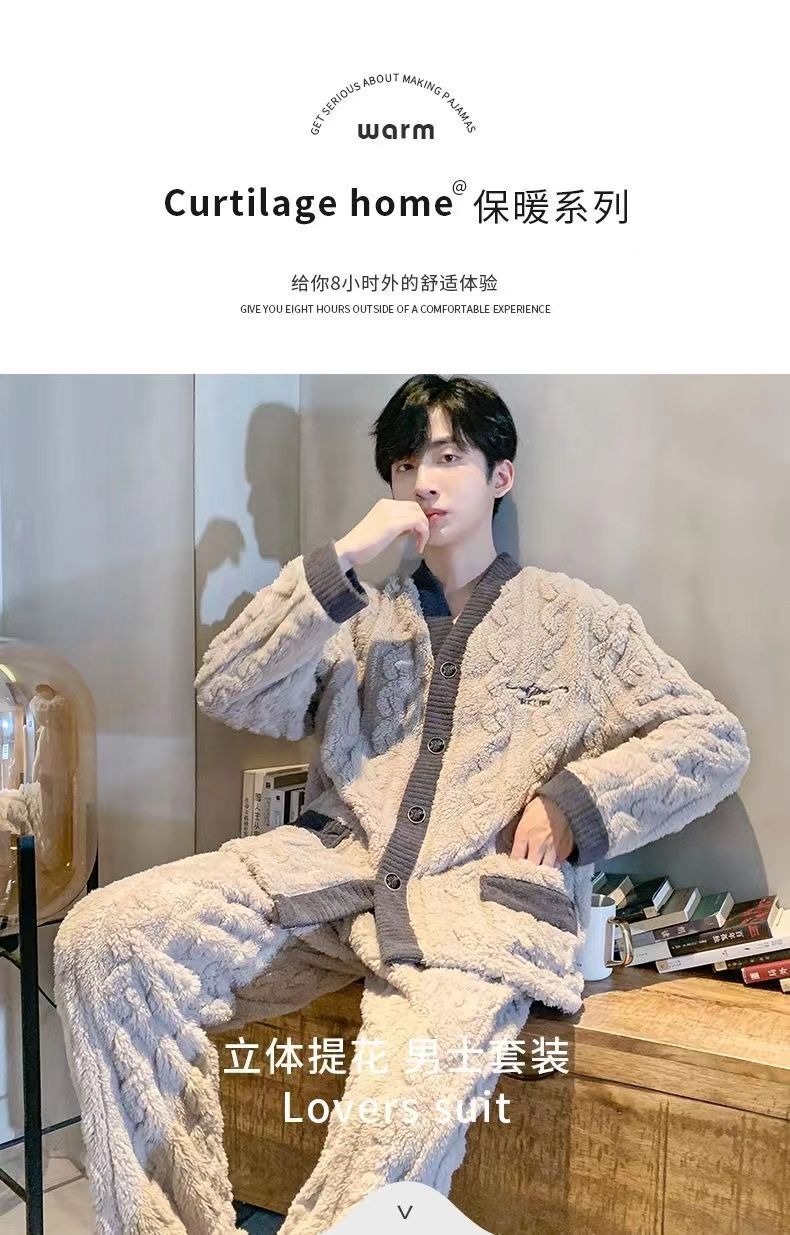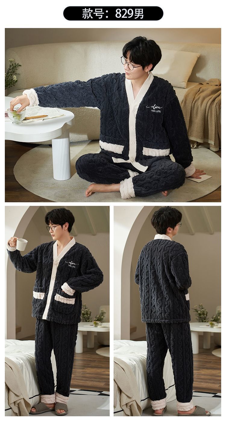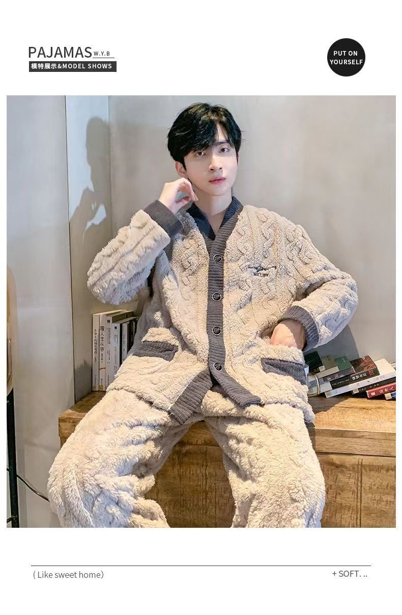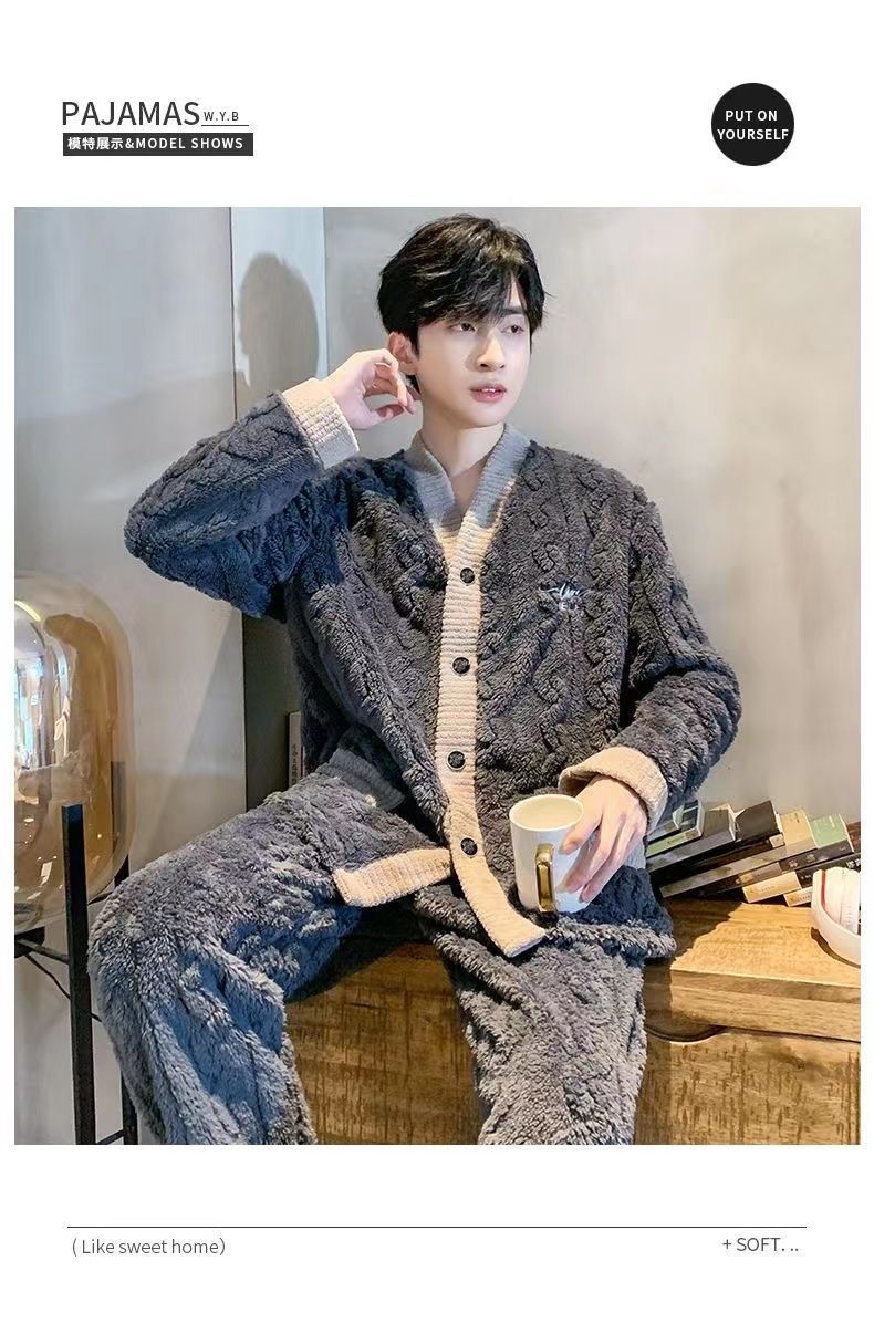 산호 양털 잠옷 남자 가을과 겨울 겨울은 따뜻한 플란넬 겨울 플러스 사이즈 홈 의류 세트 기모 두꺼워졌습니다.스토어 가기