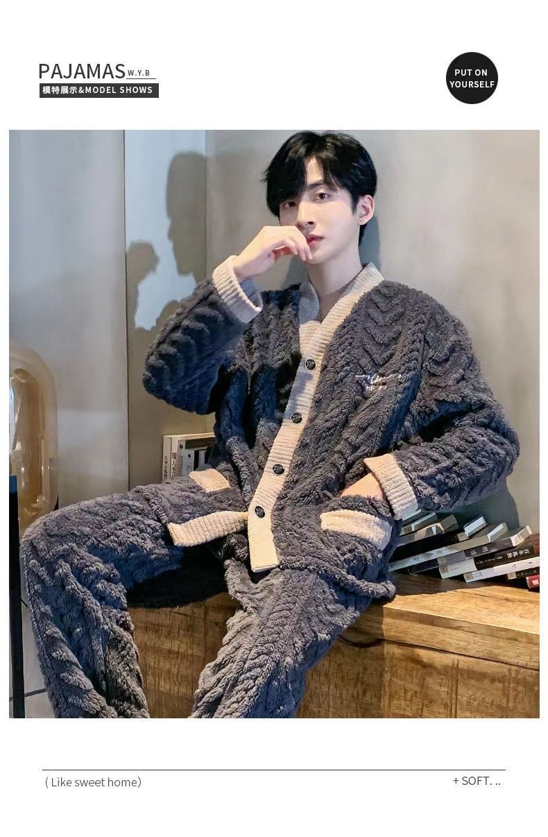 산호 양털 잠옷 남자 가을과 겨울 겨울은 따뜻한 플란넬 겨울 플러스 사이즈 홈 의류 세트 기모 두꺼워졌습니다.