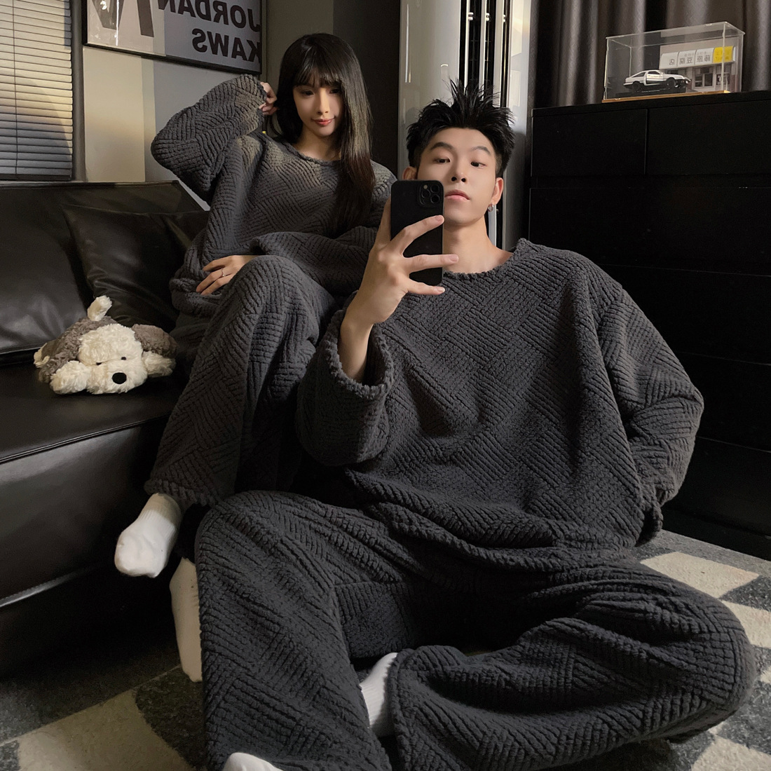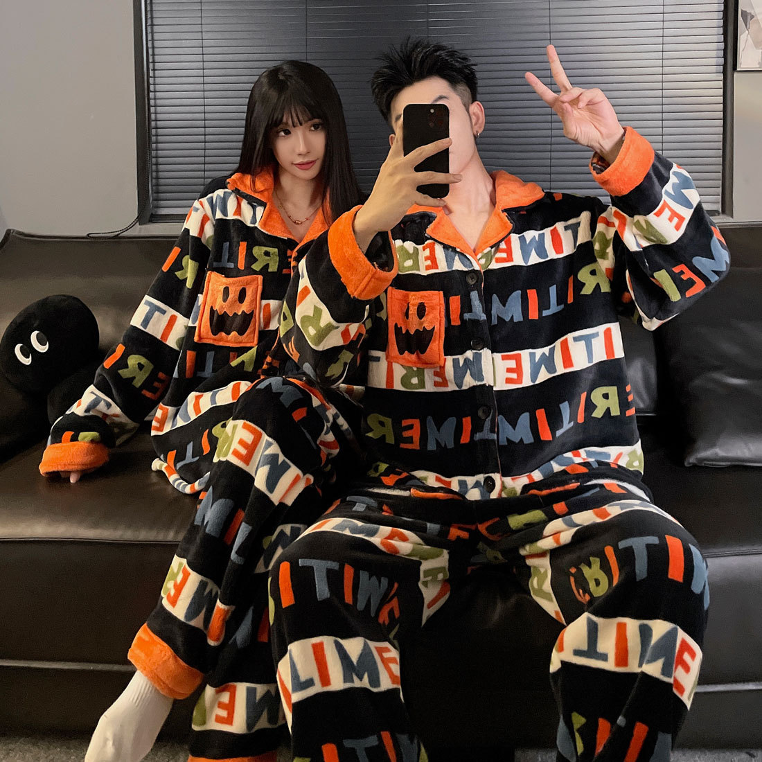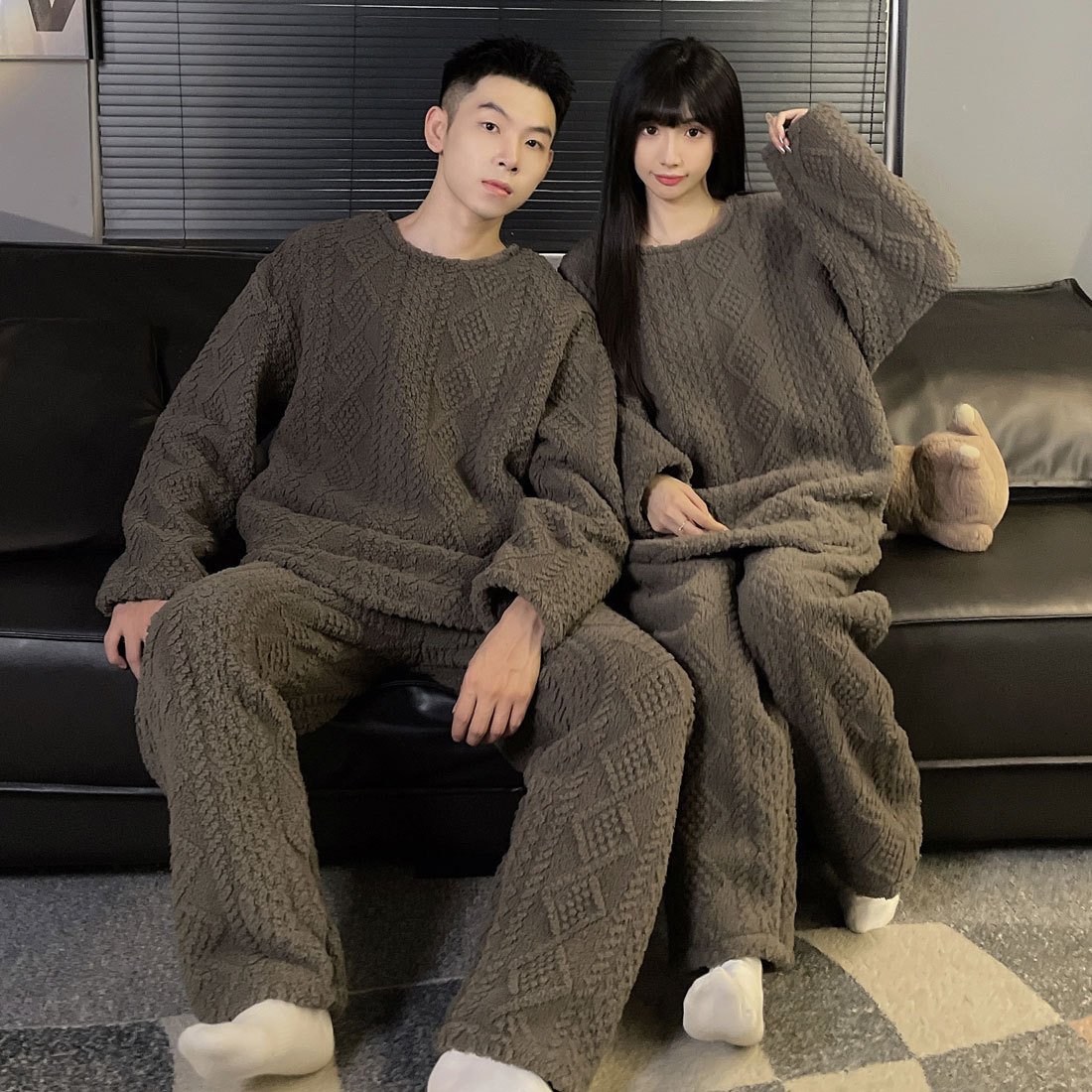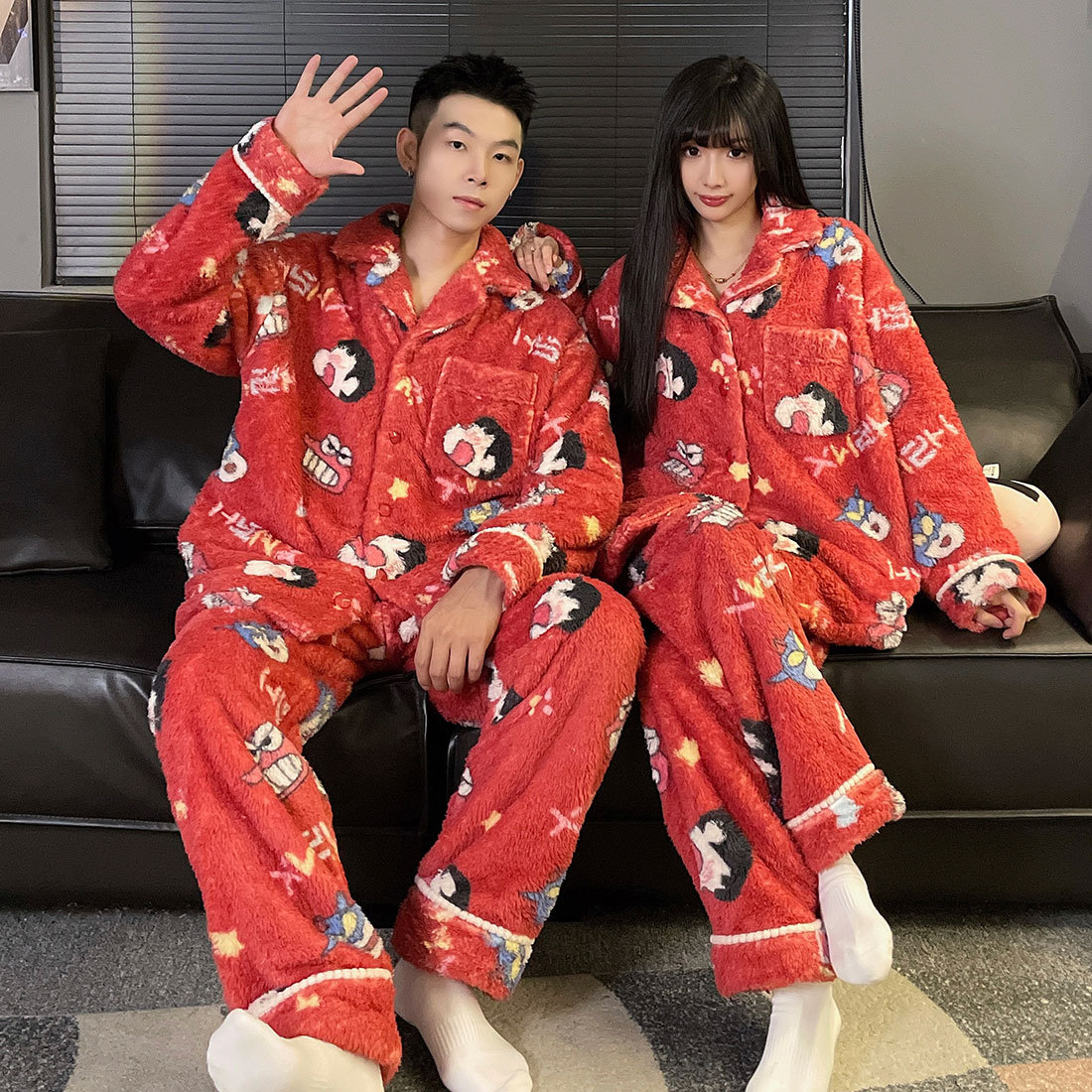 커플 잠옷 여성의 가을과 겨울 산호 양털 기모 두꺼운 카디건 청소년 겨울 따뜻한 남자 홈 옷 세트스토어 가기