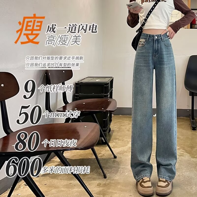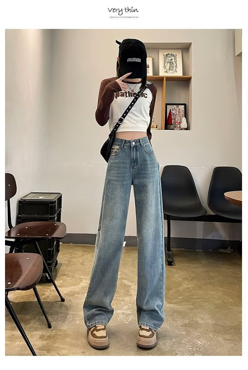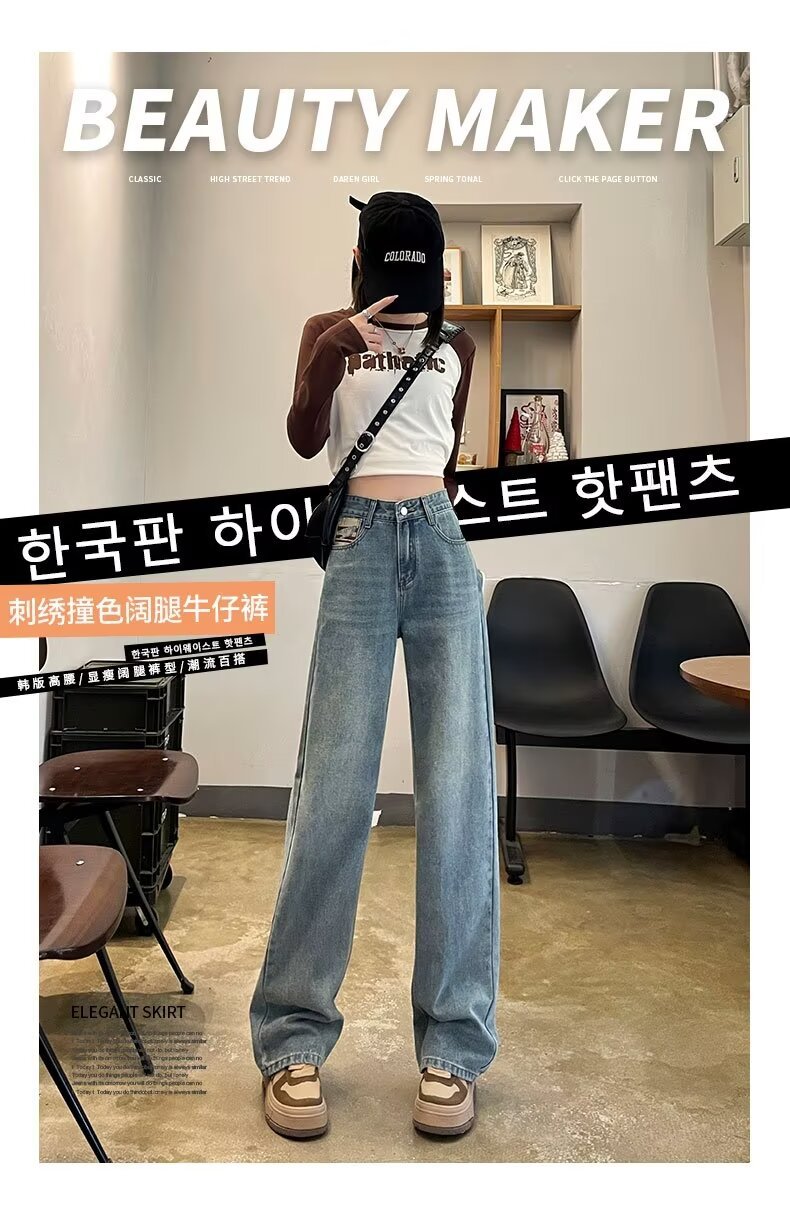 빈티지 자수 청바지 여성 2024 봄과 가을 미국 스타일 높은 허리 느슨한 슬림 넓은 다리 바지 스트레이트 다리 바지스토어 가기